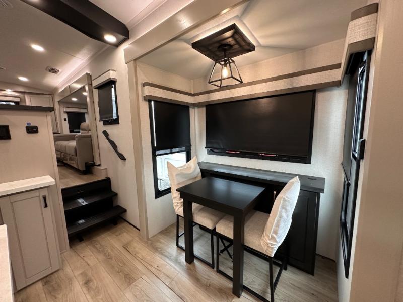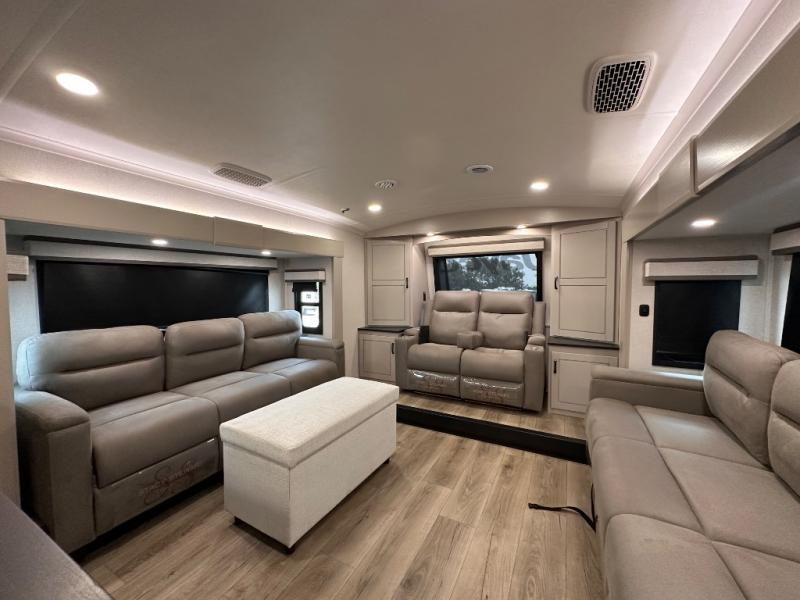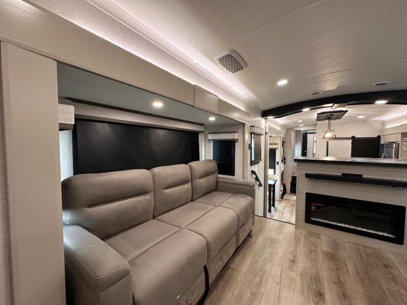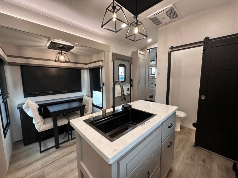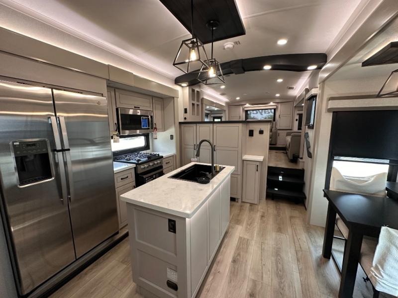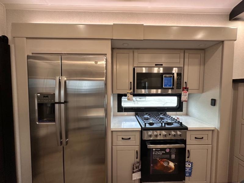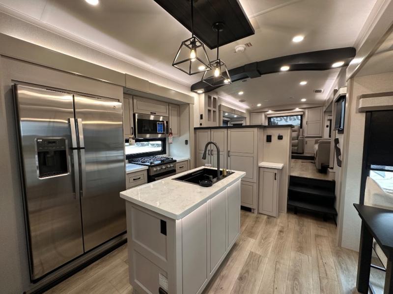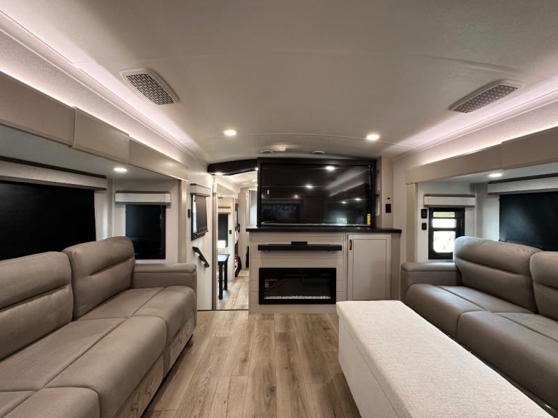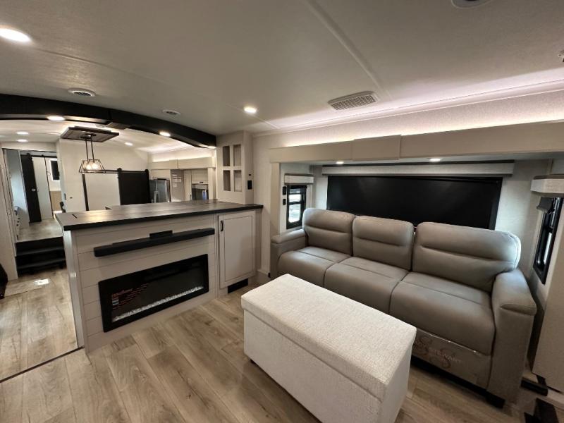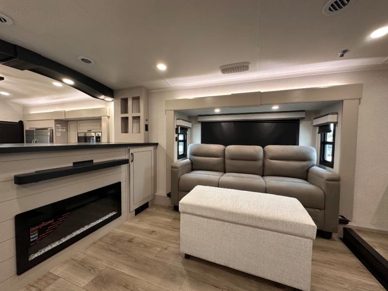 Entertainment can be found throughout this fifth wheel from the front living area with a 50" Smart LED HDTV with fully digital HDMI output and home entertainment system with subwoofer including a fireplace below that you can enjoy while relaxing on theater seats and two tri-fold sofas, a 32" TV in the middle kitchen and there is a bedroom 32" TV. You might even like to add the tailgate TV option along the exterior. Back inside the kitchen, the cook will love the center island, the pantry, the residential refrigerator, and the roll-top dinette. The half bath is a few steps away as an added convenience. The master bedroom includes a king bed slide, a bench, two wardrobes and a sliding door into the bathroom which offers two sinks, a space prepped for a washer/dryer option, and a walk-in shower. And don't forget about the exterior features such as the outside kitchen for more choices when making meals, the storage for your outdoor gear and chairs, and two awnings with integrated LED lighting.