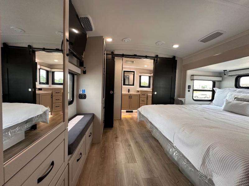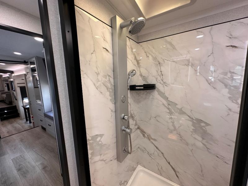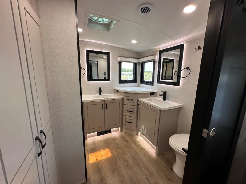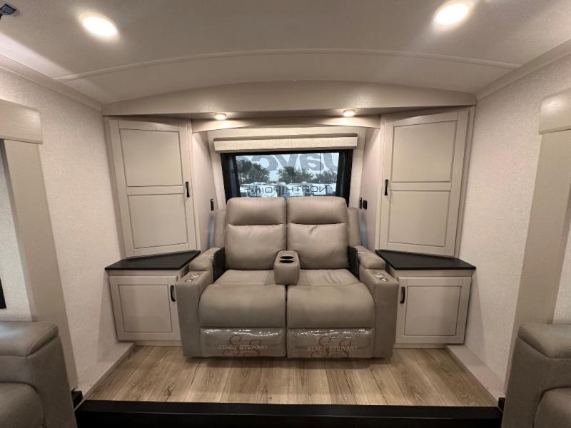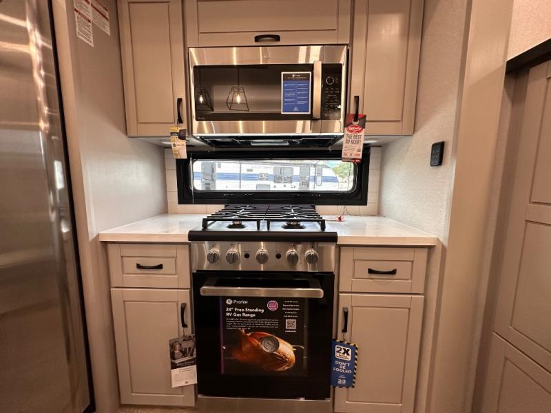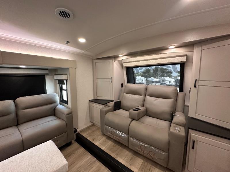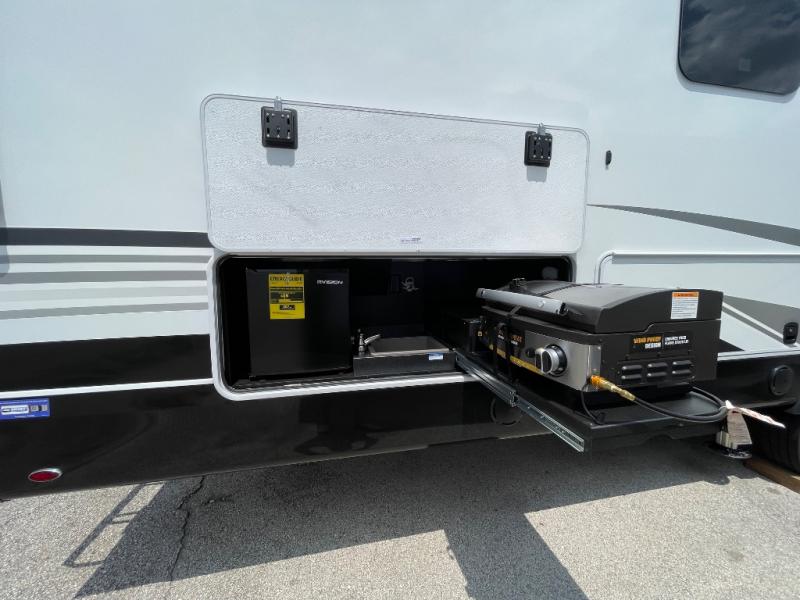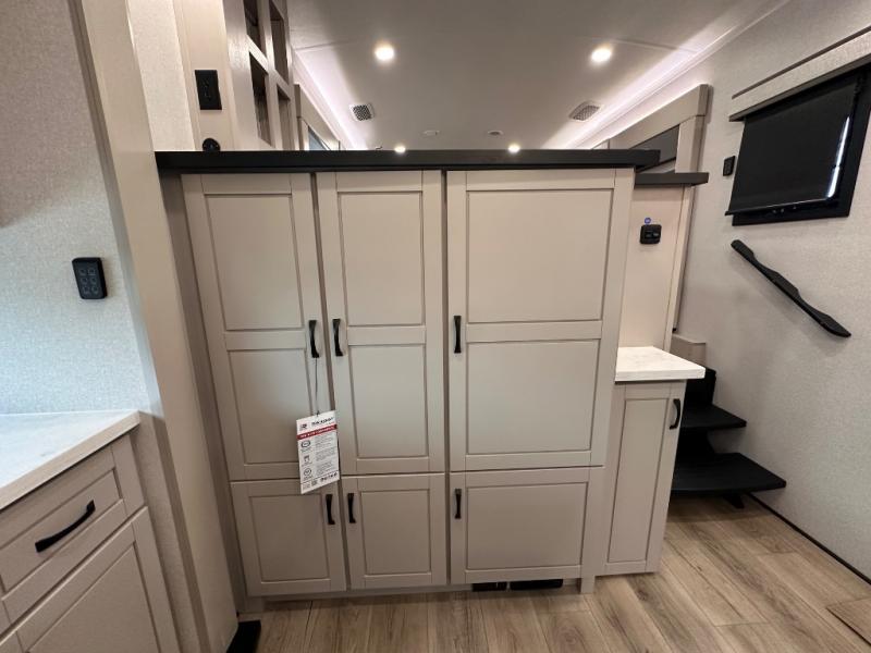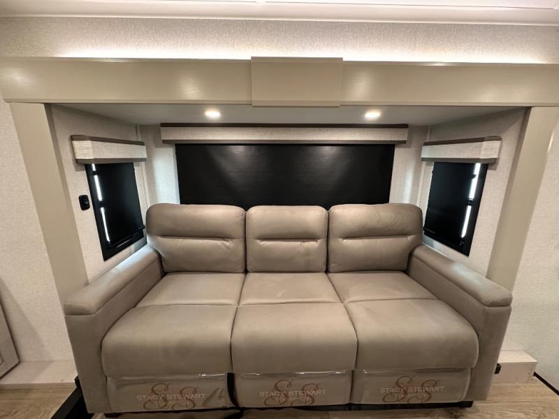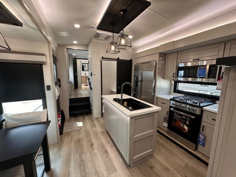 Entertainment can be found throughout this fifth wheel from the front living area with a 50" Smart LED HDTV with fully digital HDMI output and home entertainment system with subwoofer including a fireplace below that you can enjoy while relaxing on theater seats and two tri-fold sofas, a 32" TV in the middle kitchen and there is a bedroom 32" TV. You might even like to add the tailgate TV option along the exterior. Back inside the kitchen, the cook will love the center island, the pantry, the residential refrigerator, and the roll-top dinette. The half bath is a few steps away as an added convenience. The master bedroom includes a king bed slide, a bench, two wardrobes and a sliding door into the bathroom which offers two sinks, a space prepped for a washer/dryer option, and a walk-in shower. And don't forget about the exterior features such as the outside kitchen for more choices when making meals, the storage for your outdoor gear and chairs, and two awnings with integrated LED lighting.
