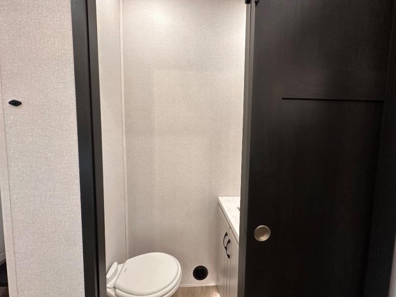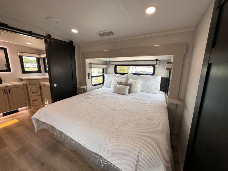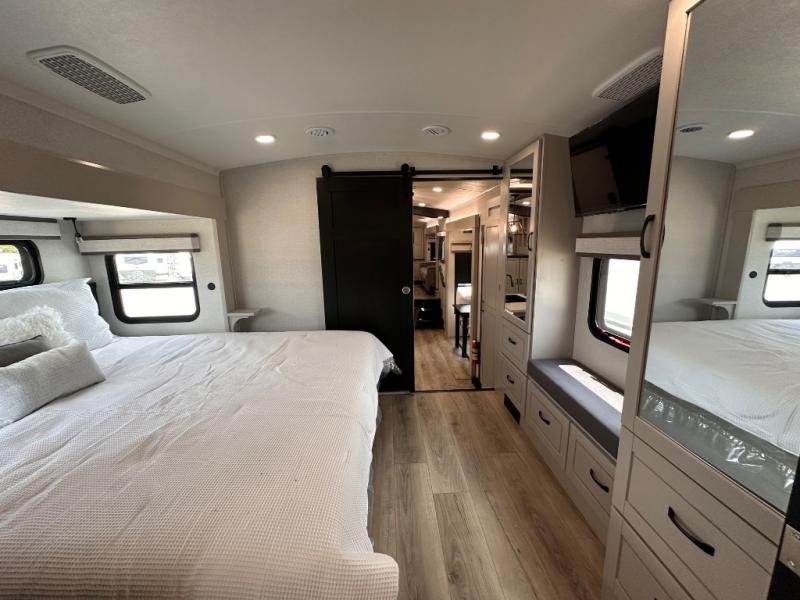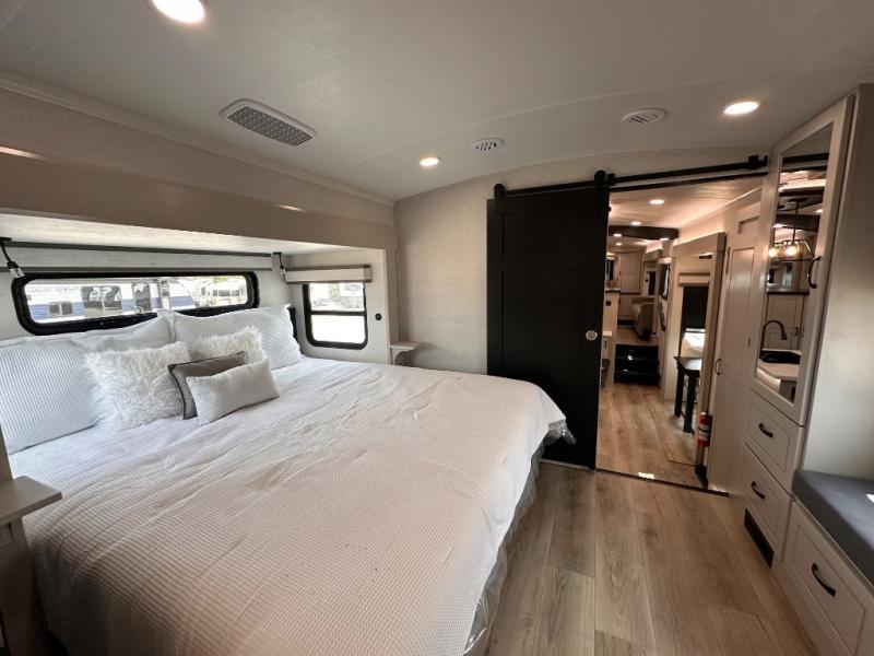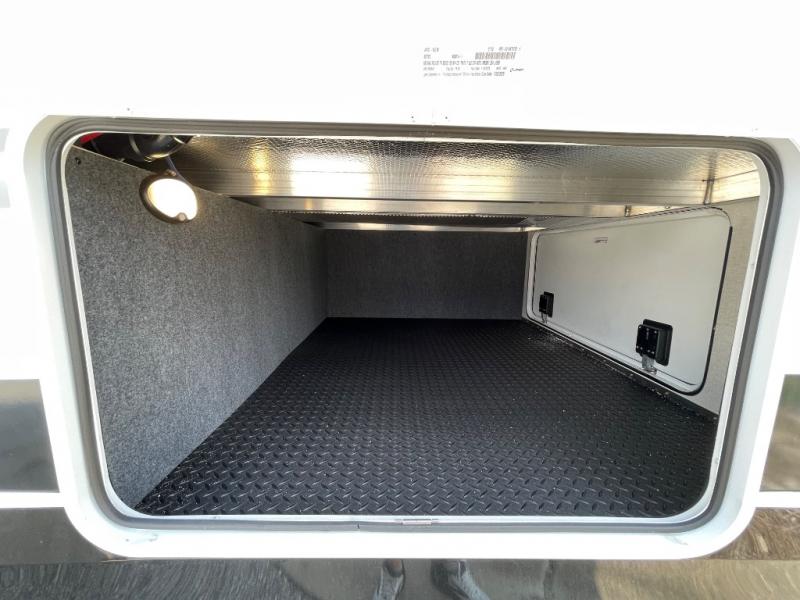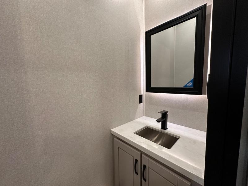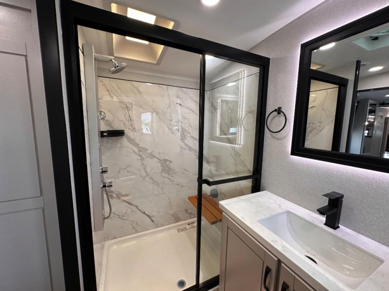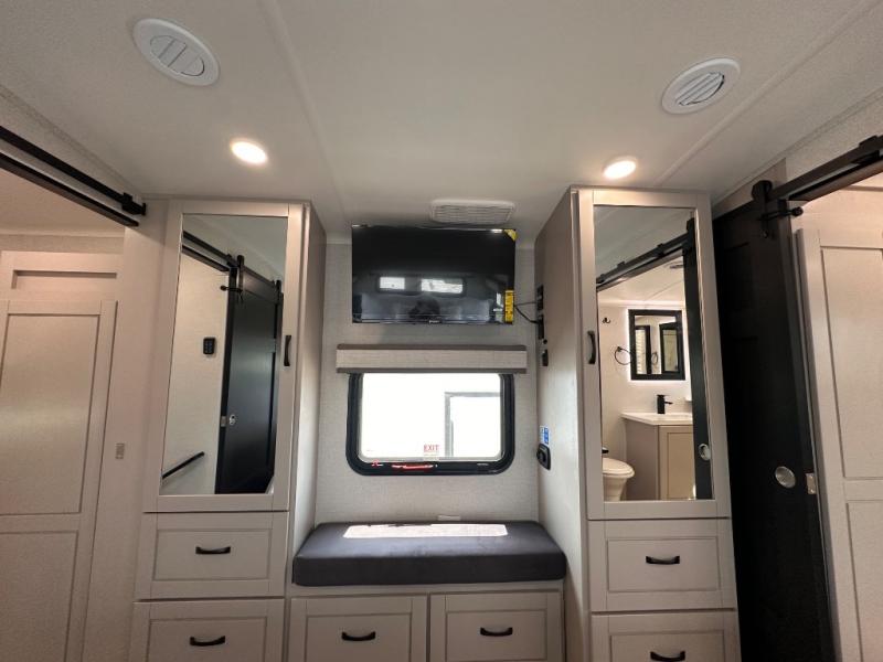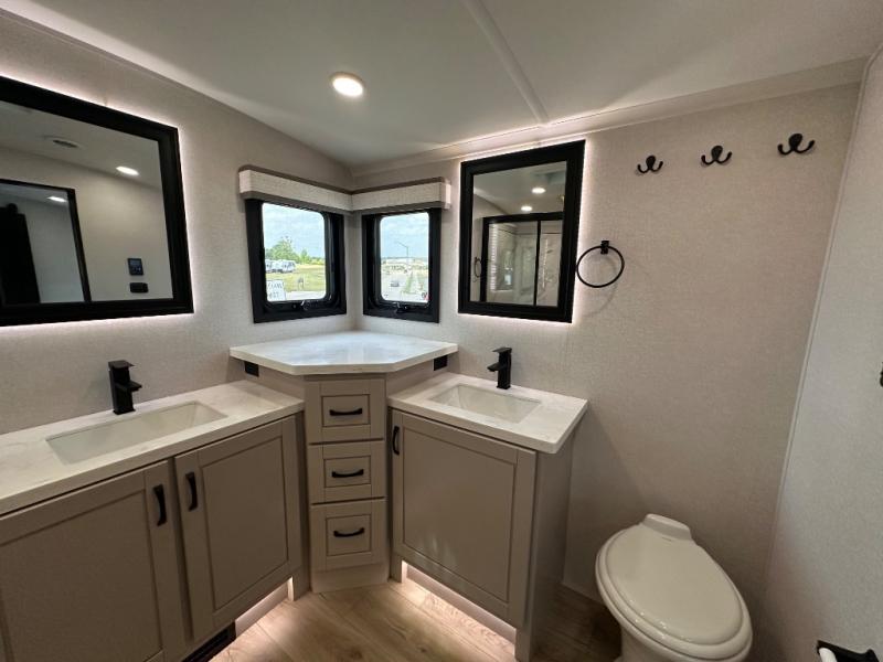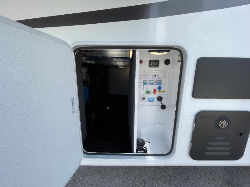 Entertainment can be found throughout this fifth wheel from the front living area with a 50" Smart LED HDTV with fully digital HDMI output and home entertainment system with subwoofer including a fireplace below that you can enjoy while relaxing on theater seats and two tri-fold sofas, a 32" TV in the middle kitchen and there is a bedroom 32" TV. You might even like to add the tailgate TV option along the exterior. Back inside the kitchen, the cook will love the center island, the pantry, the residential refrigerator, and the roll-top dinette. The half bath is a few steps away as an added convenience. The master bedroom includes a king bed slide, a bench, two wardrobes and a sliding door into the bathroom which offers two sinks, a space prepped for a washer/dryer option, and a walk-in shower. And don't forget about the exterior features such as the outside kitchen for more choices when making meals, the storage for your outdoor gear and chairs, and two awnings with integrated LED lighting.