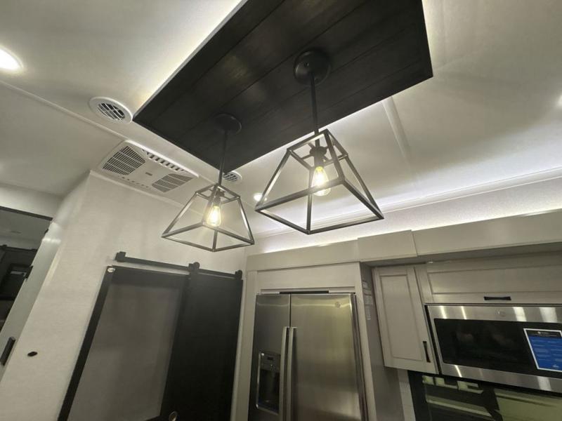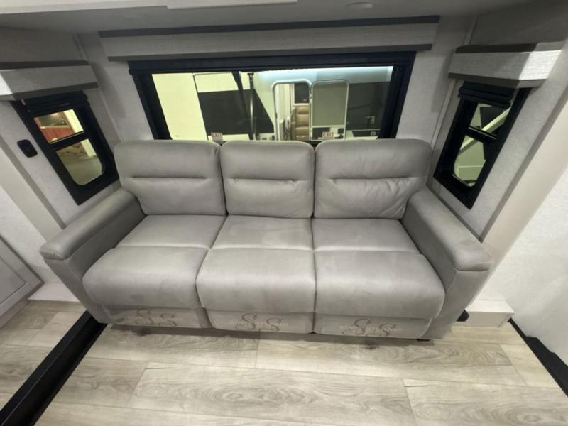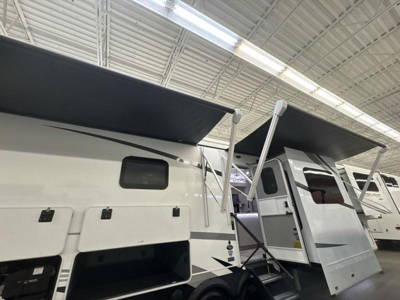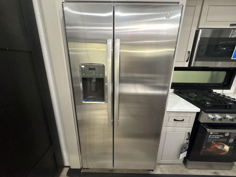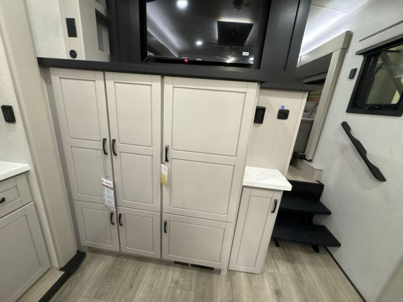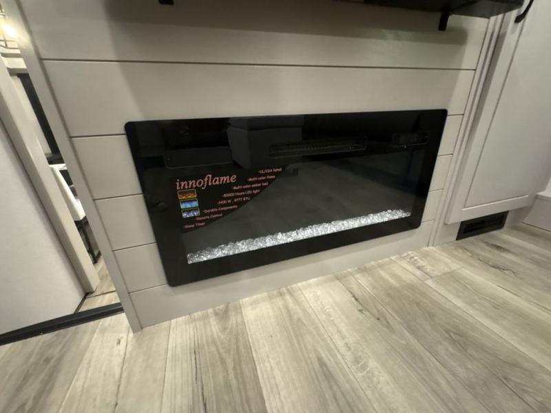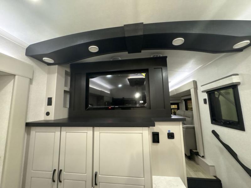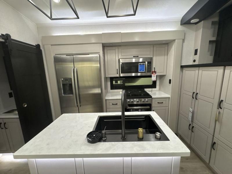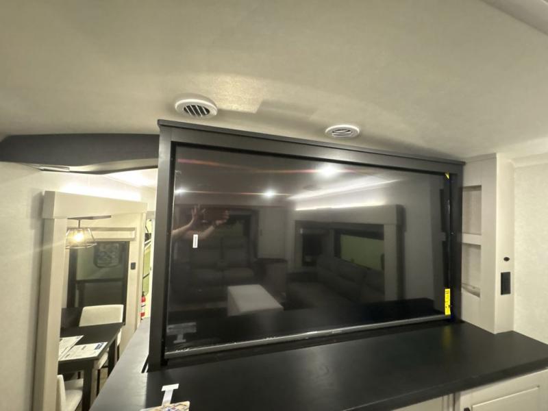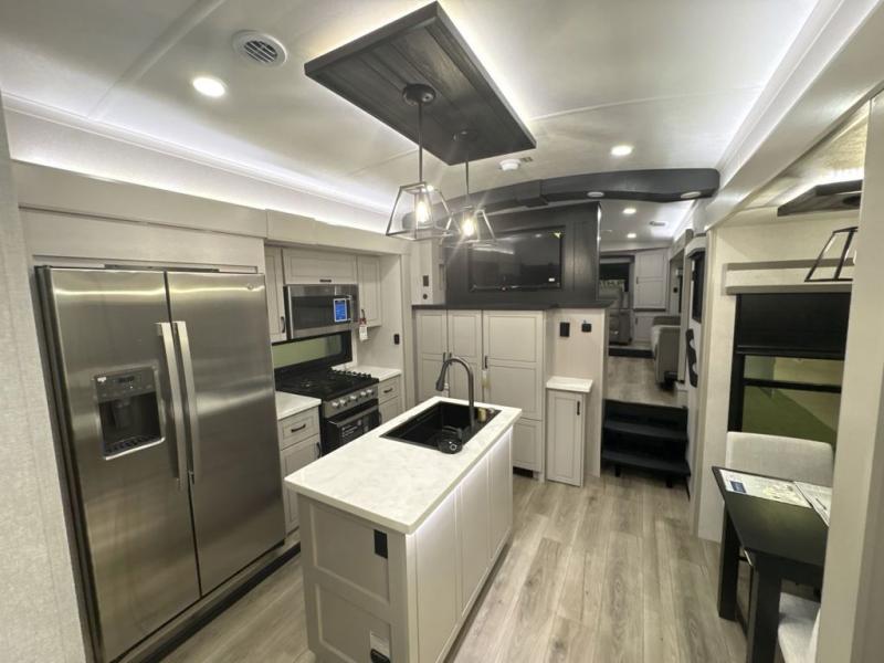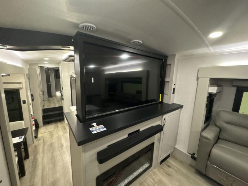 Entertainment can be found throughout this fifth wheel from the front living area with a 50" Smart LED HDTV with fully digital HDMI output and home entertainment system with subwoofer including a fireplace below that you can enjoy while relaxing on theater seats and two tri-fold sofas, a 32" TV in the middle kitchen and there is a bedroom 32" TV. You might even like to add the tailgate TV option along the exterior. Back inside the kitchen, the cook will love the center island, the pantry, the residential refrigerator, and the roll-top dinette. The half bath is a few steps away as an added convenience. The master bedroom includes a king bed slide, a bench, two wardrobes and a sliding door into the bathroom which offers two sinks, a space prepped for a washer/dryer option, and a walk-in shower. And don't forget about the exterior features such as the outside kitchen for more choices when making meals, the storage for your outdoor gear and chairs, and two awnings with integrated LED lighting.