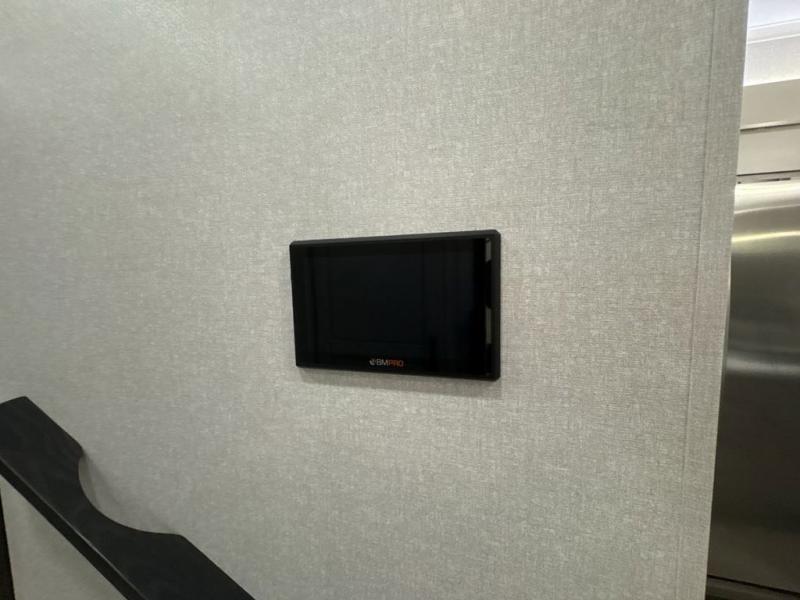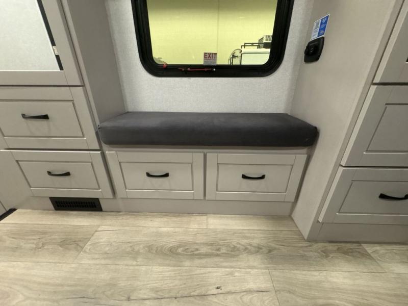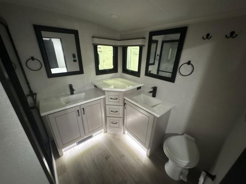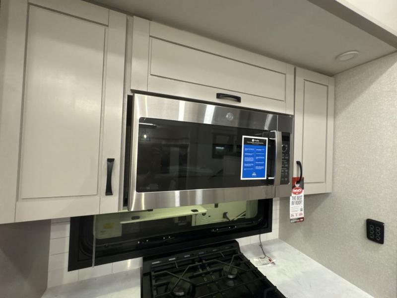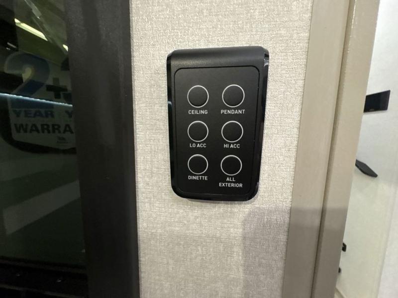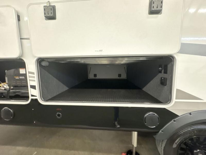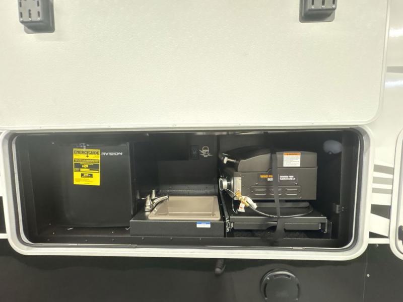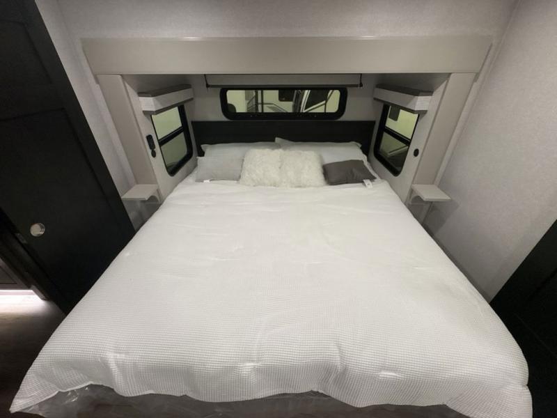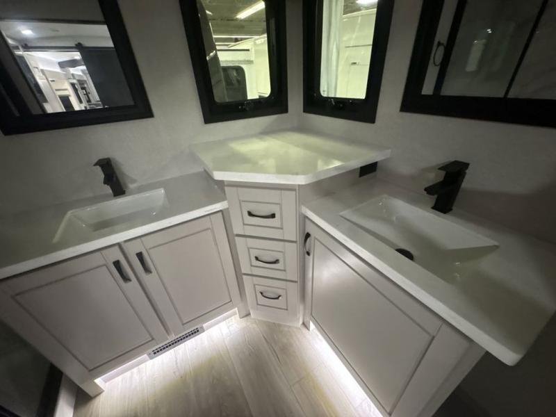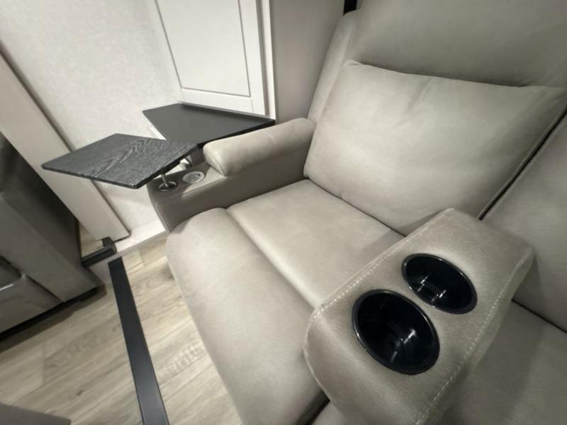 Entertainment can be found throughout this fifth wheel from the front living area with a 50" Smart LED HDTV with fully digital HDMI output and home entertainment system with subwoofer including a fireplace below that you can enjoy while relaxing on theater seats and two tri-fold sofas, a 32" TV in the middle kitchen and there is a bedroom 32" TV. You might even like to add the tailgate TV option along the exterior. Back inside the kitchen, the cook will love the center island, the pantry, the residential refrigerator, and the roll-top dinette. The half bath is a few steps away as an added convenience. The master bedroom includes a king bed slide, a bench, two wardrobes and a sliding door into the bathroom which offers two sinks, a space prepped for a washer/dryer option, and a walk-in shower. And don't forget about the exterior features such as the outside kitchen for more choices when making meals, the storage for your outdoor gear and chairs, and two awnings with integrated LED lighting.