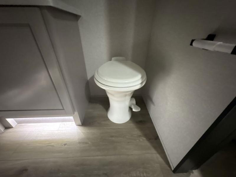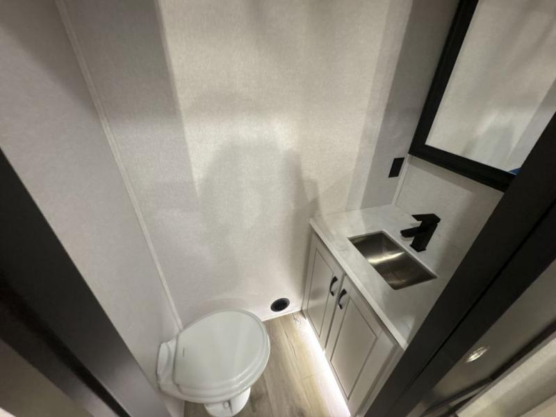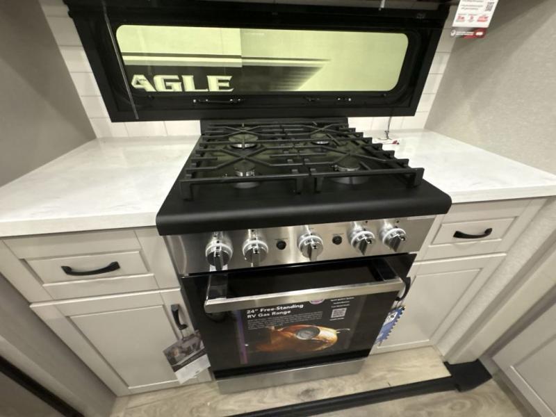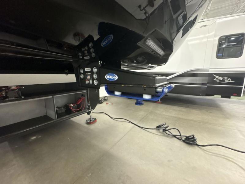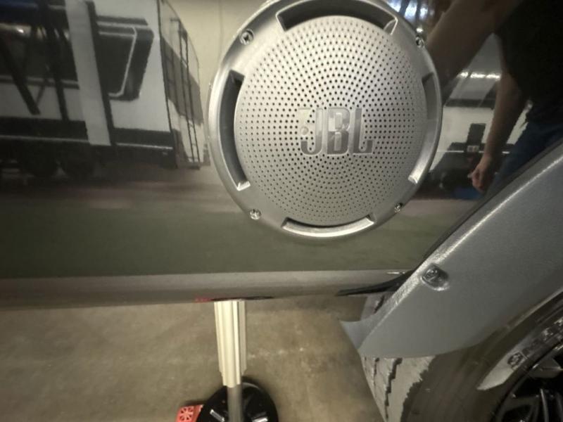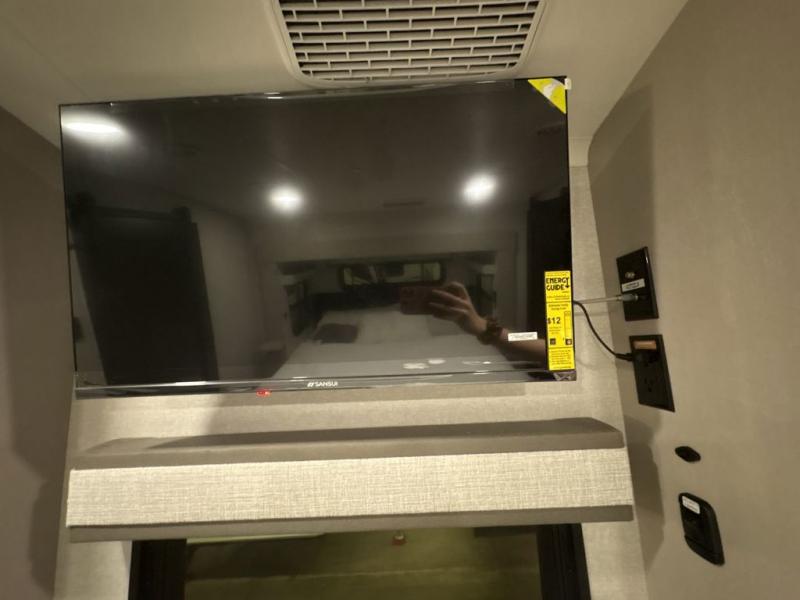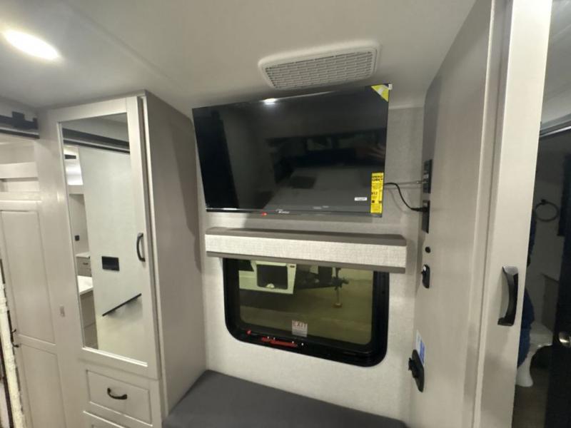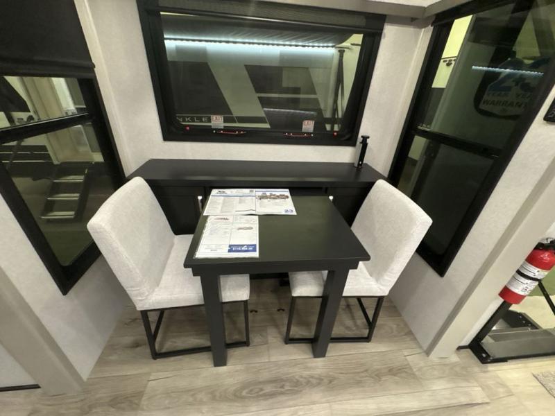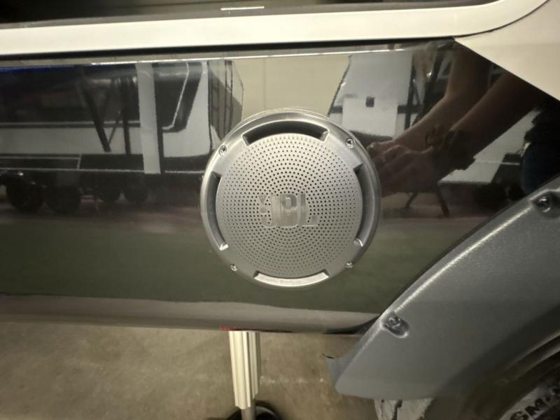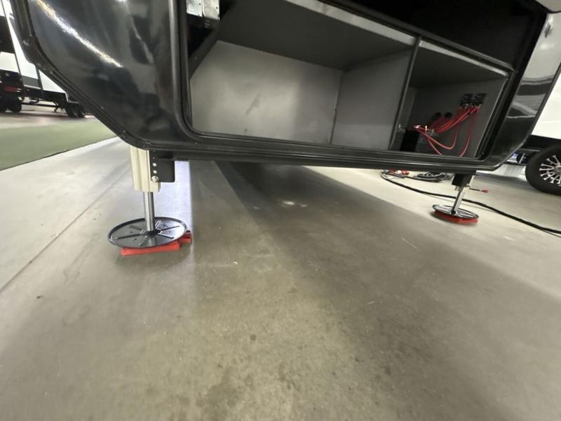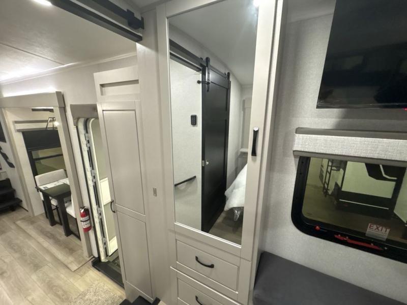Entertainment can be found throughout this fifth wheel from the front living area with a 50" Smart LED HDTV with fully digital HDMI output and home entertainment system with subwoofer including a fireplace below that you can enjoy while relaxing on theater seats and two tri-fold sofas, a 32" TV in the middle kitchen and there is a bedroom 32" TV. You might even like to add the tailgate TV option along the exterior. Back inside the kitchen, the cook will love the center island, the pantry, the residential refrigerator, and the roll-top dinette. The half bath is a few steps away as an added convenience. The master bedroom includes a king bed slide, a bench, two wardrobes and a sliding door into the bathroom which offers two sinks, a space prepped for a washer/dryer option, and a walk-in shower. And don't forget about the exterior features such as the outside kitchen for more choices when making meals, the storage for your outdoor gear and chairs, and two awnings with integrated LED lighting.