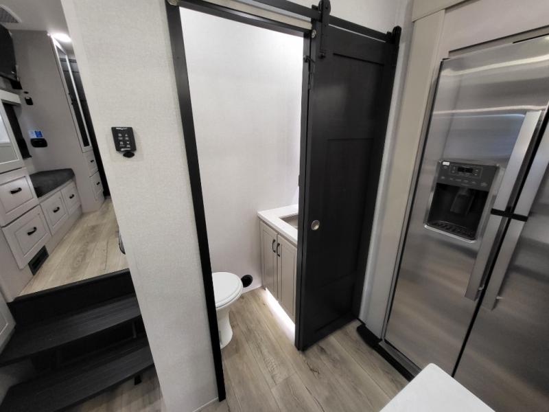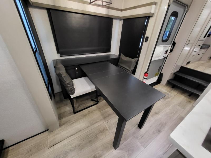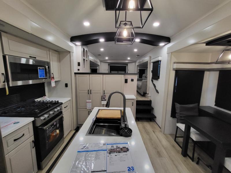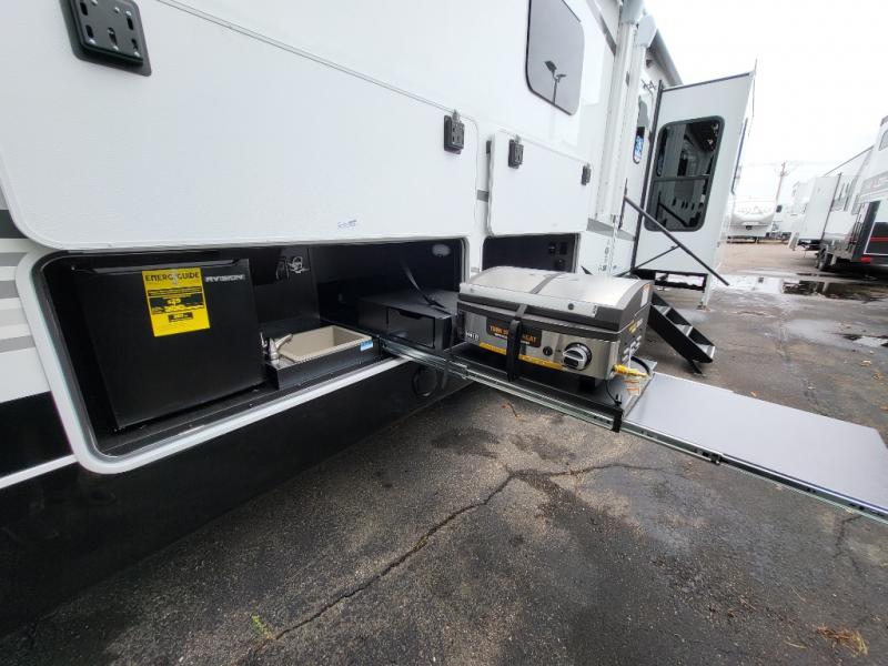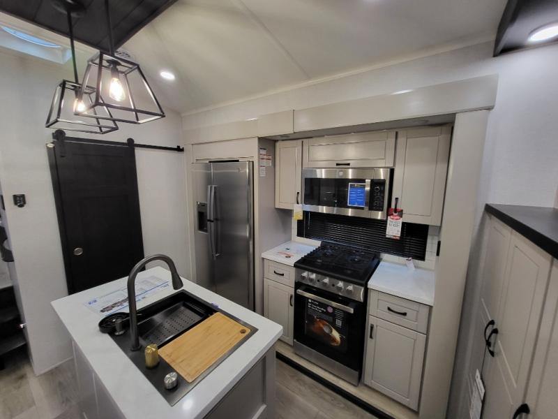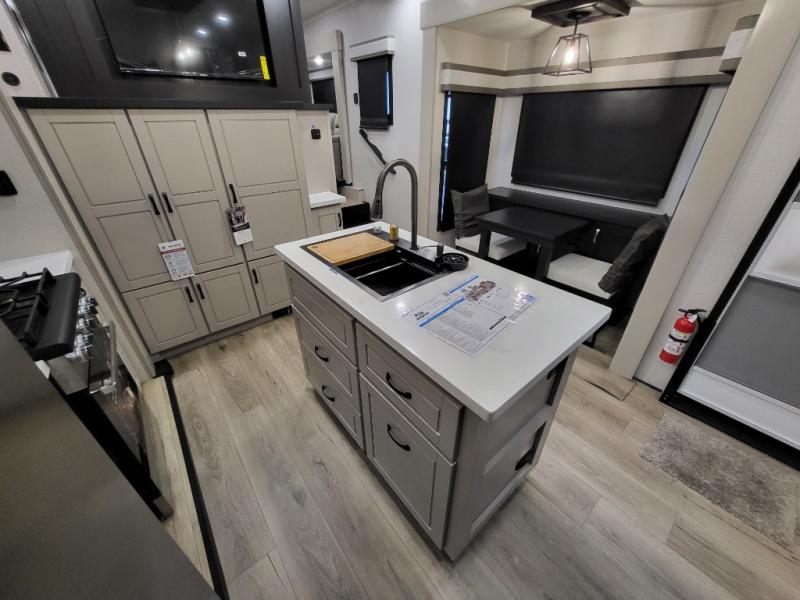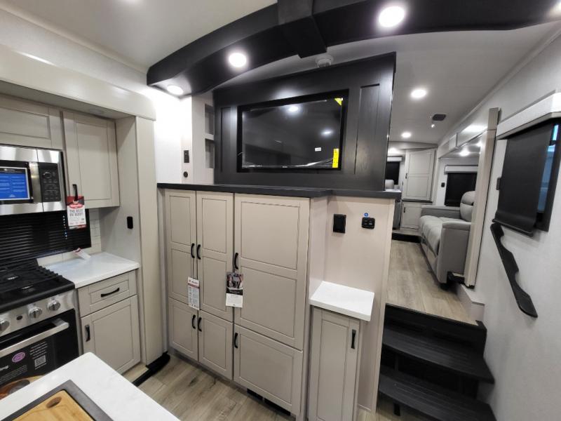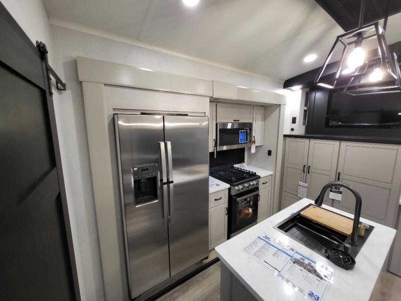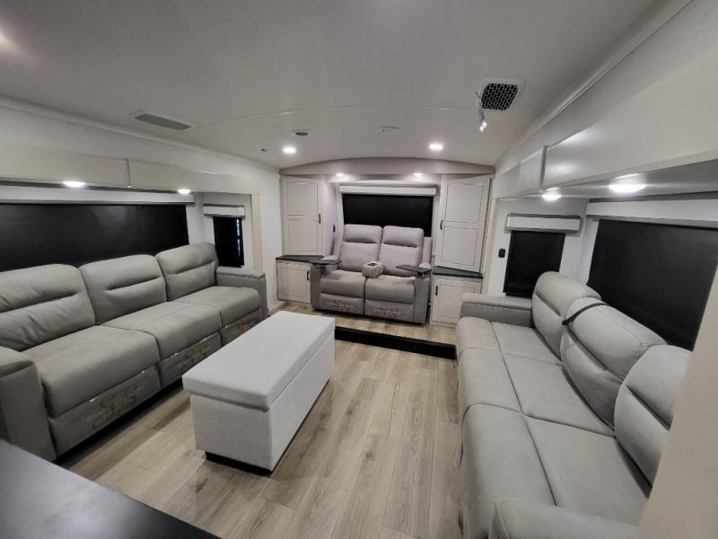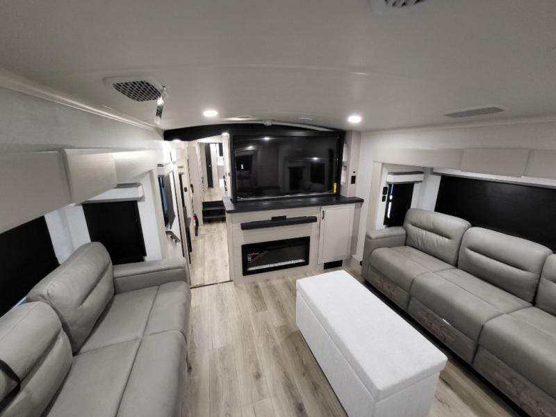 Entertainment can be found throughout this fifth wheel from the front living area with a 50" Smart LED HDTV with fully digital HDMI output and home entertainment system with subwoofer including a fireplace below that you can enjoy while relaxing on theater seats and two tri-fold sofas, a 32" TV in the middle kitchen and there is a bedroom 32" TV. You might even like to add the tailgate TV option along the exterior. Back inside the kitchen, the cook will love the center island, the pantry, the residential refrigerator, and the roll-top dinette. The half bath is a few steps away as an added convenience. The master bedroom includes a king bed slide, a bench, two wardrobes and a sliding door into the bathroom which offers two sinks, a space prepped for a washer/dryer option, and a walk-in shower. And don't forget about the exterior features such as the outside kitchen for more choices when making meals, the storage for your outdoor gear and chairs, and two awnings with integrated LED lighting.