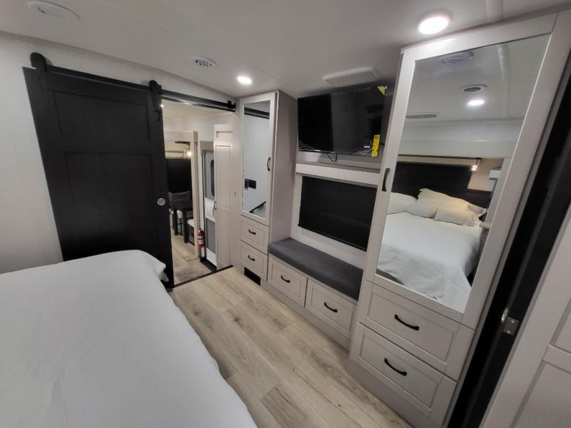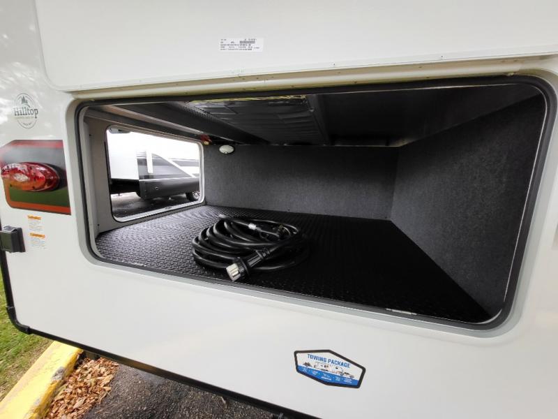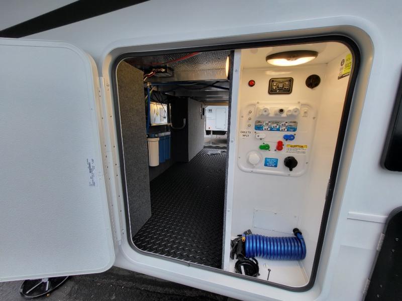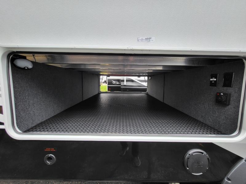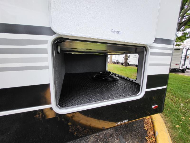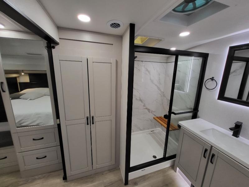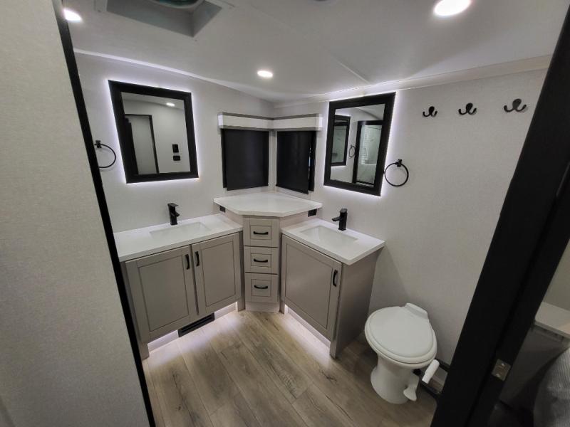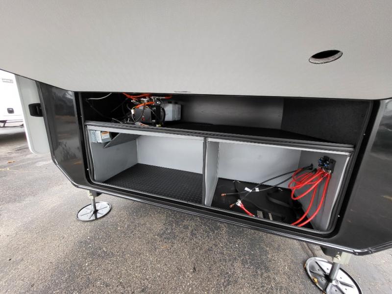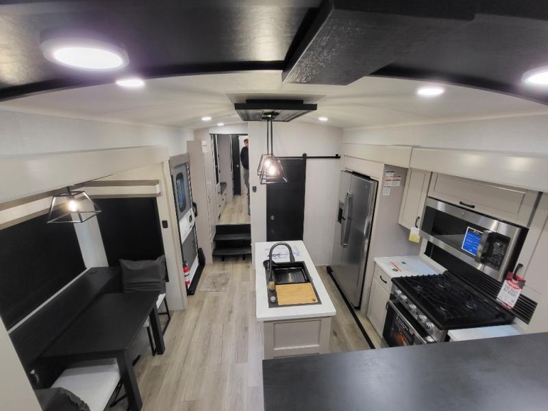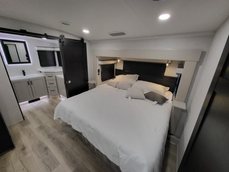 Entertainment can be found throughout this fifth wheel from the front living area with a 50" Smart LED HDTV with fully digital HDMI output and home entertainment system with subwoofer including a fireplace below that you can enjoy while relaxing on theater seats and two tri-fold sofas, a 32" TV in the middle kitchen and there is a bedroom 32" TV. You might even like to add the tailgate TV option along the exterior. Back inside the kitchen, the cook will love the center island, the pantry, the residential refrigerator, and the roll-top dinette. The half bath is a few steps away as an added convenience. The master bedroom includes a king bed slide, a bench, two wardrobes and a sliding door into the bathroom which offers two sinks, a space prepped for a washer/dryer option, and a walk-in shower. And don't forget about the exterior features such as the outside kitchen for more choices when making meals, the storage for your outdoor gear and chairs, and two awnings with integrated LED lighting.