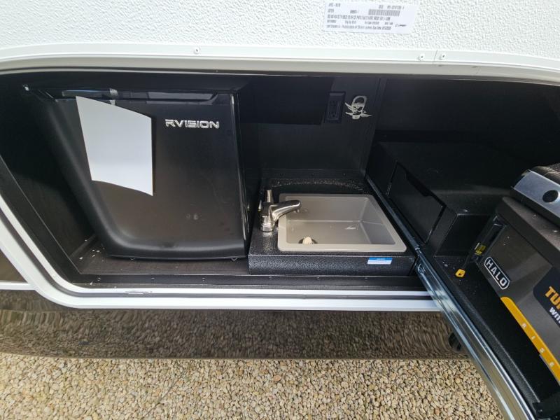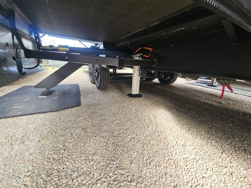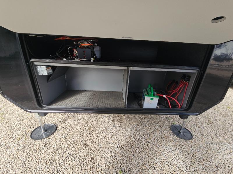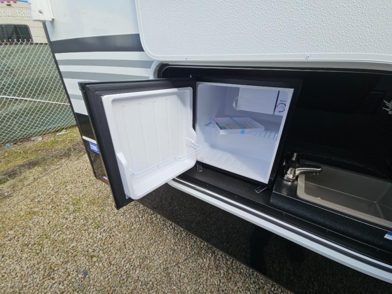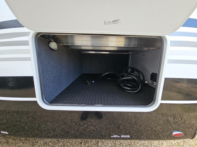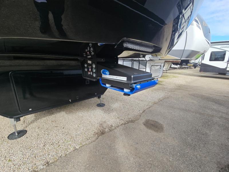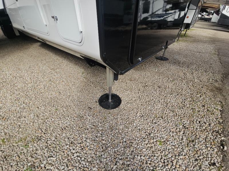 Entertainment can be found throughout this fifth wheel from the front living area with a 50" Smart LED HDTV with fully digital HDMI output and home entertainment system with subwoofer including a fireplace below that you can enjoy while relaxing on theater seats and two tri-fold sofas, a 32" TV in the middle kitchen and there is a bedroom 32" TV. You might even like to add the tailgate TV option along the exterior. Back inside the kitchen, the cook will love the center island, the pantry, the residential refrigerator, and the roll-top dinette. The half bath is a few steps away as an added convenience. The master bedroom includes a king bed slide, a bench, two wardrobes and a sliding door into the bathroom which offers two sinks, a space prepped for a washer/dryer option, and a walk-in shower. And don't forget about the exterior features such as the outside kitchen for more choices when making meals, the storage for your outdoor gear and chairs, and two awnings with integrated LED lighting.