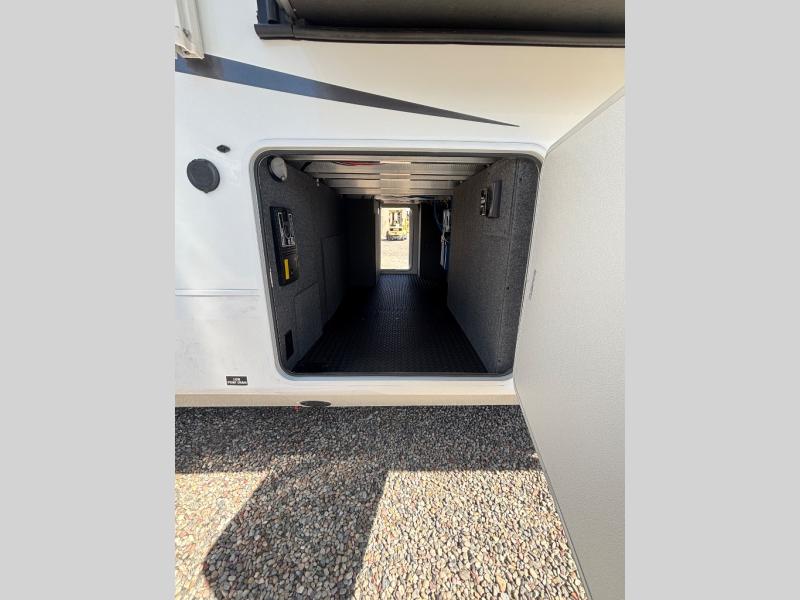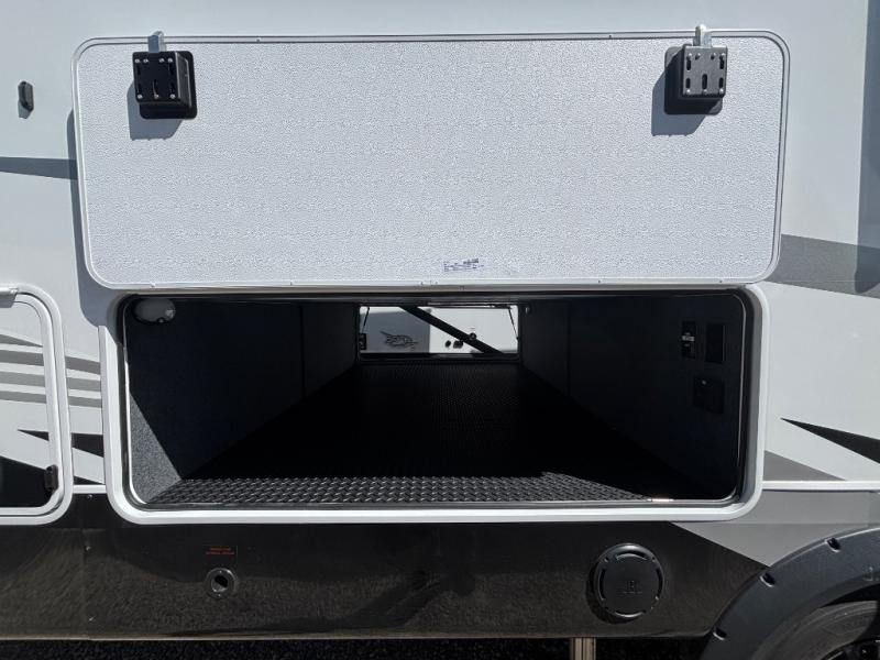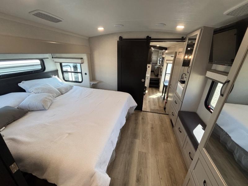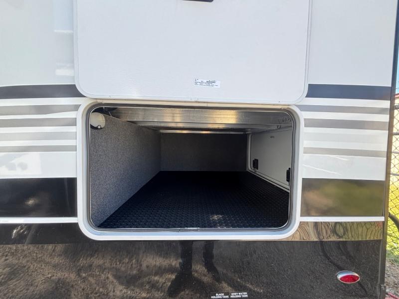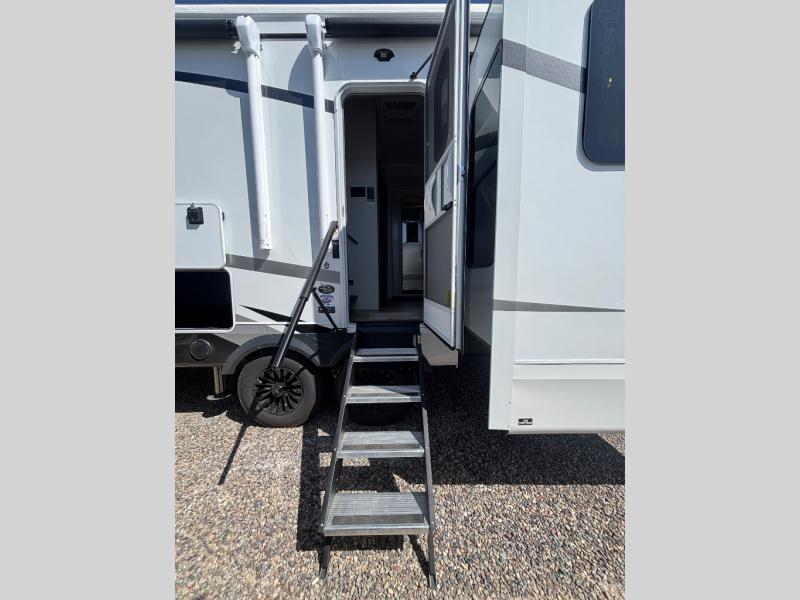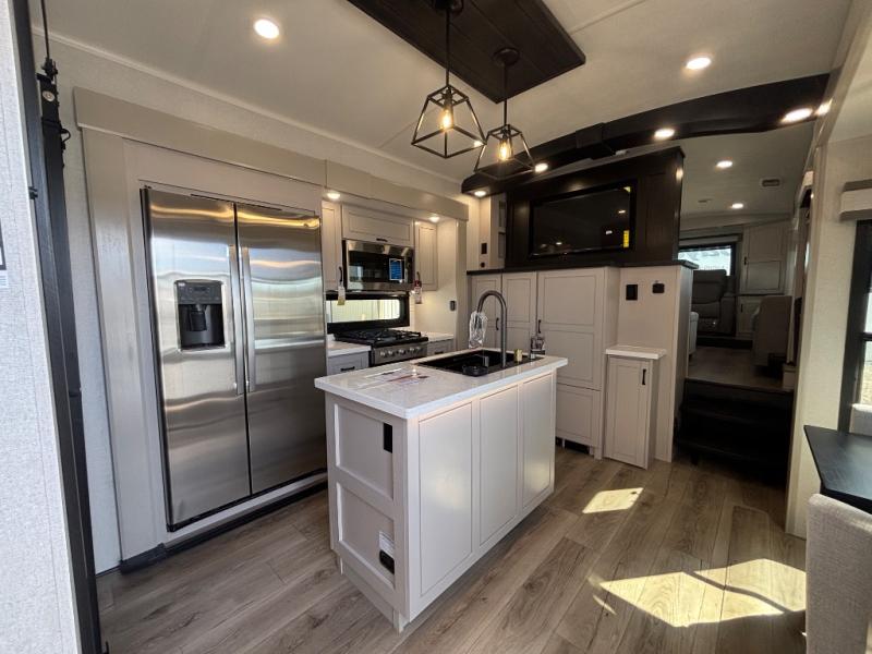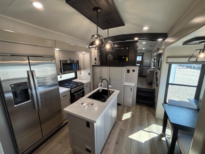 Entertainment can be found throughout this fifth wheel from the front living area with a 50" Smart LED HDTV with fully digital HDMI output and home entertainment system with subwoofer including a fireplace below that you can enjoy while relaxing on theater seats and two tri-fold sofas, a 32" TV in the middle kitchen and there is a bedroom 32" TV. You might even like to add the tailgate TV option along the exterior. Back inside the kitchen, the cook will love the center island, the pantry, the residential refrigerator, and the roll-top dinette. The half bath is a few steps away as an added convenience. The master bedroom includes a king bed slide, a bench, two wardrobes and a sliding door into the bathroom which offers two sinks, a space prepped for a washer/dryer option, and a walk-in shower. And don't forget about the exterior features such as the outside kitchen for more choices when making meals, the storage for your outdoor gear and chairs, and two awnings with integrated LED lighting.