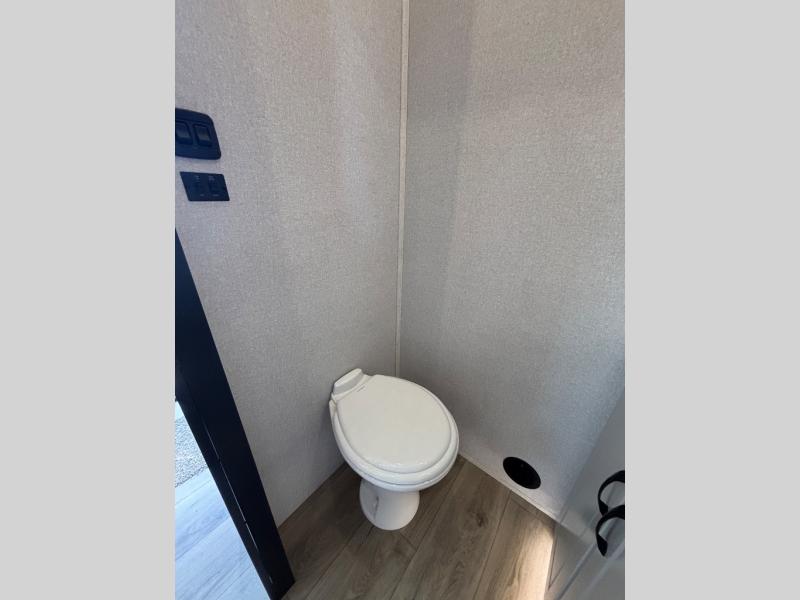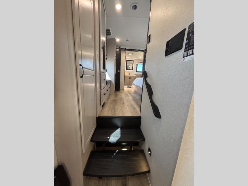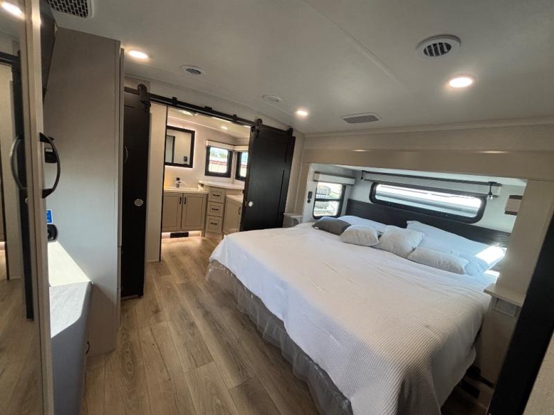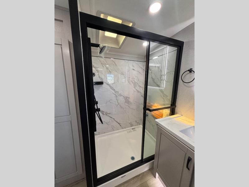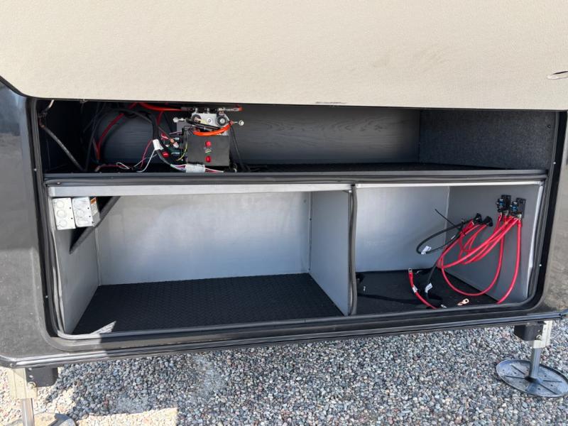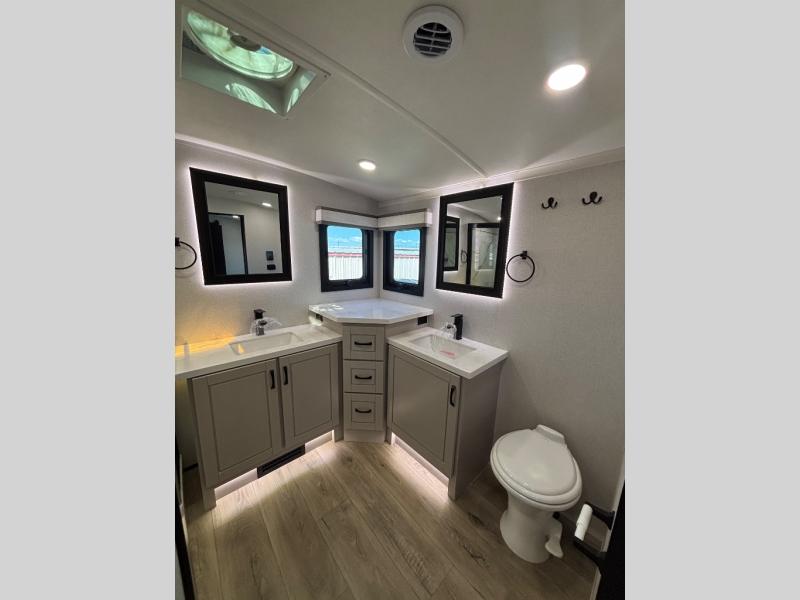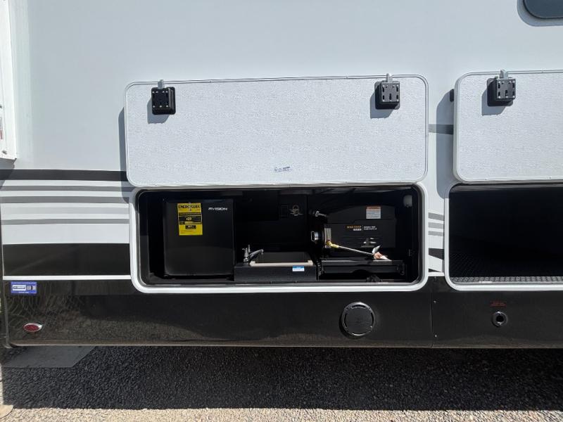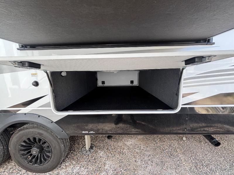 Entertainment can be found throughout this fifth wheel from the front living area with a 50" Smart LED HDTV with fully digital HDMI output and home entertainment system with subwoofer including a fireplace below that you can enjoy while relaxing on theater seats and two tri-fold sofas, a 32" TV in the middle kitchen and there is a bedroom 32" TV. You might even like to add the tailgate TV option along the exterior. Back inside the kitchen, the cook will love the center island, the pantry, the residential refrigerator, and the roll-top dinette. The half bath is a few steps away as an added convenience. The master bedroom includes a king bed slide, a bench, two wardrobes and a sliding door into the bathroom which offers two sinks, a space prepped for a washer/dryer option, and a walk-in shower. And don't forget about the exterior features such as the outside kitchen for more choices when making meals, the storage for your outdoor gear and chairs, and two awnings with integrated LED lighting.