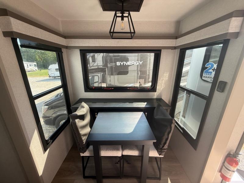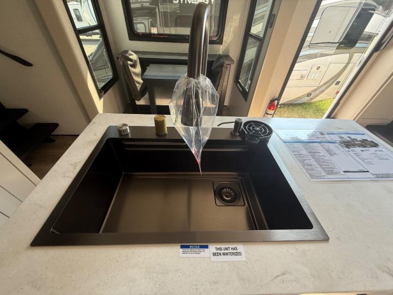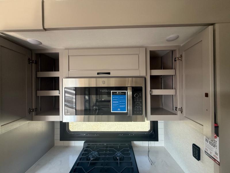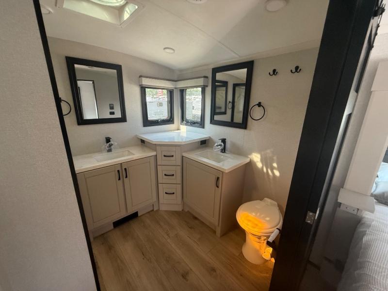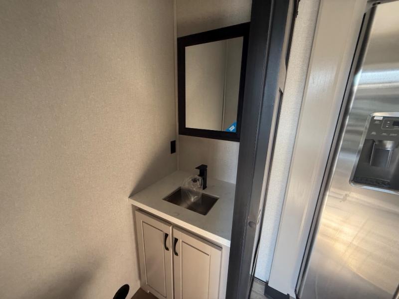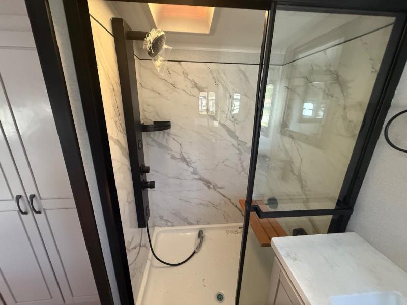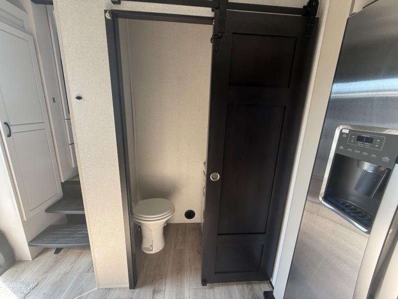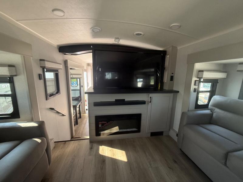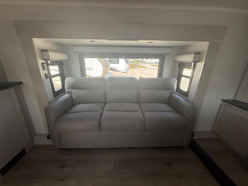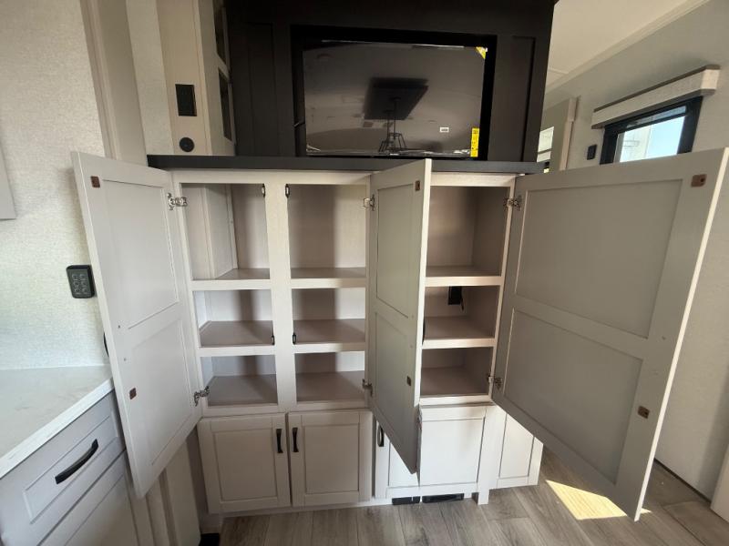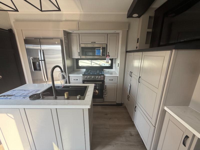 Entertainment can be found throughout this fifth wheel from the front living area with a 50" Smart LED HDTV with fully digital HDMI output and home entertainment system with subwoofer including a fireplace below that you can enjoy while relaxing on theater seats and two tri-fold sofas, a 32" TV in the middle kitchen and there is a bedroom 32" TV. You might even like to add the tailgate TV option along the exterior. Back inside the kitchen, the cook will love the center island, the pantry, the residential refrigerator, and the roll-top dinette. The half bath is a few steps away as an added convenience. The master bedroom includes a king bed slide, a bench, two wardrobes and a sliding door into the bathroom which offers two sinks, a space prepped for a washer/dryer option, and a walk-in shower. And don't forget about the exterior features such as the outside kitchen for more choices when making meals, the storage for your outdoor gear and chairs, and two awnings with integrated LED lighting.