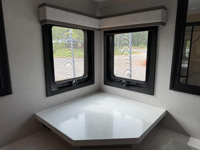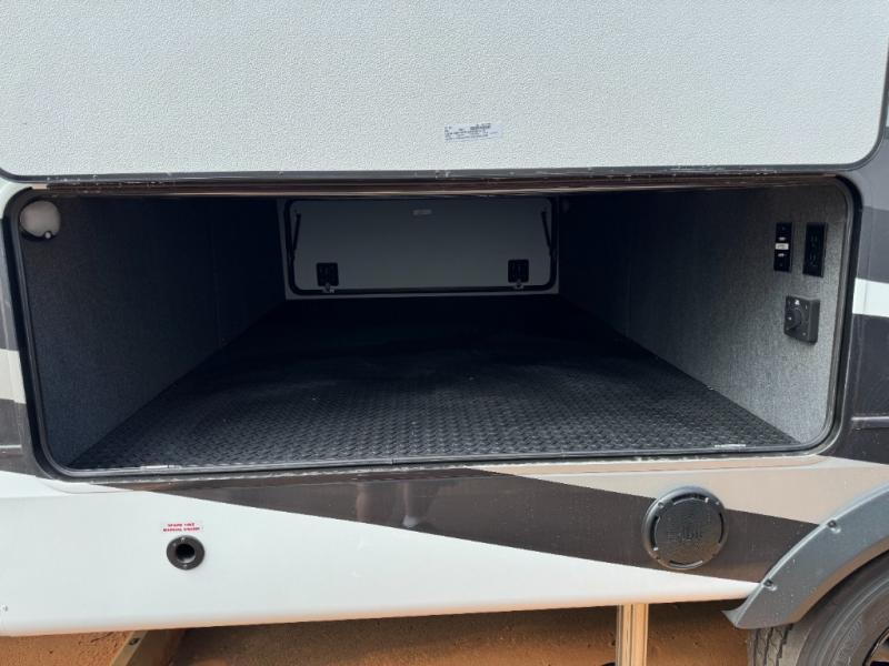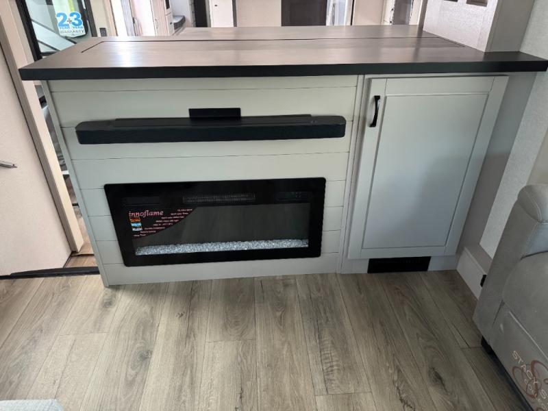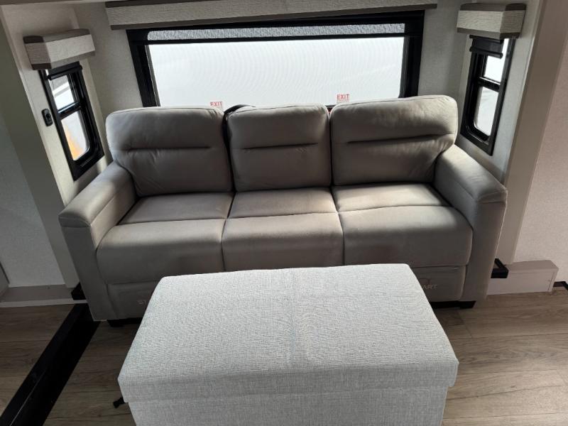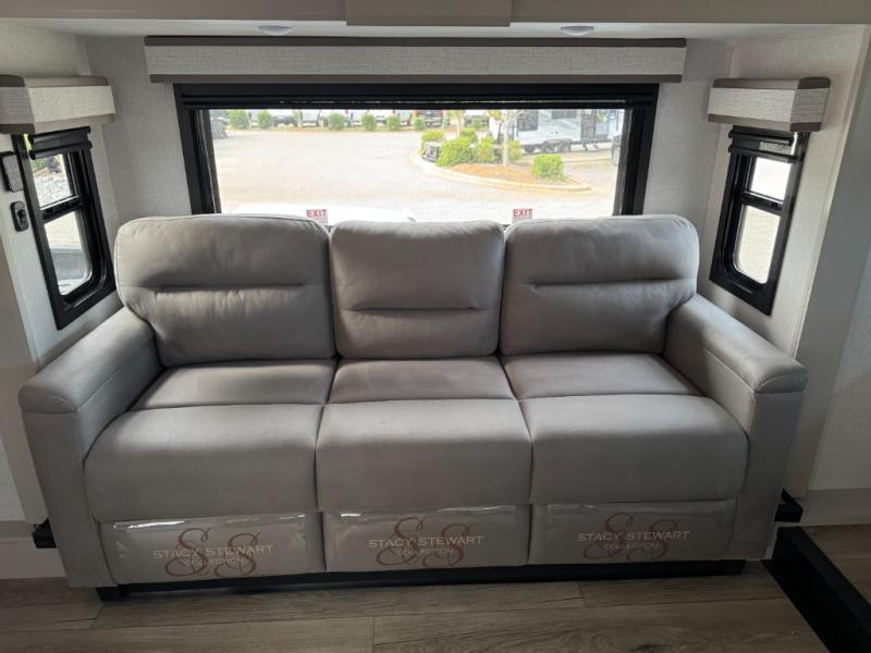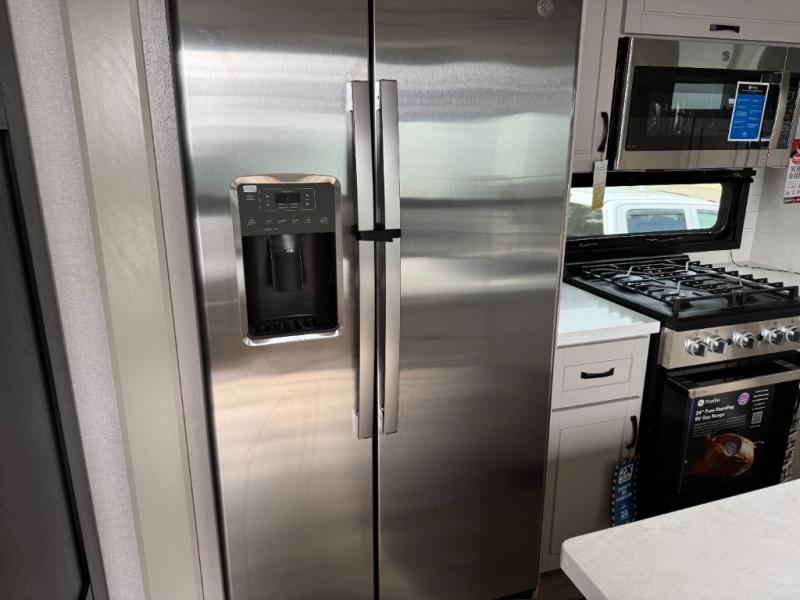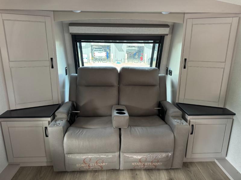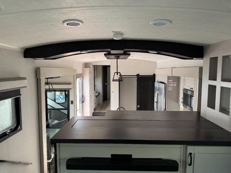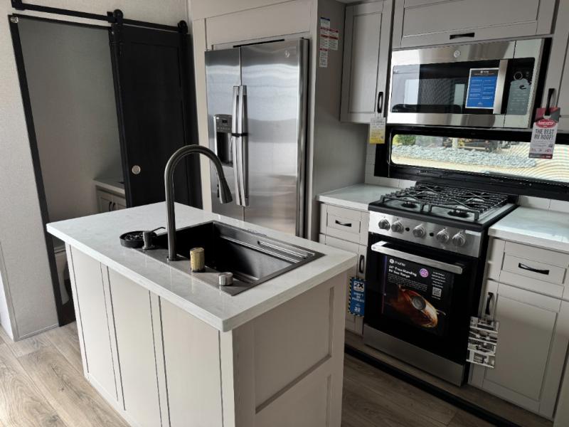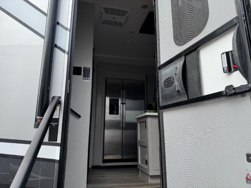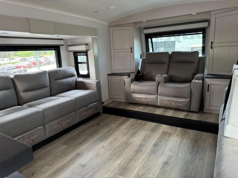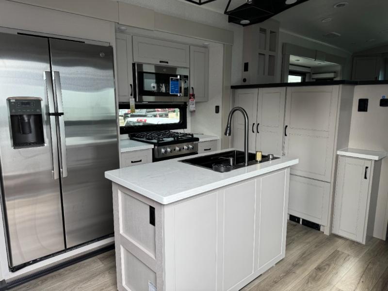 Entertainment can be found throughout this fifth wheel from the front living area with a 50" Smart LED HDTV with fully digital HDMI output and home entertainment system with subwoofer including a fireplace below that you can enjoy while relaxing on theater seats and two tri-fold sofas, a 32" TV in the middle kitchen and there is a bedroom 32" TV. You might even like to add the tailgate TV option along the exterior. Back inside the kitchen, the cook will love the center island, the pantry, the residential refrigerator, and the roll-top dinette. The half bath is a few steps away as an added convenience. The master bedroom includes a king bed slide, a bench, two wardrobes and a sliding door into the bathroom which offers two sinks, a space prepped for a washer/dryer option, and a walk-in shower. And don't forget about the exterior features such as the outside kitchen for more choices when making meals, the storage for your outdoor gear and chairs, and two awnings with integrated LED lighting.
