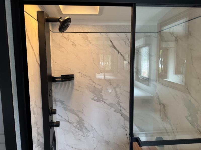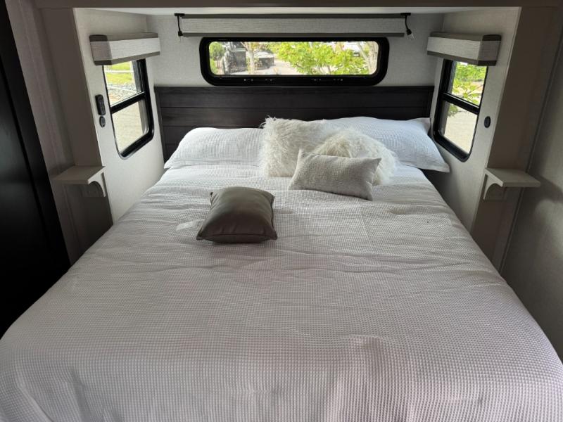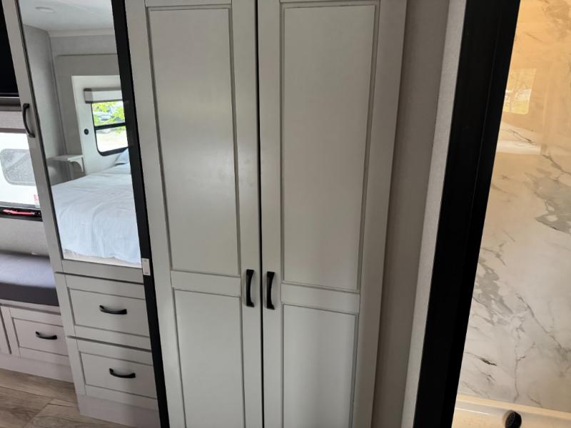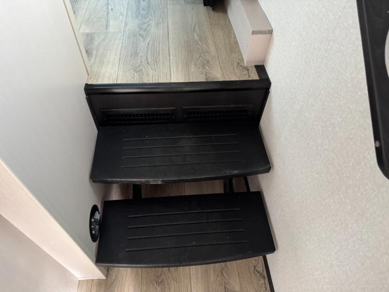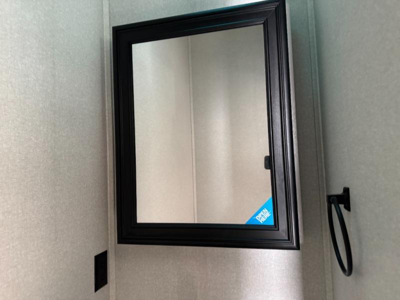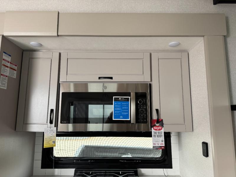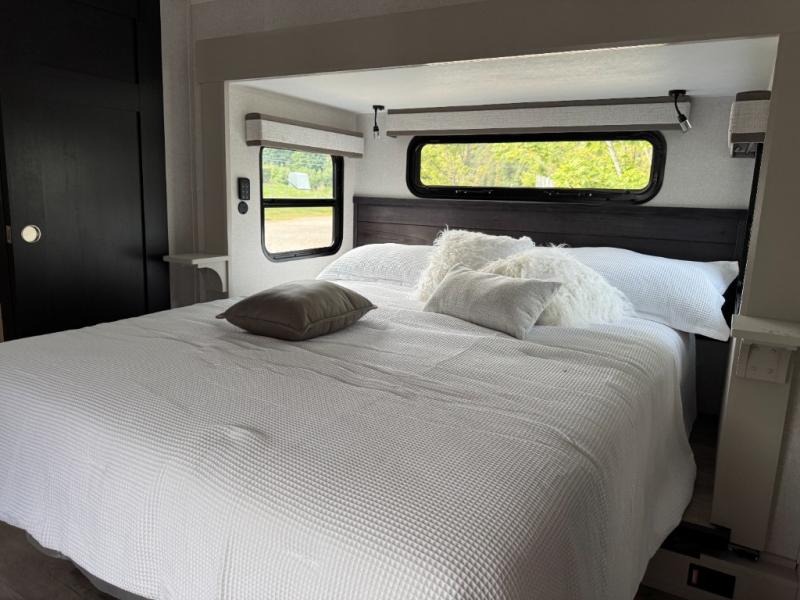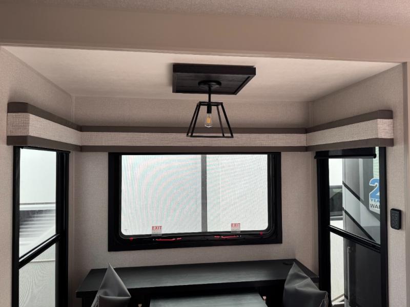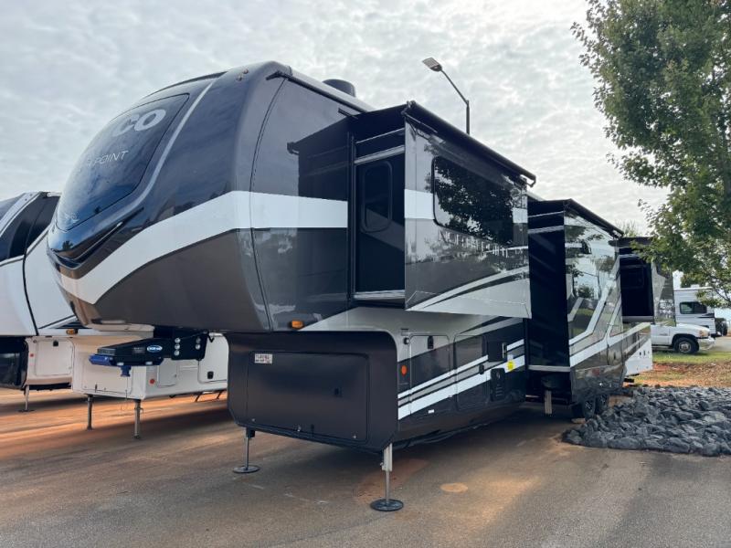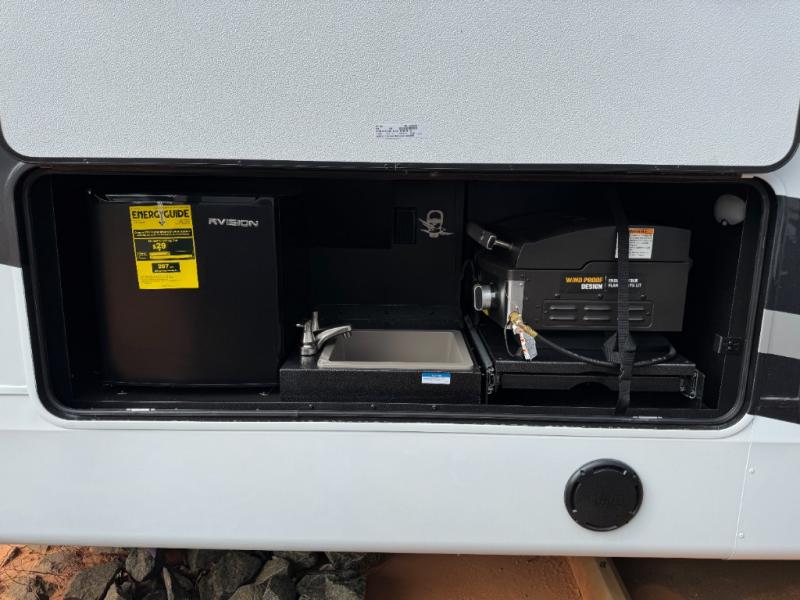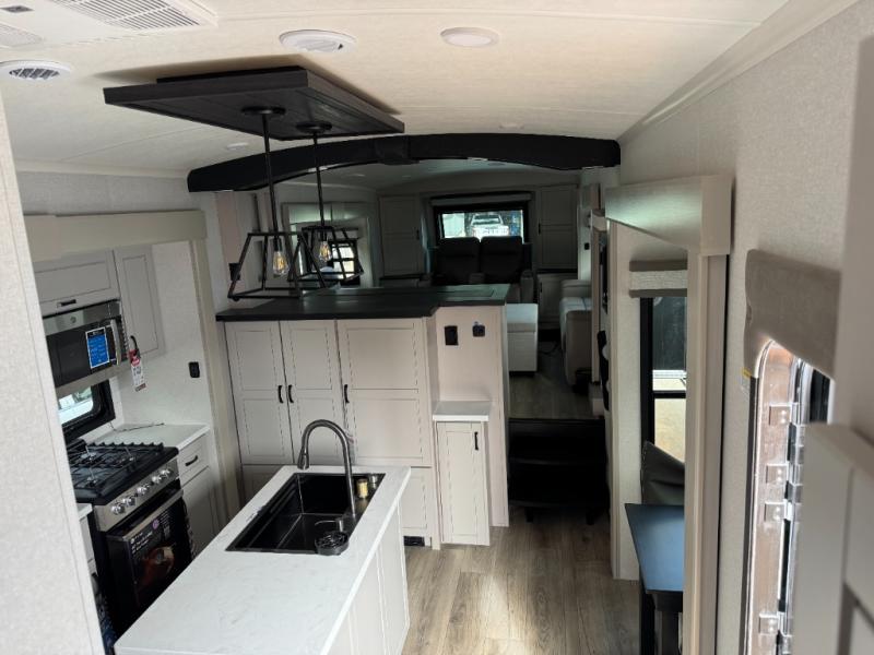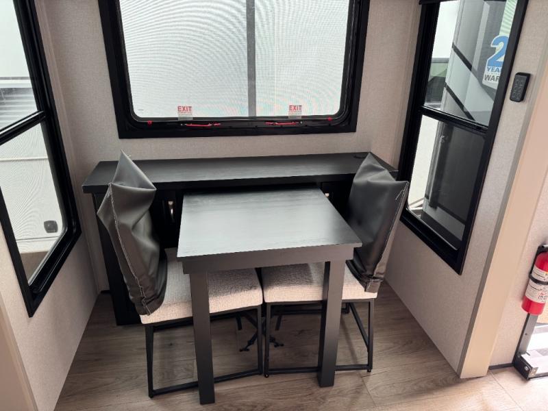 Entertainment can be found throughout this fifth wheel from the front living area with a 50" Smart LED HDTV with fully digital HDMI output and home entertainment system with subwoofer including a fireplace below that you can enjoy while relaxing on theater seats and two tri-fold sofas, a 32" TV in the middle kitchen and there is a bedroom 32" TV. You might even like to add the tailgate TV option along the exterior. Back inside the kitchen, the cook will love the center island, the pantry, the residential refrigerator, and the roll-top dinette. The half bath is a few steps away as an added convenience. The master bedroom includes a king bed slide, a bench, two wardrobes and a sliding door into the bathroom which offers two sinks, a space prepped for a washer/dryer option, and a walk-in shower. And don't forget about the exterior features such as the outside kitchen for more choices when making meals, the storage for your outdoor gear and chairs, and two awnings with integrated LED lighting.