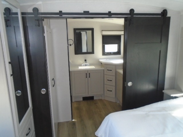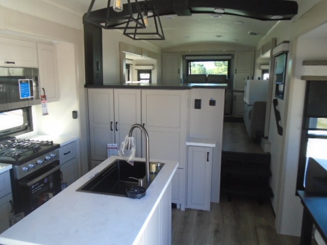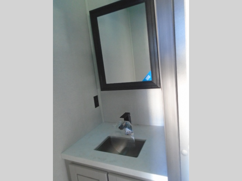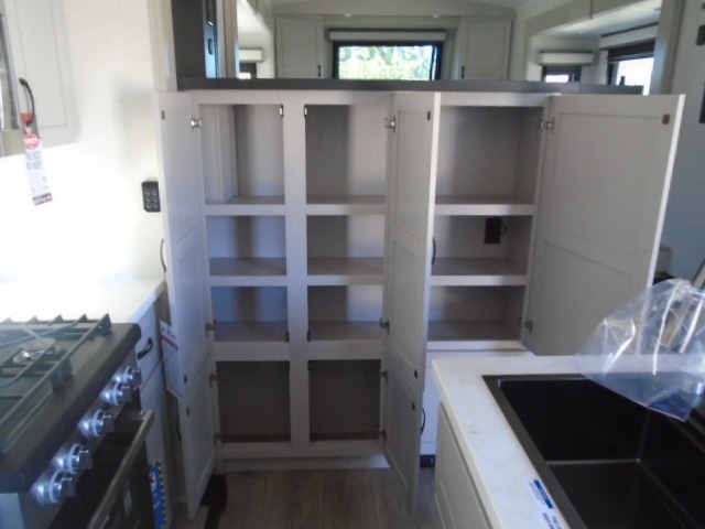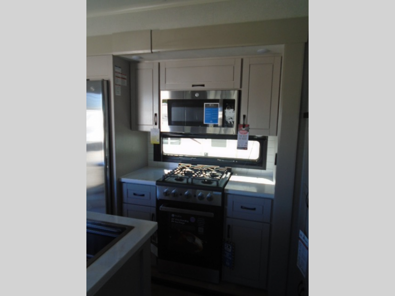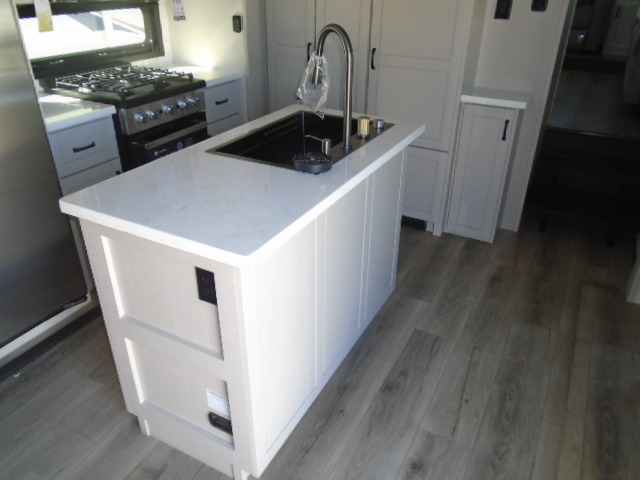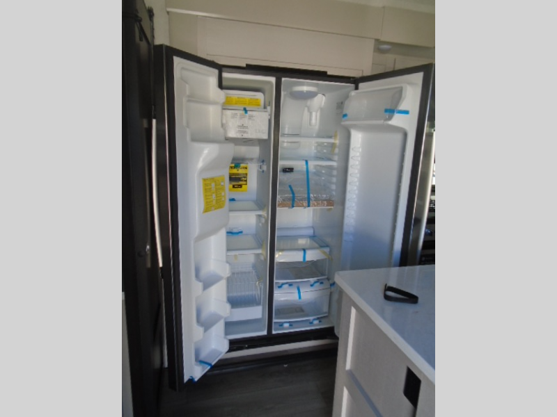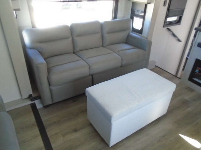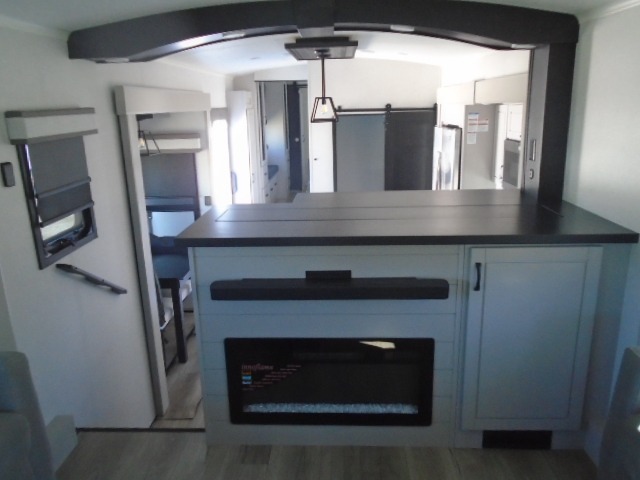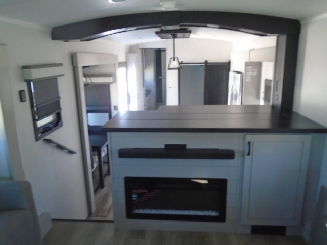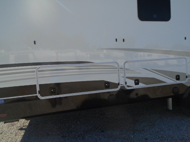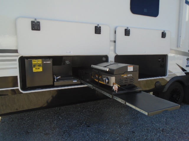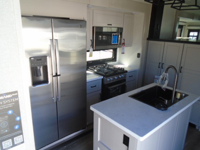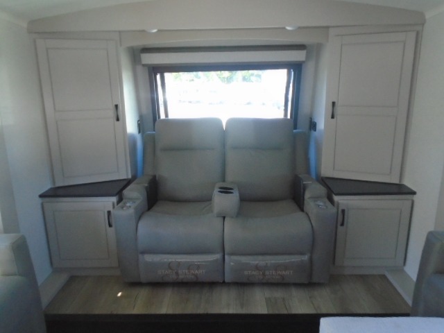 Entertainment can be found throughout this fifth wheel from the front living area with a 50" Smart LED HDTV with fully digital HDMI output and home entertainment system with subwoofer including a fireplace below that you can enjoy while relaxing on theater seats and two tri-fold sofas, a 32" TV in the middle kitchen and there is a bedroom 32" TV. You might even like to add the tailgate TV option along the exterior. Back inside the kitchen, the cook will love the center island, the pantry, the residential refrigerator, and the roll-top dinette. The half bath is a few steps away as an added convenience. The master bedroom includes a king bed slide, a bench, two wardrobes and a sliding door into the bathroom which offers two sinks, a space prepped for a washer/dryer option, and a walk-in shower. And don't forget about the exterior features such as the outside kitchen for more choices when making meals, the storage for your outdoor gear and chairs, and two awnings with integrated LED lighting.