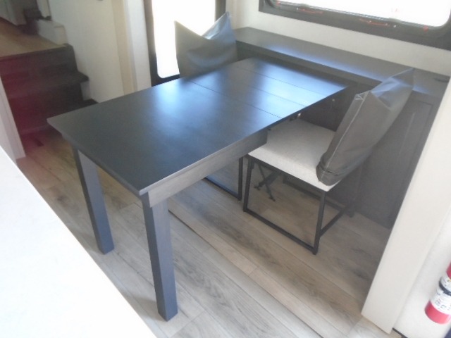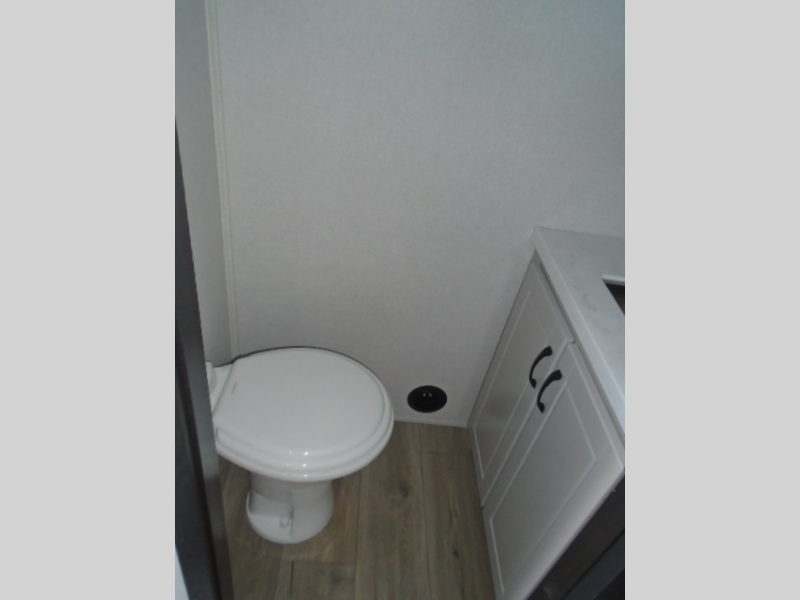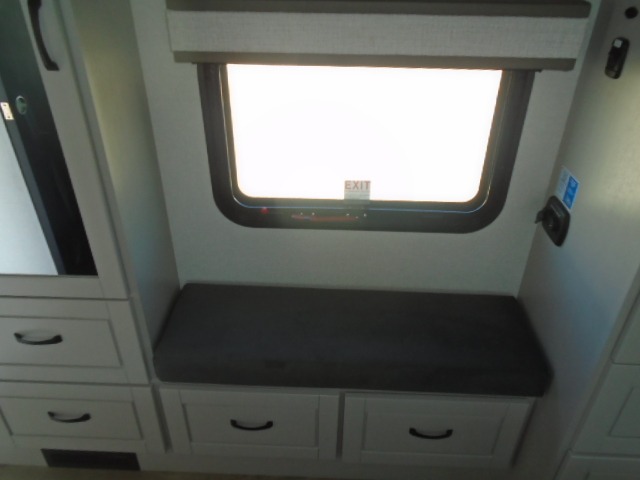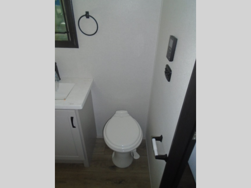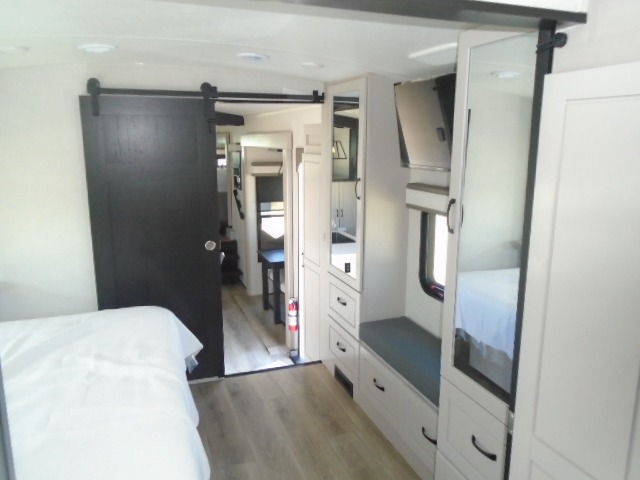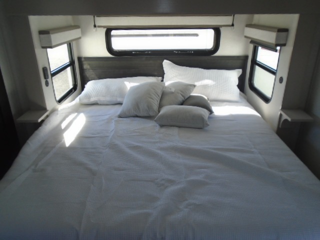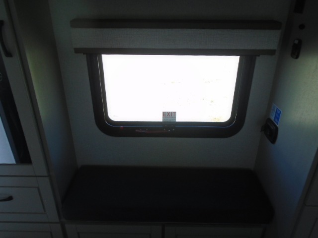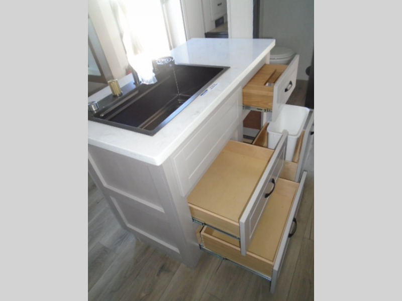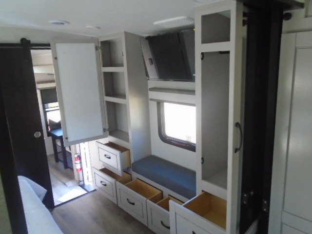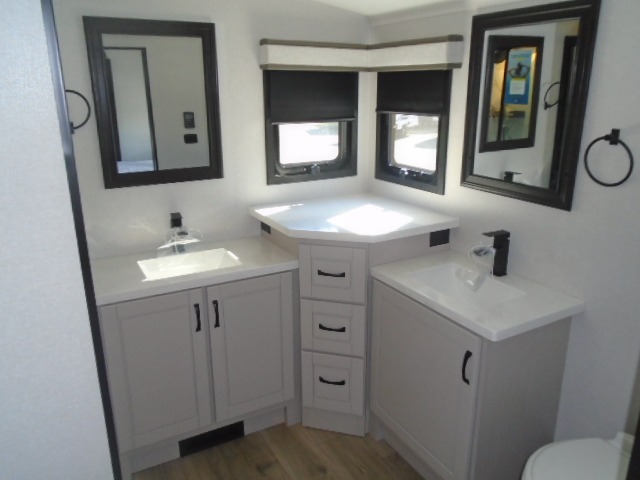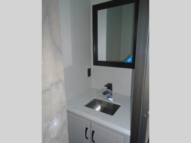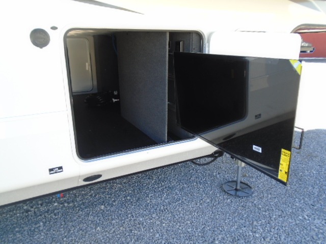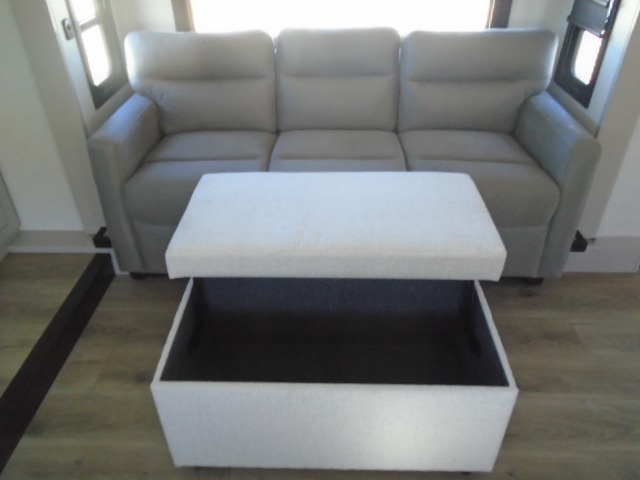 Entertainment can be found throughout this fifth wheel from the front living area with a 50" Smart LED HDTV with fully digital HDMI output and home entertainment system with subwoofer including a fireplace below that you can enjoy while relaxing on theater seats and two tri-fold sofas, a 32" TV in the middle kitchen and there is a bedroom 32" TV. You might even like to add the tailgate TV option along the exterior. Back inside the kitchen, the cook will love the center island, the pantry, the residential refrigerator, and the roll-top dinette. The half bath is a few steps away as an added convenience. The master bedroom includes a king bed slide, a bench, two wardrobes and a sliding door into the bathroom which offers two sinks, a space prepped for a washer/dryer option, and a walk-in shower. And don't forget about the exterior features such as the outside kitchen for more choices when making meals, the storage for your outdoor gear and chairs, and two awnings with integrated LED lighting.