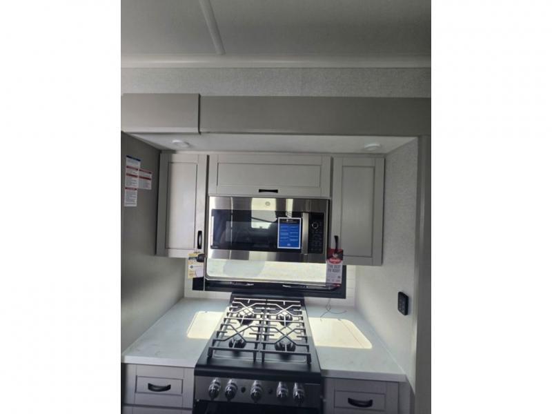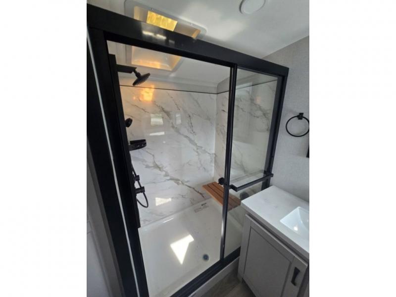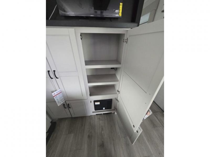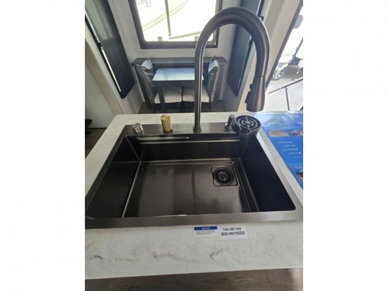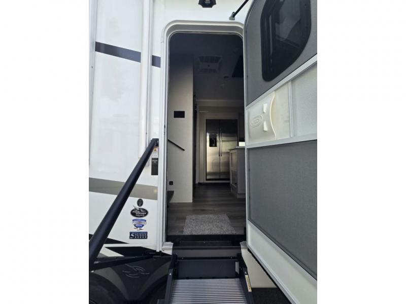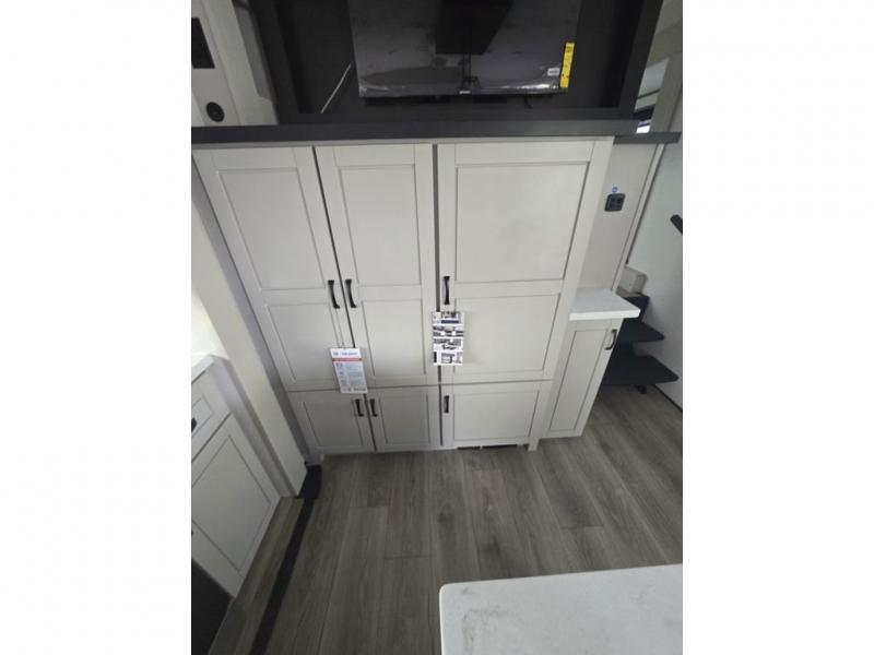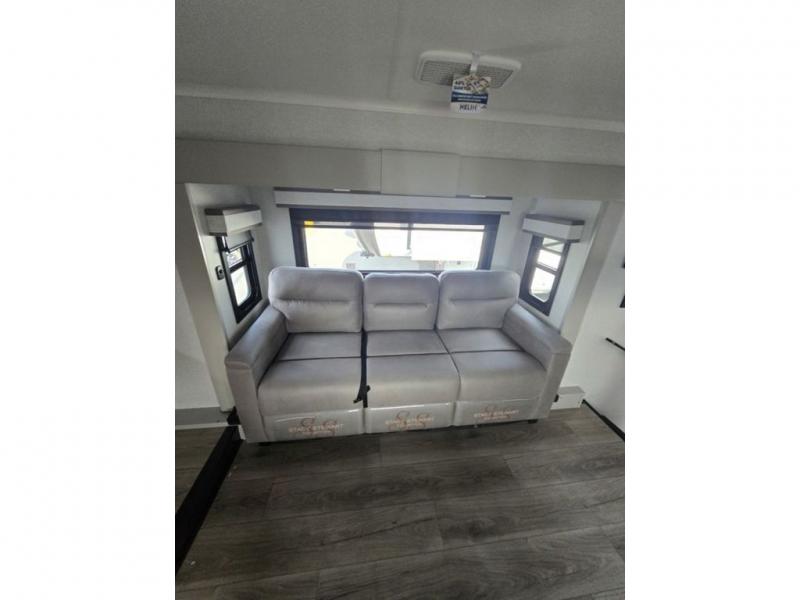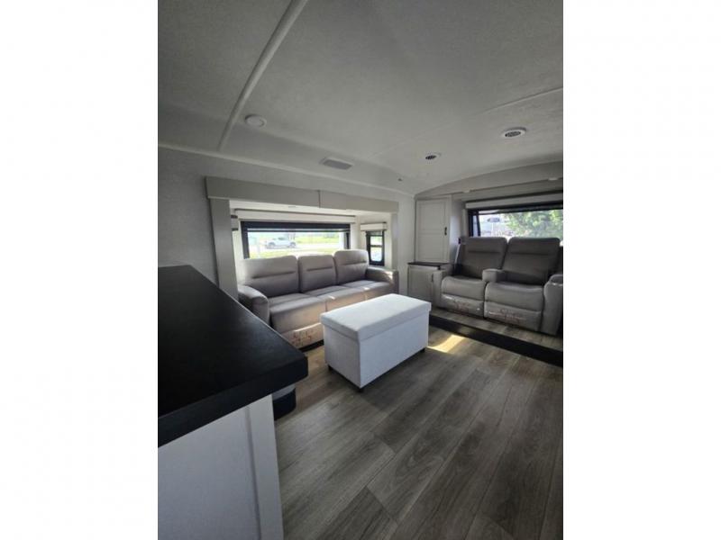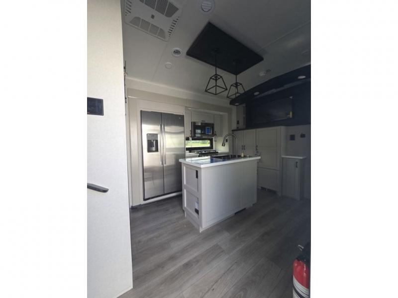 Entertainment can be found throughout this fifth wheel from the front living area with a 50" Smart LED HDTV with fully digital HDMI output and home entertainment system with subwoofer including a fireplace below that you can enjoy while relaxing on theater seats and two tri-fold sofas, a 32" TV in the middle kitchen and there is a bedroom 32" TV. You might even like to add the tailgate TV option along the exterior. Back inside the kitchen, the cook will love the center island, the pantry, the residential refrigerator, and the roll-top dinette. The half bath is a few steps away as an added convenience. The master bedroom includes a king bed slide, a bench, two wardrobes and a sliding door into the bathroom which offers two sinks, a space prepped for a washer/dryer option, and a walk-in shower. And don't forget about the exterior features such as the outside kitchen for more choices when making meals, the storage for your outdoor gear and chairs, and two awnings with integrated LED lighting.