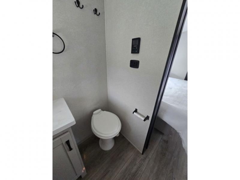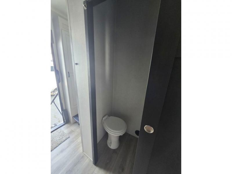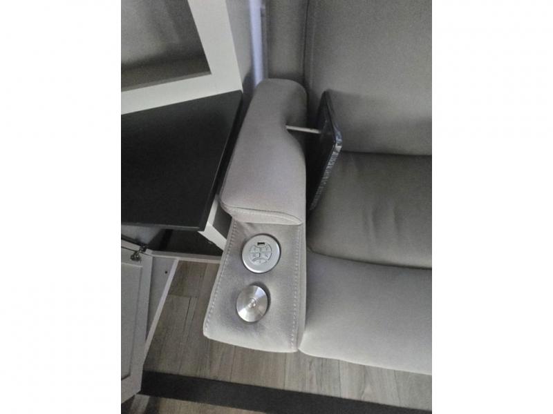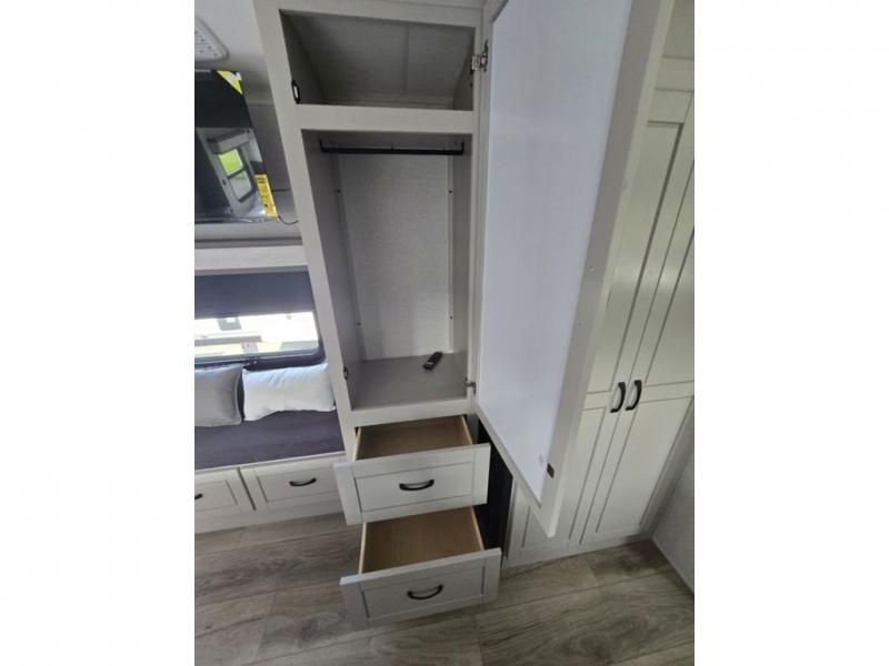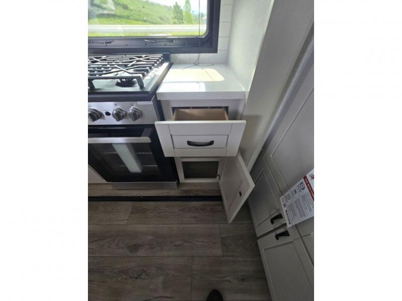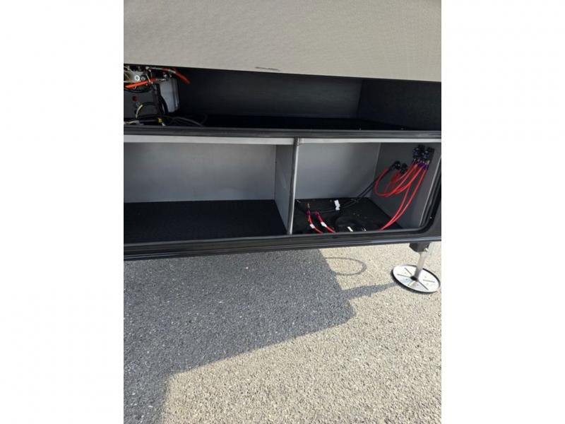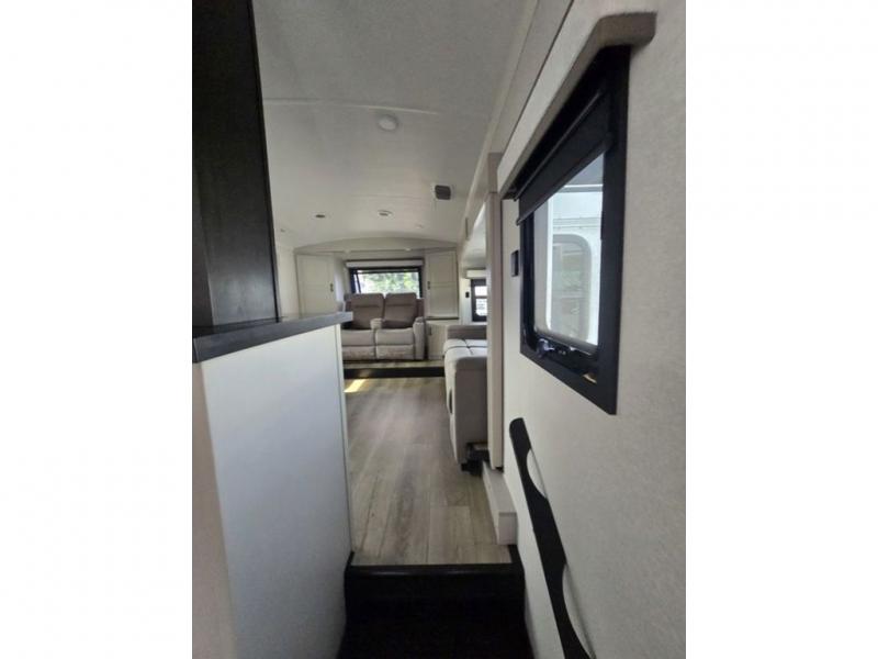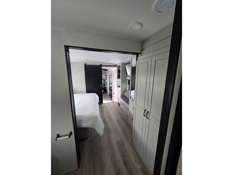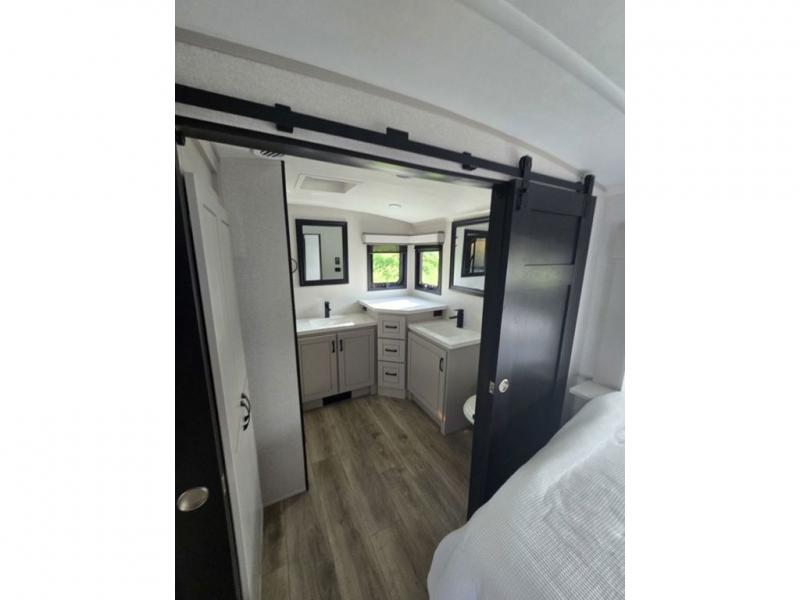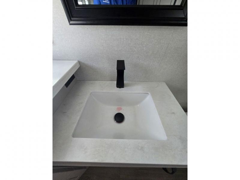Entertainment can be found throughout this fifth wheel from the front living area with a 50" Smart LED HDTV with fully digital HDMI output and home entertainment system with subwoofer including a fireplace below that you can enjoy while relaxing on theater seats and two tri-fold sofas, a 32" TV in the middle kitchen and there is a bedroom 32" TV. You might even like to add the tailgate TV option along the exterior. Back inside the kitchen, the cook will love the center island, the pantry, the residential refrigerator, and the roll-top dinette. The half bath is a few steps away as an added convenience. The master bedroom includes a king bed slide, a bench, two wardrobes and a sliding door into the bathroom which offers two sinks, a space prepped for a washer/dryer option, and a walk-in shower. And don't forget about the exterior features such as the outside kitchen for more choices when making meals, the storage for your outdoor gear and chairs, and two awnings with integrated LED lighting.