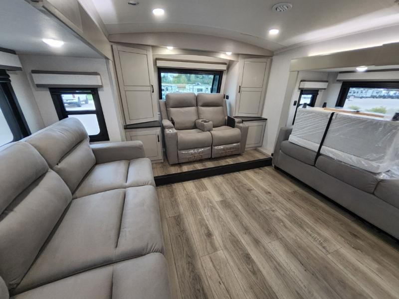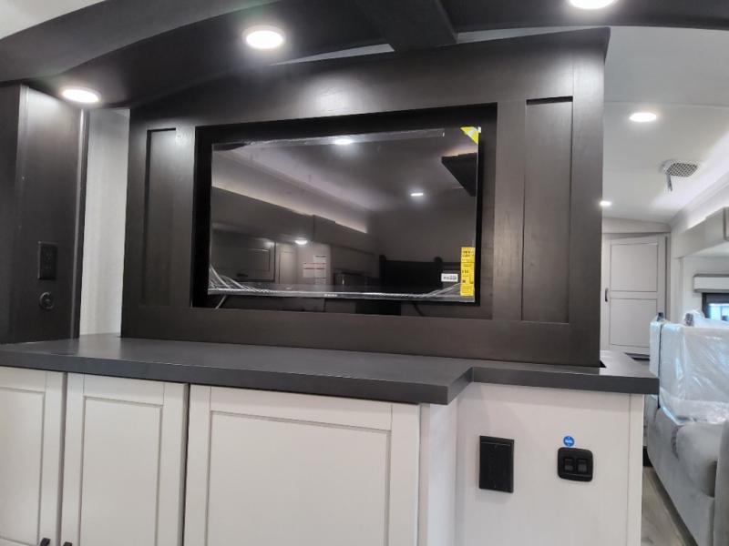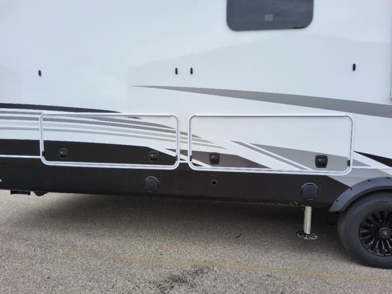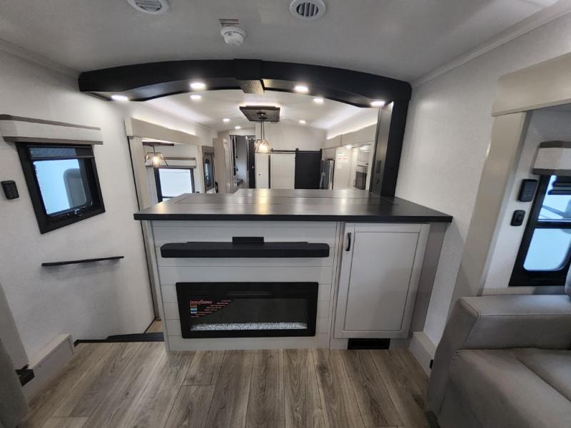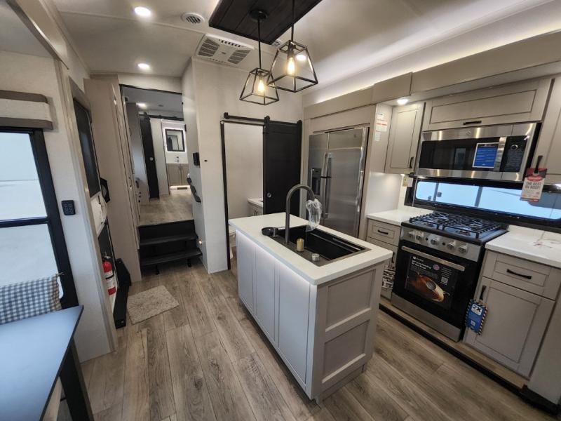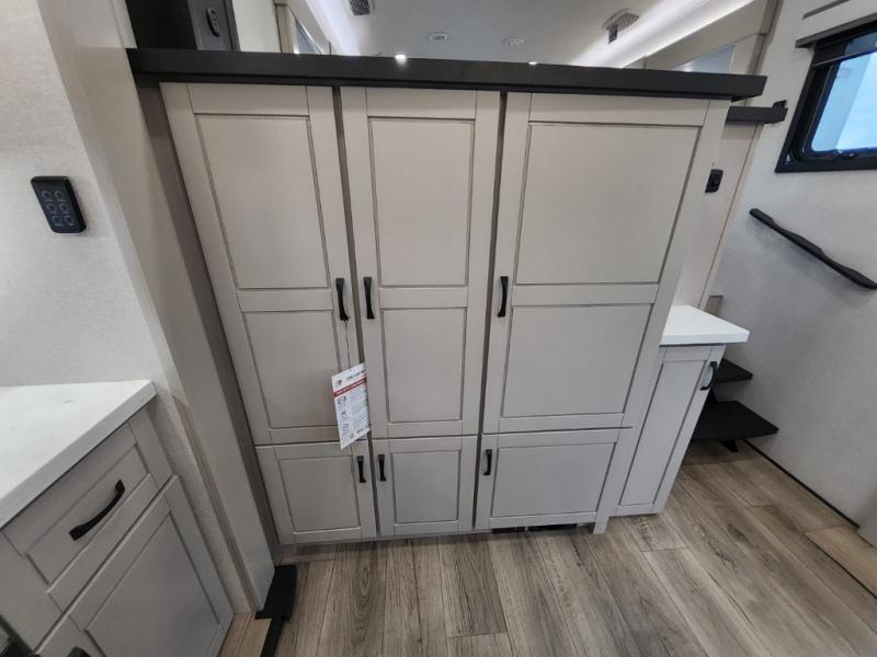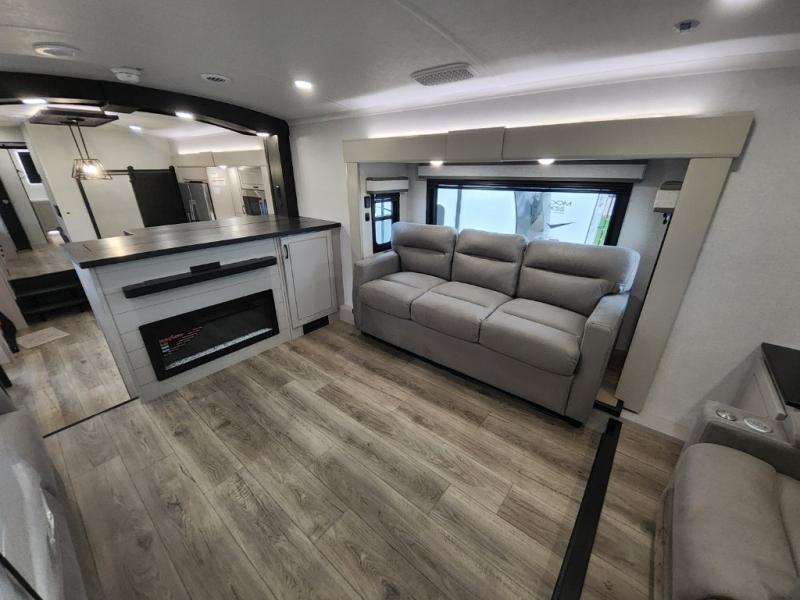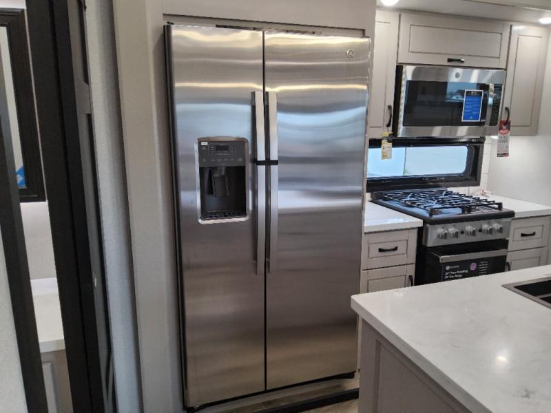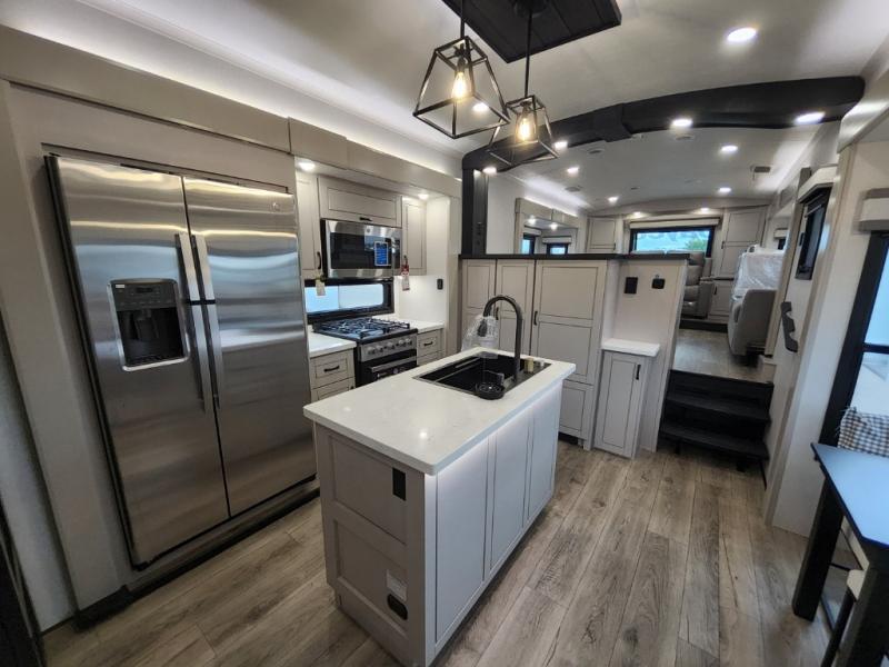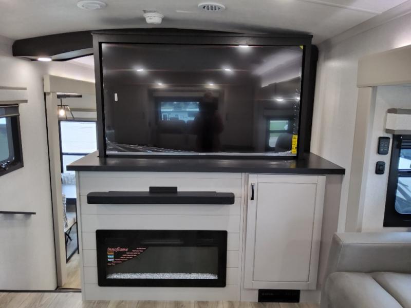 Entertainment can be found throughout this fifth wheel from the front living area with a 50" Smart LED HDTV with fully digital HDMI output and home entertainment system with subwoofer including a fireplace below that you can enjoy while relaxing on theater seats and two tri-fold sofas, a 32" TV in the middle kitchen and there is a bedroom 32" TV. You might even like to add the tailgate TV option along the exterior. Back inside the kitchen, the cook will love the center island, the pantry, the residential refrigerator, and the roll-top dinette. The half bath is a few steps away as an added convenience. The master bedroom includes a king bed slide, a bench, two wardrobes and a sliding door into the bathroom which offers two sinks, a space prepped for a washer/dryer option, and a walk-in shower. And don't forget about the exterior features such as the outside kitchen for more choices when making meals, the storage for your outdoor gear and chairs, and two awnings with integrated LED lighting.