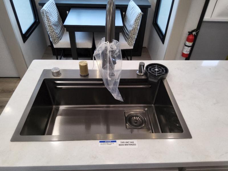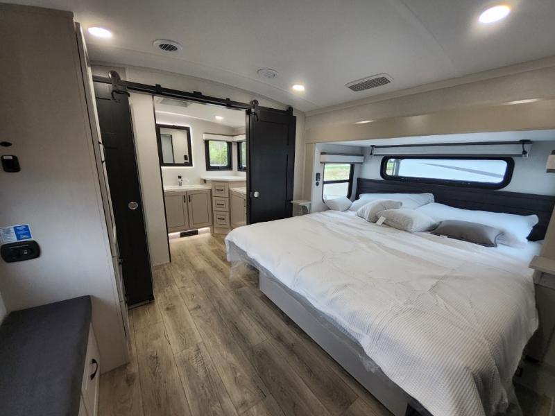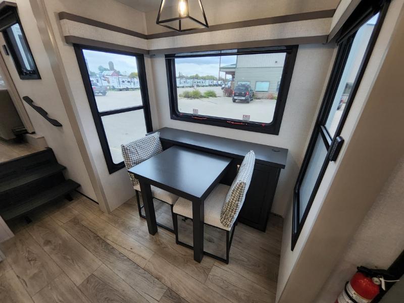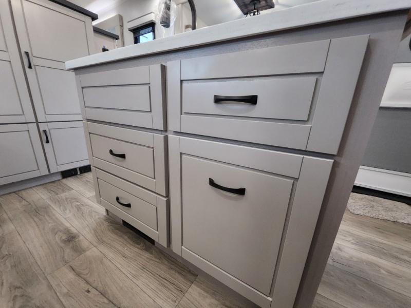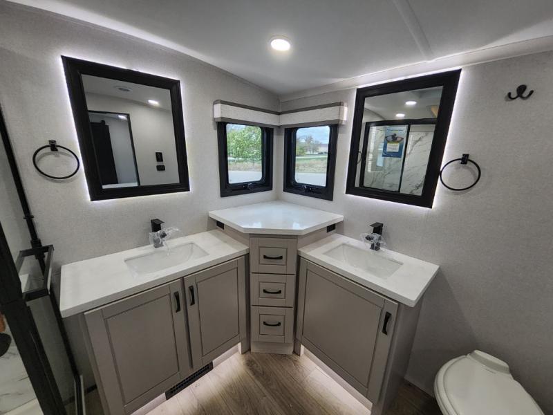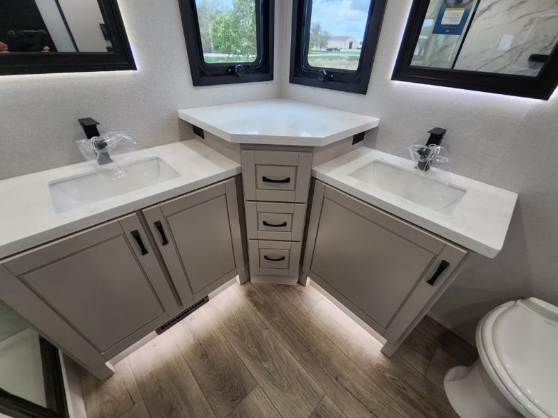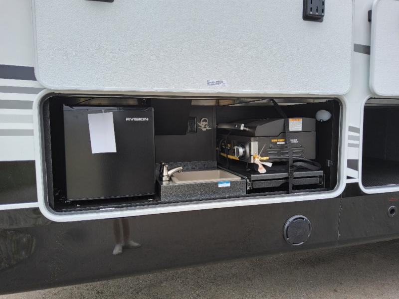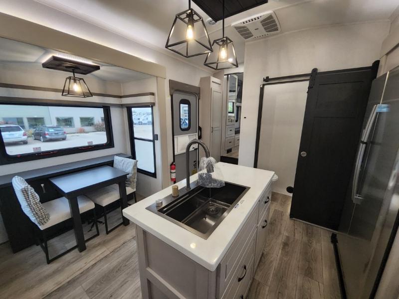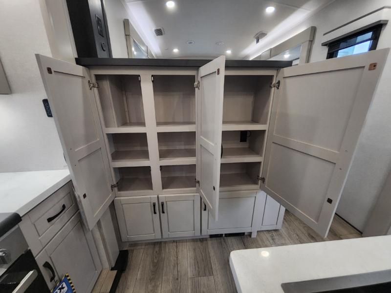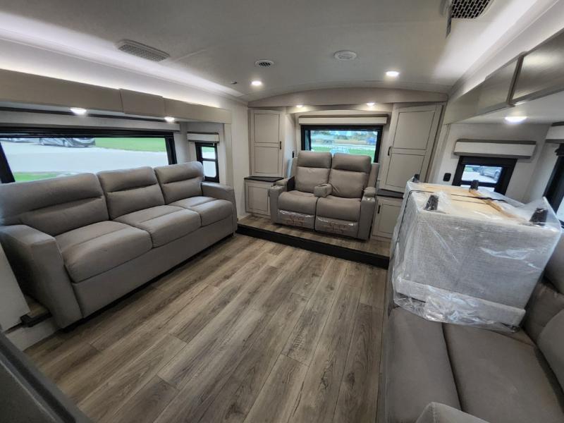 Entertainment can be found throughout this fifth wheel from the front living area with a 50" Smart LED HDTV with fully digital HDMI output and home entertainment system with subwoofer including a fireplace below that you can enjoy while relaxing on theater seats and two tri-fold sofas, a 32" TV in the middle kitchen and there is a bedroom 32" TV. You might even like to add the tailgate TV option along the exterior. Back inside the kitchen, the cook will love the center island, the pantry, the residential refrigerator, and the roll-top dinette. The half bath is a few steps away as an added convenience. The master bedroom includes a king bed slide, a bench, two wardrobes and a sliding door into the bathroom which offers two sinks, a space prepped for a washer/dryer option, and a walk-in shower. And don't forget about the exterior features such as the outside kitchen for more choices when making meals, the storage for your outdoor gear and chairs, and two awnings with integrated LED lighting.