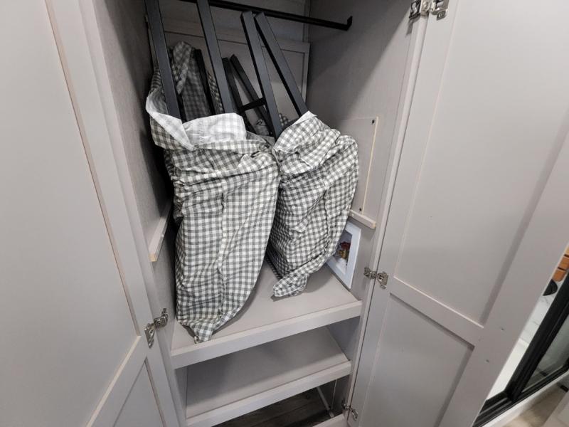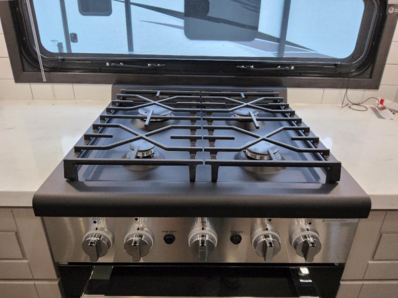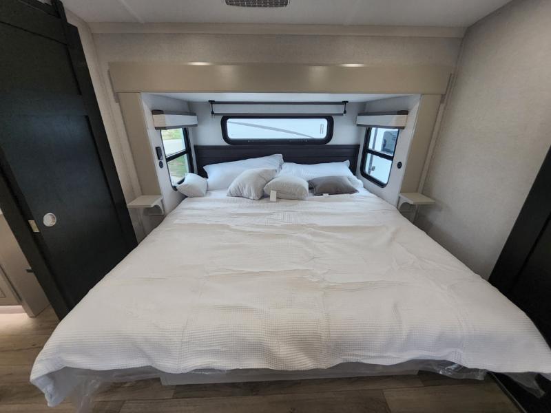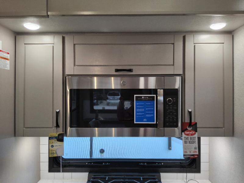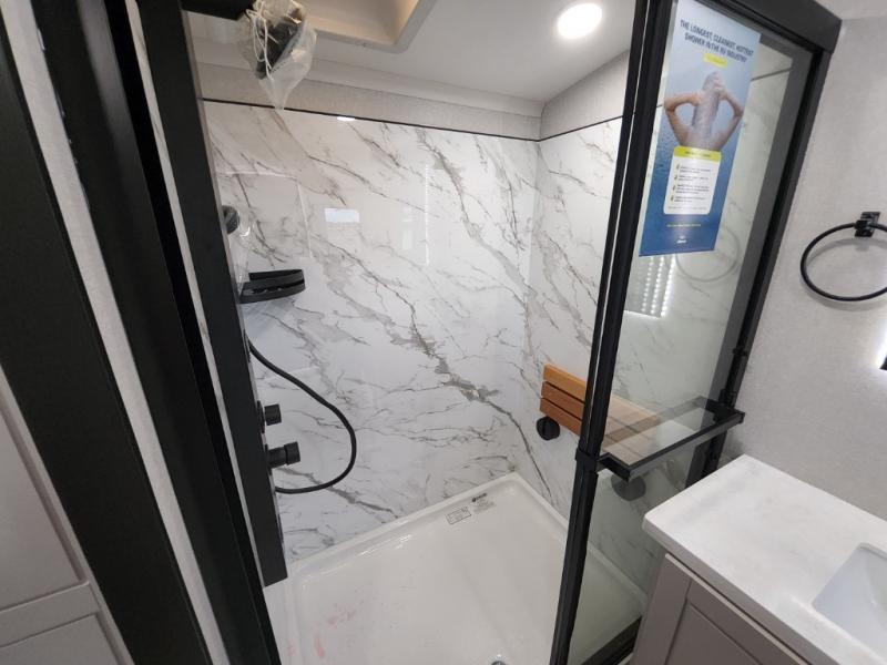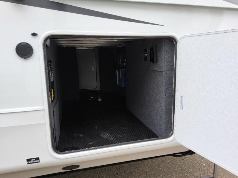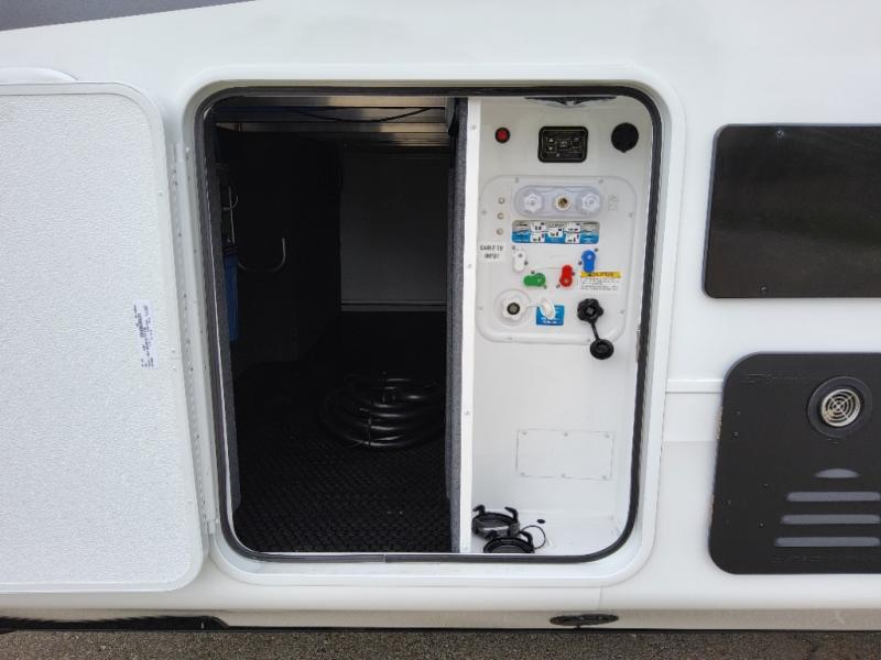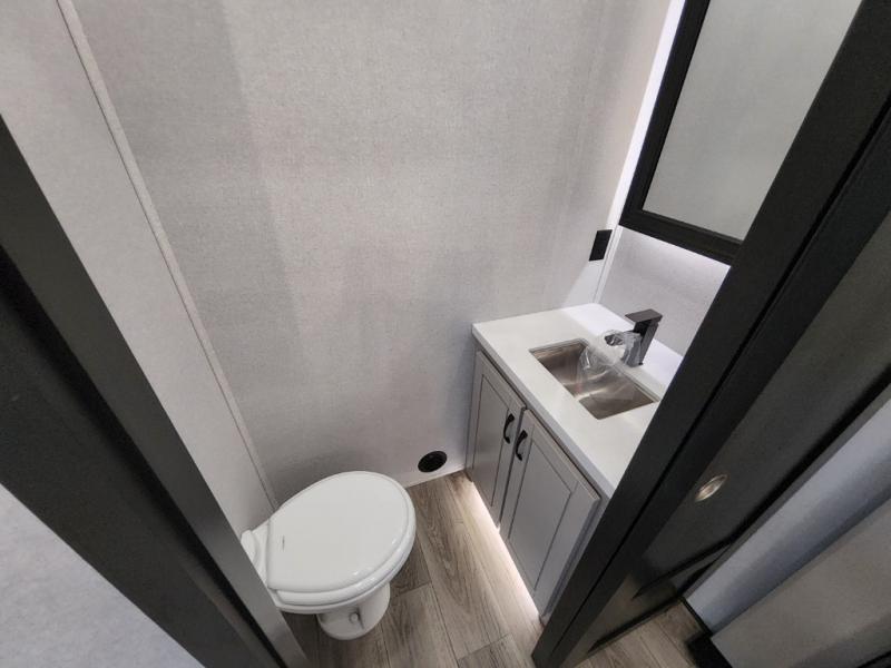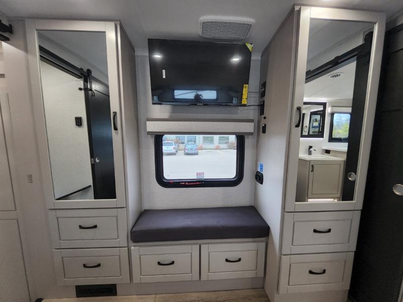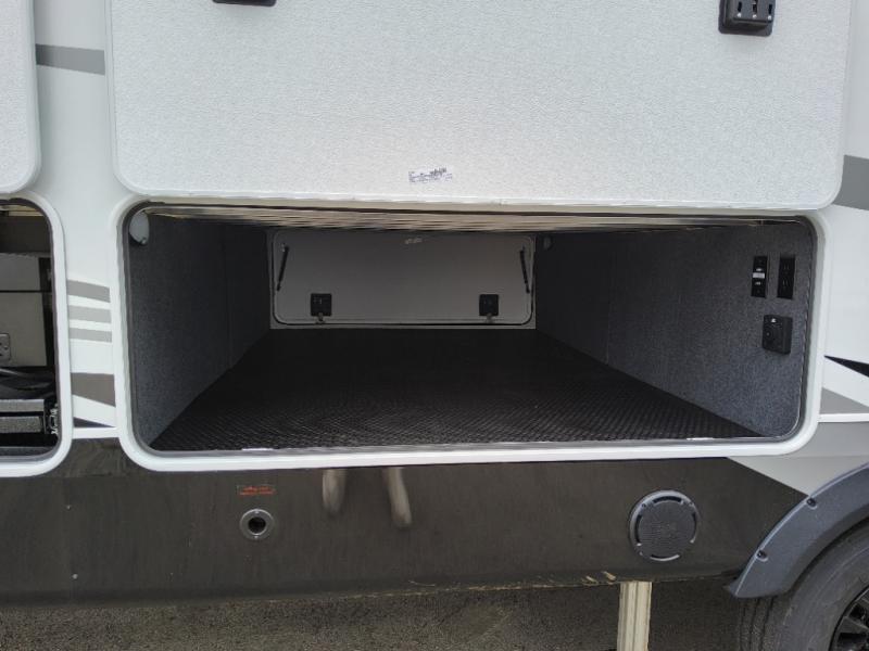 Entertainment can be found throughout this fifth wheel from the front living area with a 50" Smart LED HDTV with fully digital HDMI output and home entertainment system with subwoofer including a fireplace below that you can enjoy while relaxing on theater seats and two tri-fold sofas, a 32" TV in the middle kitchen and there is a bedroom 32" TV. You might even like to add the tailgate TV option along the exterior. Back inside the kitchen, the cook will love the center island, the pantry, the residential refrigerator, and the roll-top dinette. The half bath is a few steps away as an added convenience. The master bedroom includes a king bed slide, a bench, two wardrobes and a sliding door into the bathroom which offers two sinks, a space prepped for a washer/dryer option, and a walk-in shower. And don't forget about the exterior features such as the outside kitchen for more choices when making meals, the storage for your outdoor gear and chairs, and two awnings with integrated LED lighting.