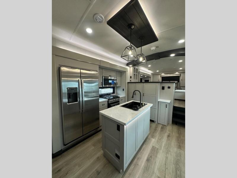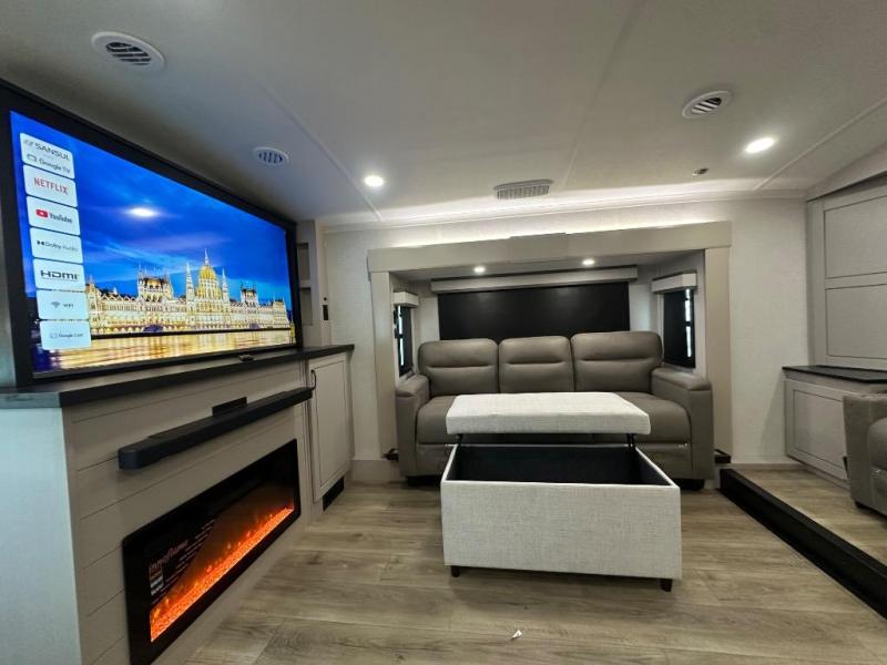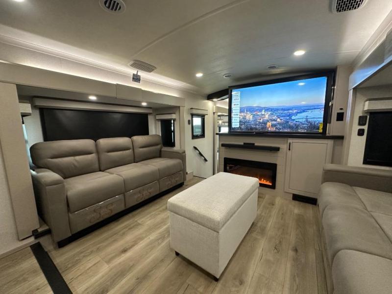 Entertainment can be found throughout this fifth wheel from the front living area with a 50" Smart LED HDTV with fully digital HDMI output and home entertainment system with subwoofer including a fireplace below that you can enjoy while relaxing on theater seats and two tri-fold sofas, a 32" TV in the middle kitchen and there is a bedroom 32" TV. You might even like to add the tailgate TV option along the exterior. Back inside the kitchen, the cook will love the center island, the pantry, the residential refrigerator, and the roll-top dinette. The half bath is a few steps away as an added convenience. The master bedroom includes a king bed slide, a bench, two wardrobes and a sliding door into the bathroom which offers two sinks, a space prepped for a washer/dryer option, and a walk-in shower. And don't forget about the exterior features such as the outside kitchen for more choices when making meals, the storage for your outdoor gear and chairs, and two awnings with integrated LED lighting.