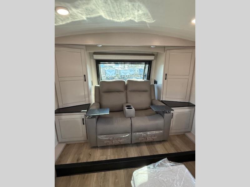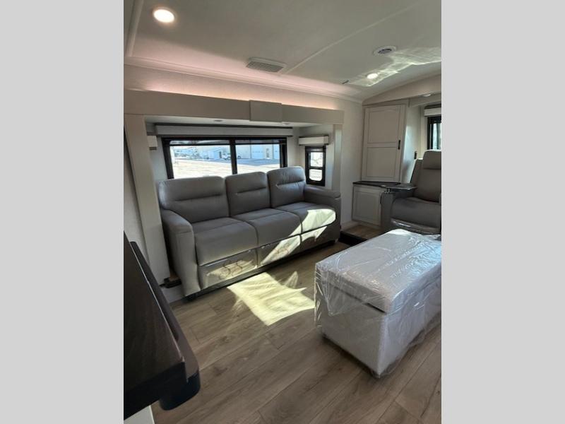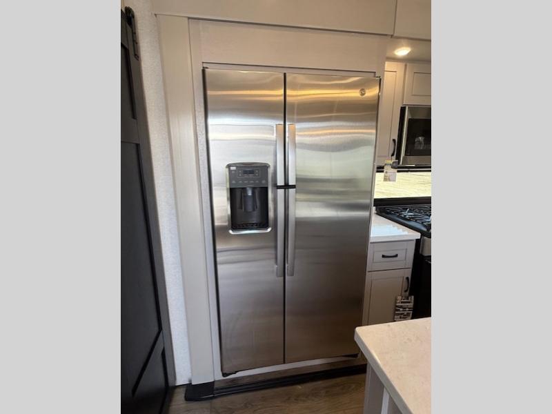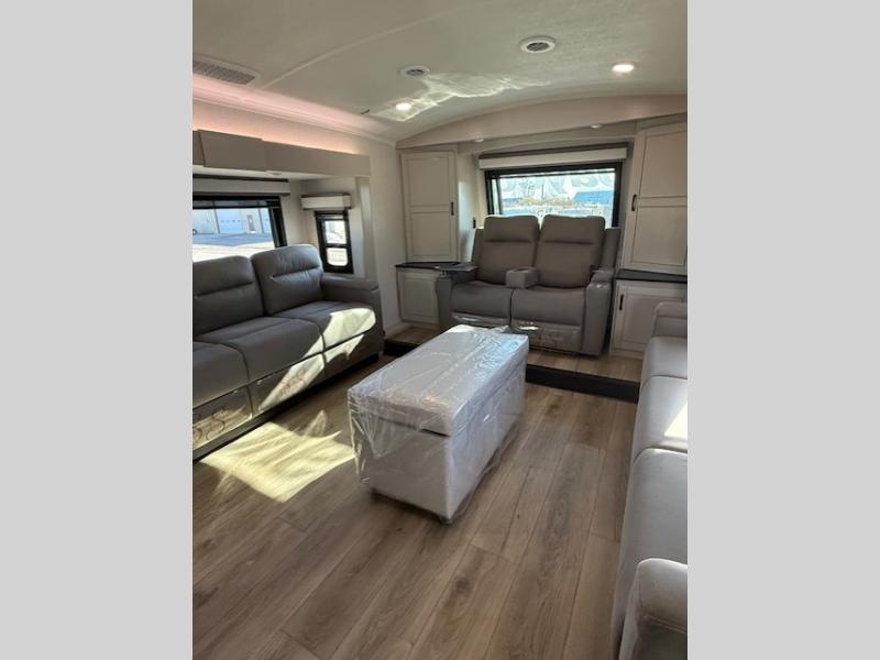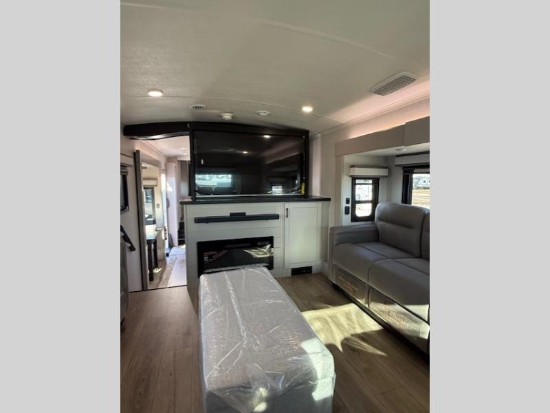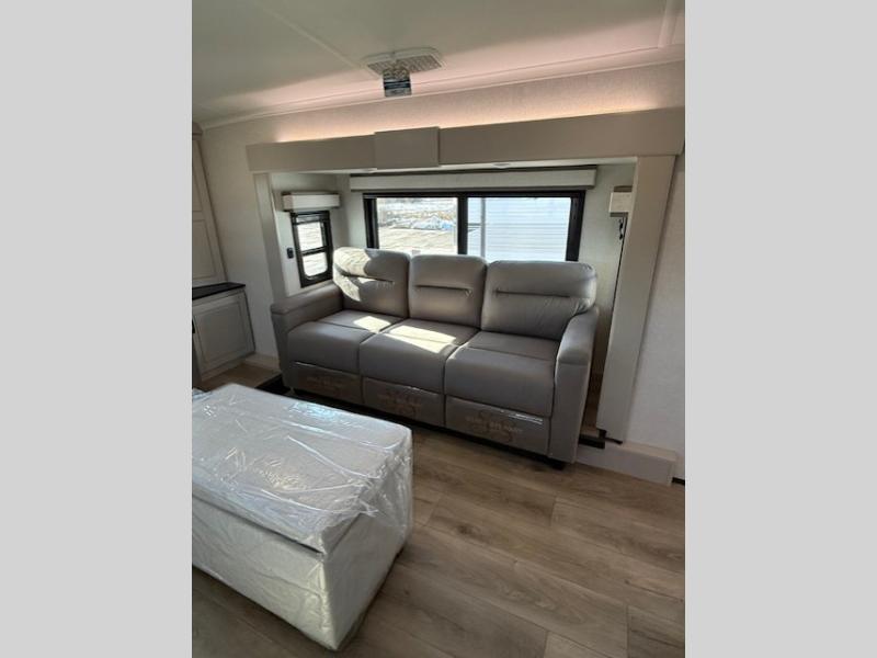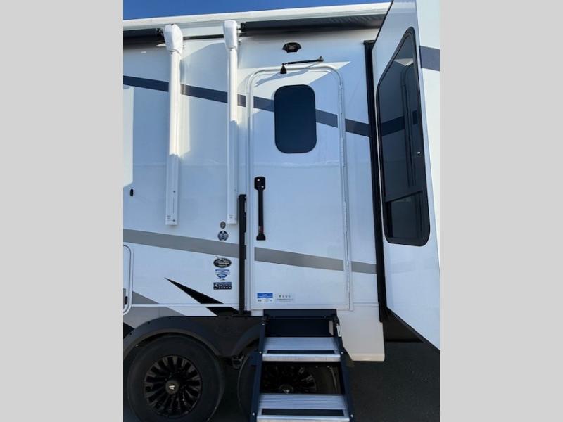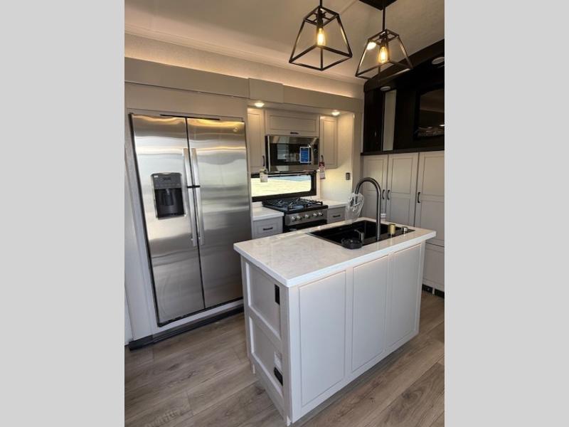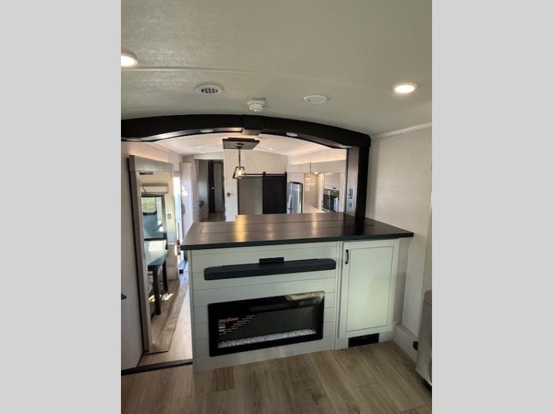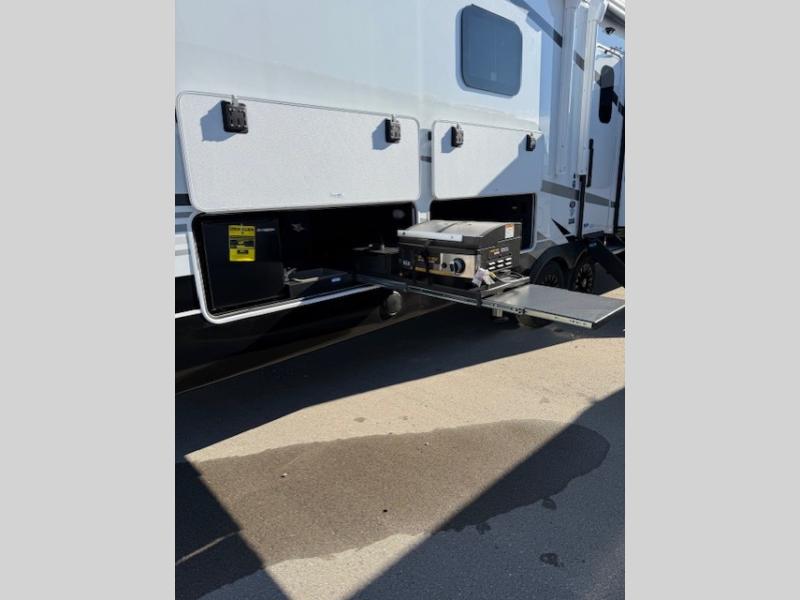 Entertainment can be found throughout this fifth wheel from the front living area with a 50" Smart LED HDTV with fully digital HDMI output and home entertainment system with subwoofer including a fireplace below that you can enjoy while relaxing on theater seats and two tri-fold sofas, a 32" TV in the middle kitchen and there is a bedroom 32" TV. You might even like to add the tailgate TV option along the exterior. Back inside the kitchen, the cook will love the center island, the pantry, the residential refrigerator, and the roll-top dinette. The half bath is a few steps away as an added convenience. The master bedroom includes a king bed slide, a bench, two wardrobes and a sliding door into the bathroom which offers two sinks, a space prepped for a washer/dryer option, and a walk-in shower. And don't forget about the exterior features such as the outside kitchen for more choices when making meals, the storage for your outdoor gear and chairs, and two awnings with integrated LED lighting.