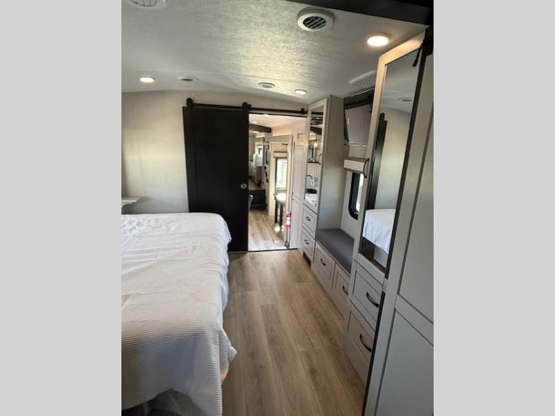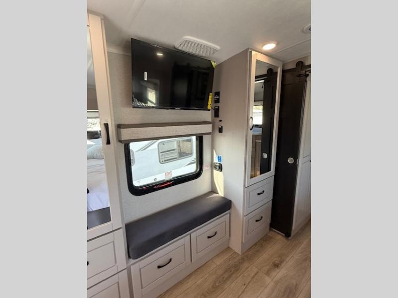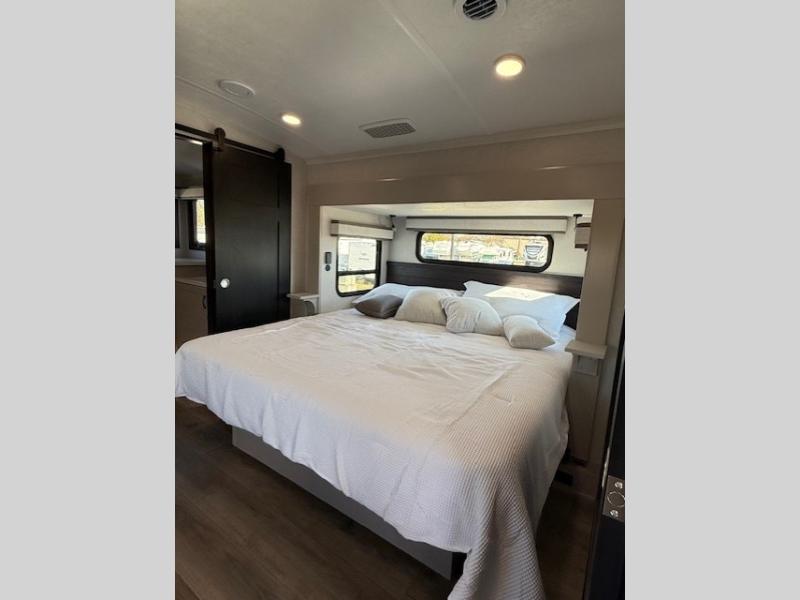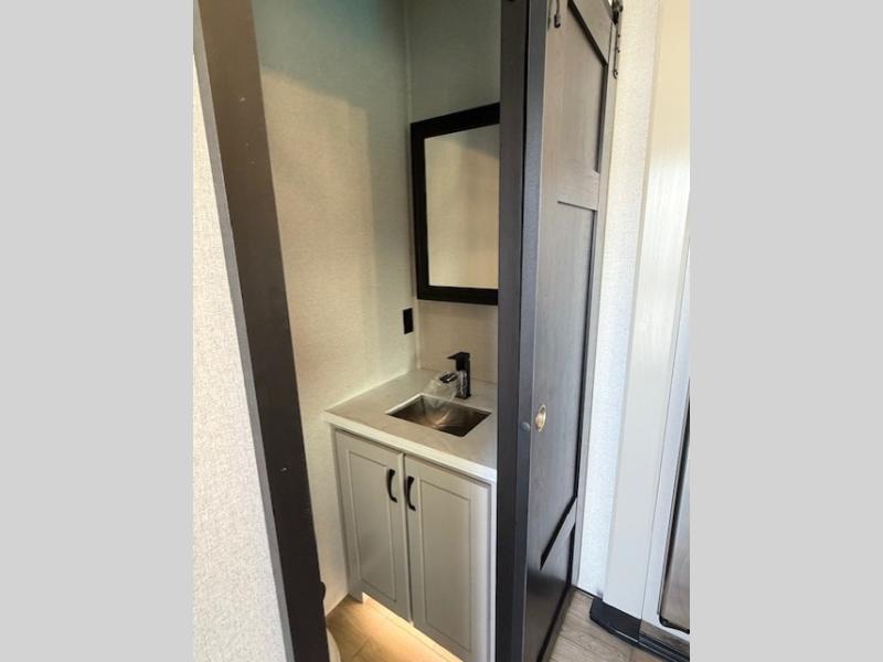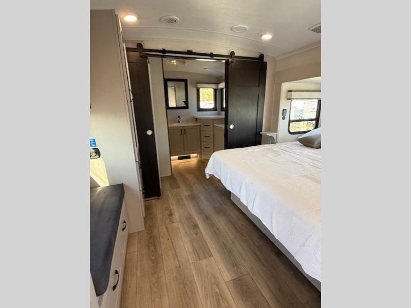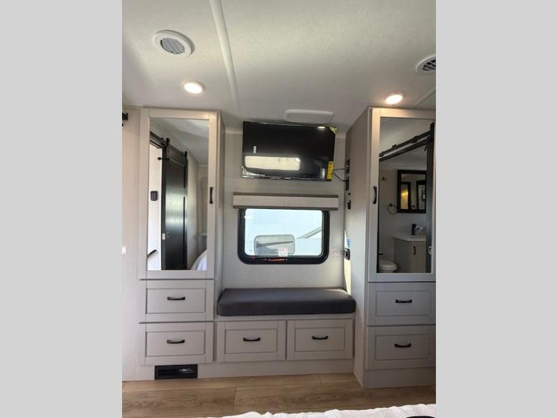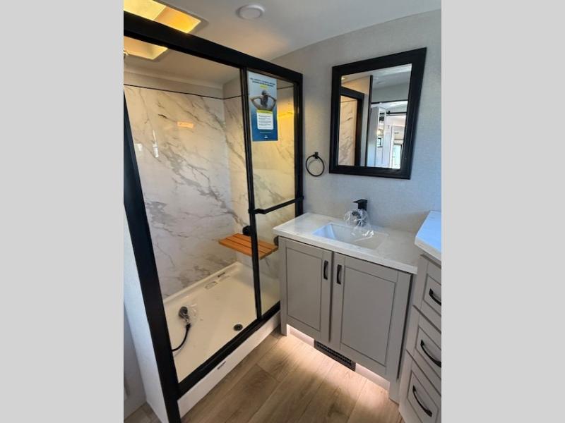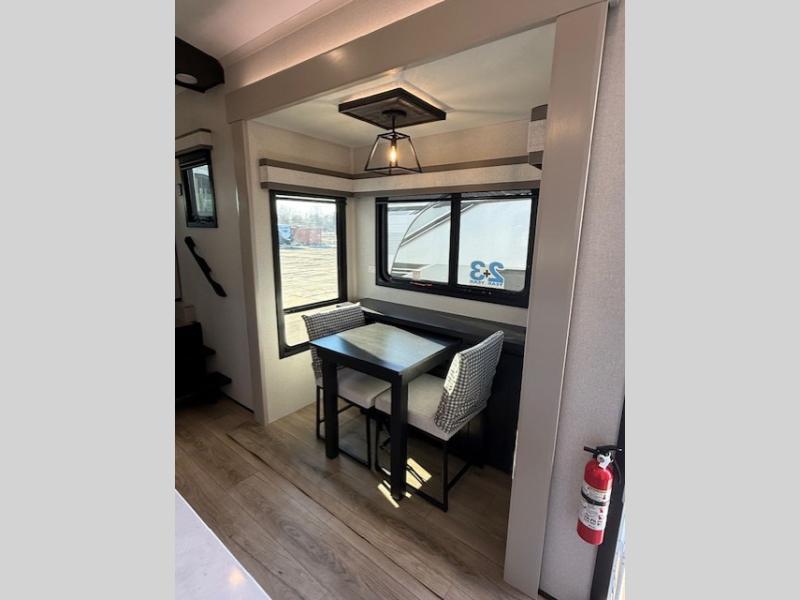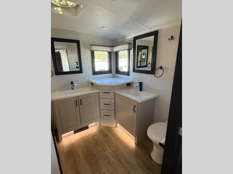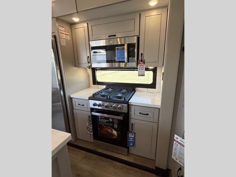 Entertainment can be found throughout this fifth wheel from the front living area with a 50" Smart LED HDTV with fully digital HDMI output and home entertainment system with subwoofer including a fireplace below that you can enjoy while relaxing on theater seats and two tri-fold sofas, a 32" TV in the middle kitchen and there is a bedroom 32" TV. You might even like to add the tailgate TV option along the exterior. Back inside the kitchen, the cook will love the center island, the pantry, the residential refrigerator, and the roll-top dinette. The half bath is a few steps away as an added convenience. The master bedroom includes a king bed slide, a bench, two wardrobes and a sliding door into the bathroom which offers two sinks, a space prepped for a washer/dryer option, and a walk-in shower. And don't forget about the exterior features such as the outside kitchen for more choices when making meals, the storage for your outdoor gear and chairs, and two awnings with integrated LED lighting.