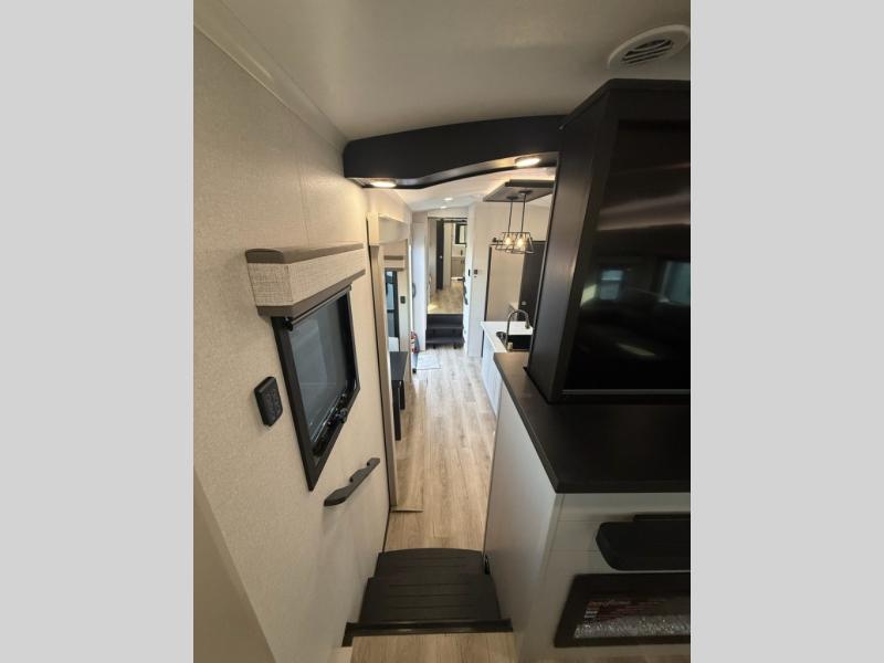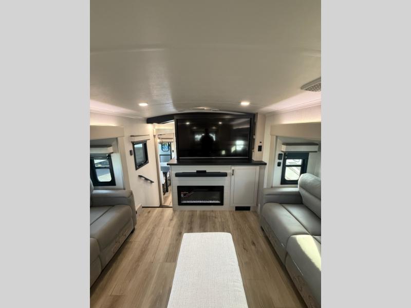 Entertainment can be found throughout this fifth wheel from the front living area with a 50" Smart LED HDTV with fully digital HDMI output and home entertainment system with subwoofer including a fireplace below that you can enjoy while relaxing on theater seats and two tri-fold sofas, a 32" TV in the middle kitchen and there is a bedroom 32" TV. You might even like to add the tailgate TV option along the exterior. Back inside the kitchen, the cook will love the center island, the pantry, the residential refrigerator, and the roll-top dinette. The half bath is a few steps away as an added convenience. The master bedroom includes a king bed slide, a bench, two wardrobes and a sliding door into the bathroom which offers two sinks, a space prepped for a washer/dryer option, and a walk-in shower. And don't forget about the exterior features such as the outside kitchen for more choices when making meals, the storage for your outdoor gear and chairs, and two awnings with integrated LED lighting.