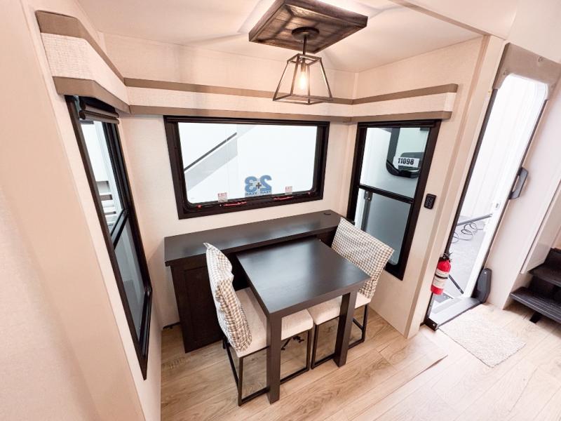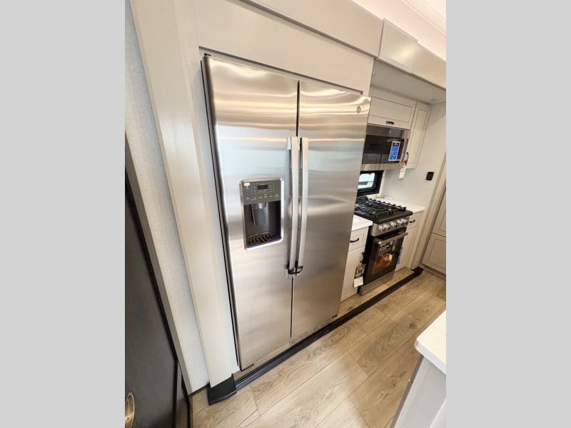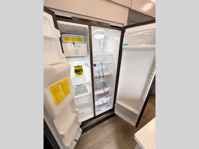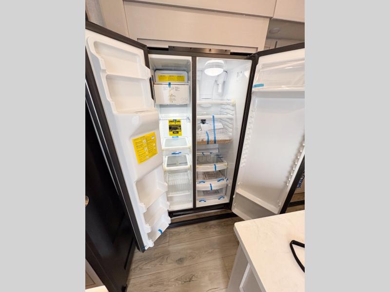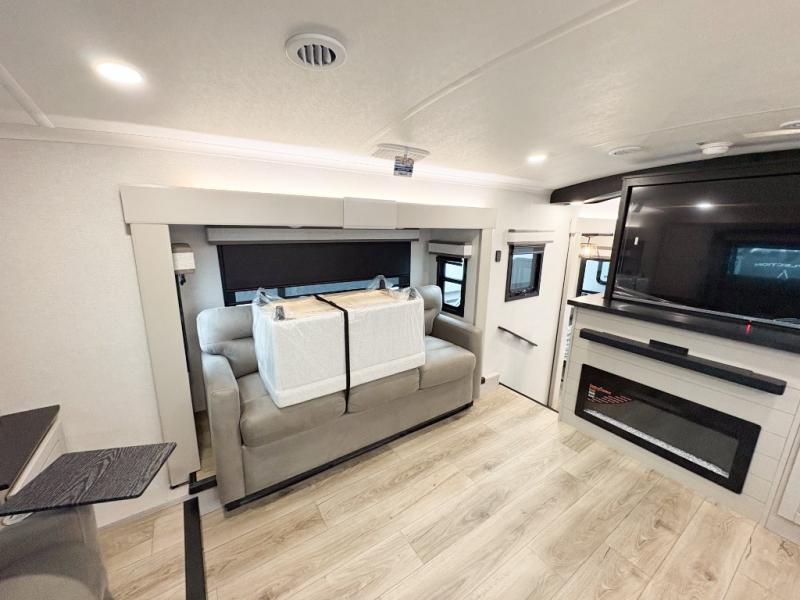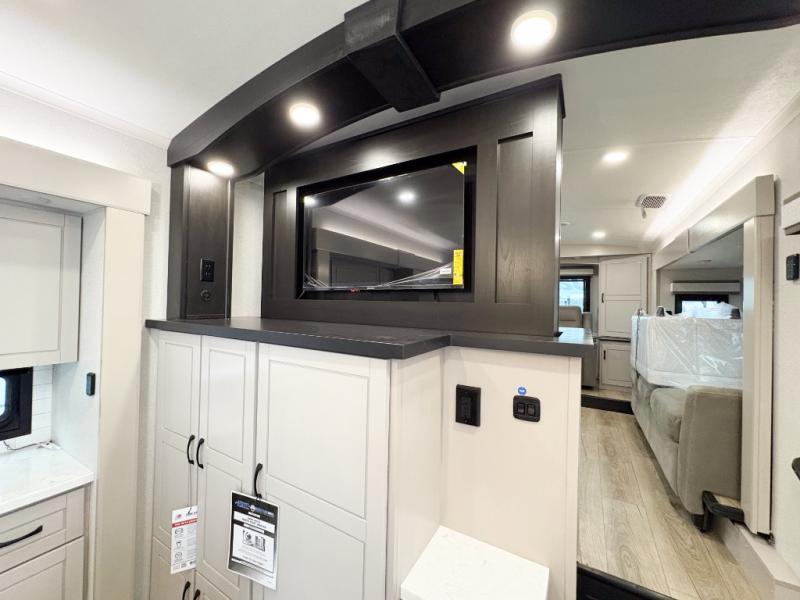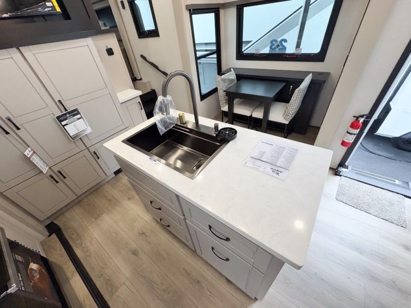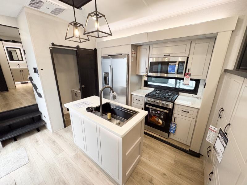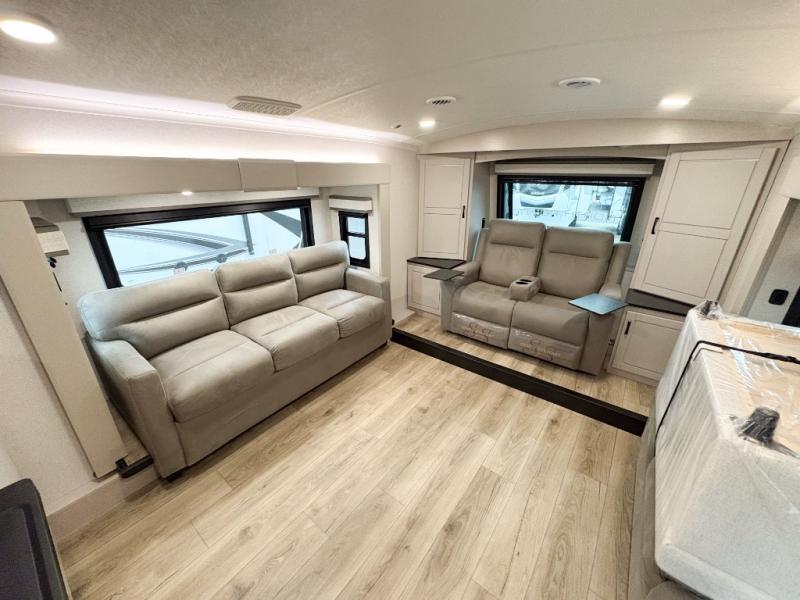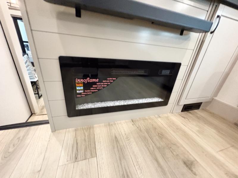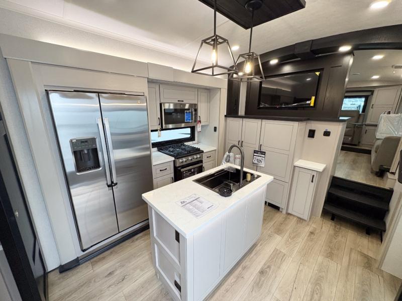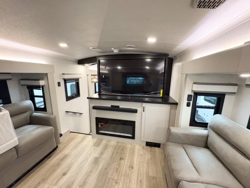 Entertainment can be found throughout this fifth wheel from the front living area with a 50" Smart LED HDTV with fully digital HDMI output and home entertainment system with subwoofer including a fireplace below that you can enjoy while relaxing on theater seats and two tri-fold sofas, a 32" TV in the middle kitchen and there is a bedroom 32" TV. You might even like to add the tailgate TV option along the exterior. Back inside the kitchen, the cook will love the center island, the pantry, the residential refrigerator, and the roll-top dinette. The half bath is a few steps away as an added convenience. The master bedroom includes a king bed slide, a bench, two wardrobes and a sliding door into the bathroom which offers two sinks, a space prepped for a washer/dryer option, and a walk-in shower. And don't forget about the exterior features such as the outside kitchen for more choices when making meals, the storage for your outdoor gear and chairs, and two awnings with integrated LED lighting.