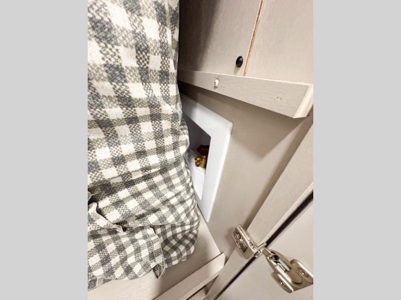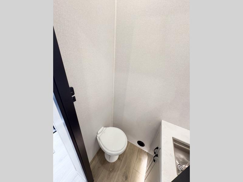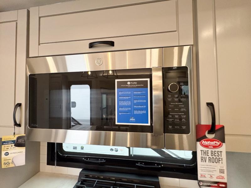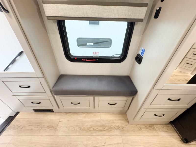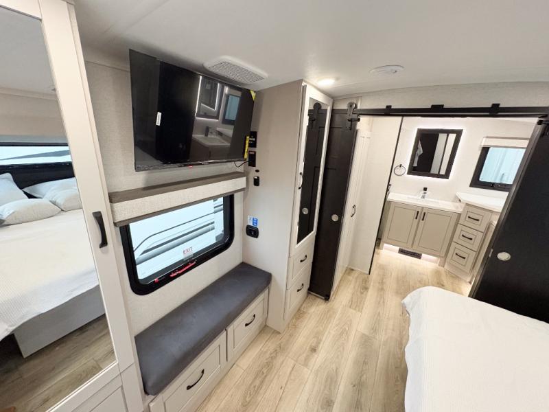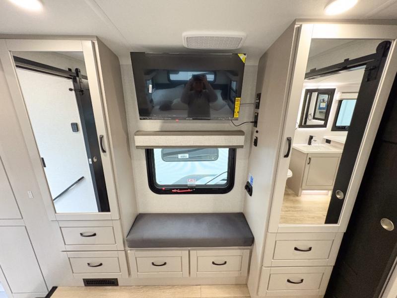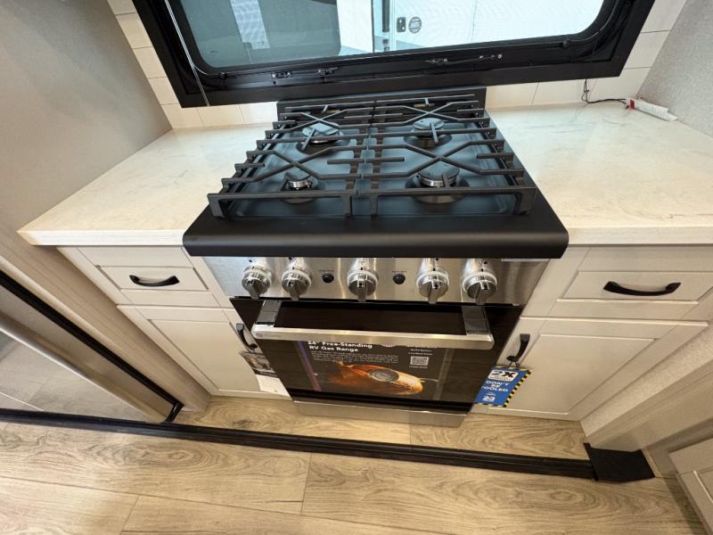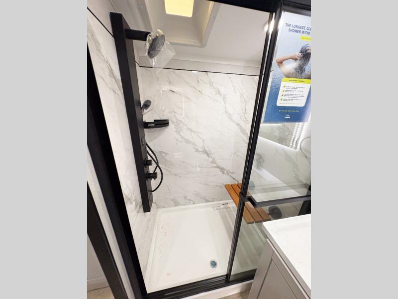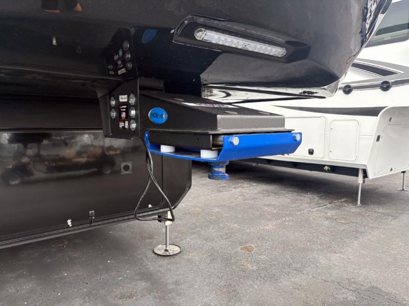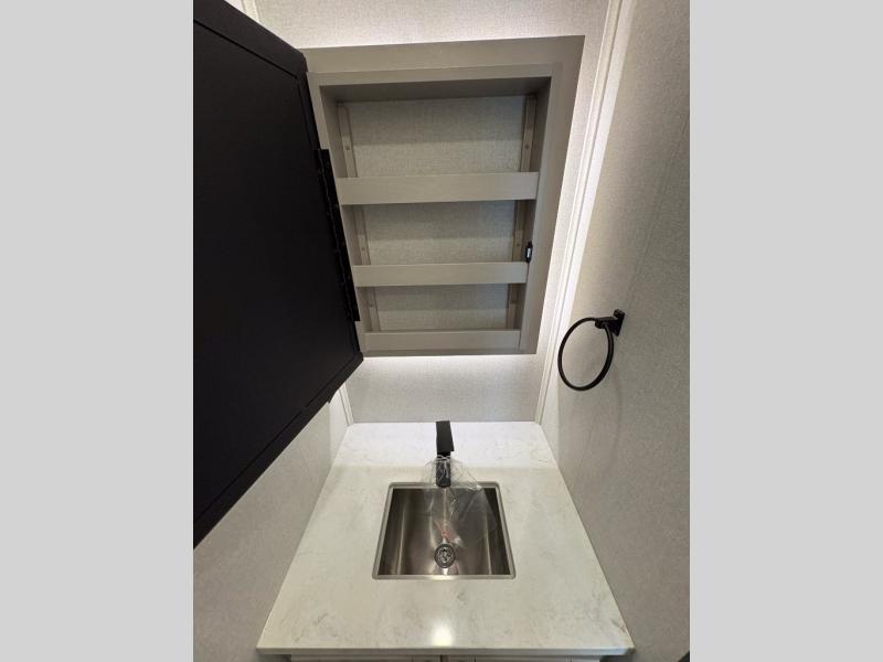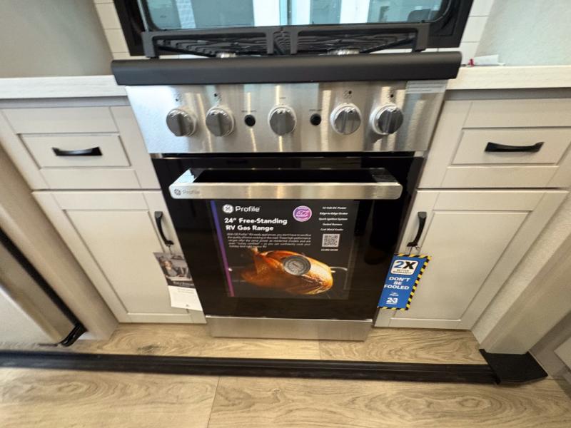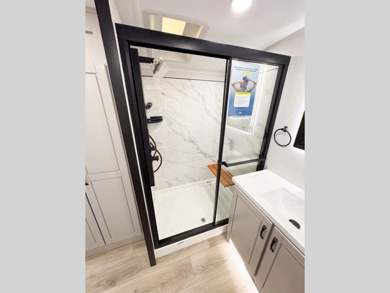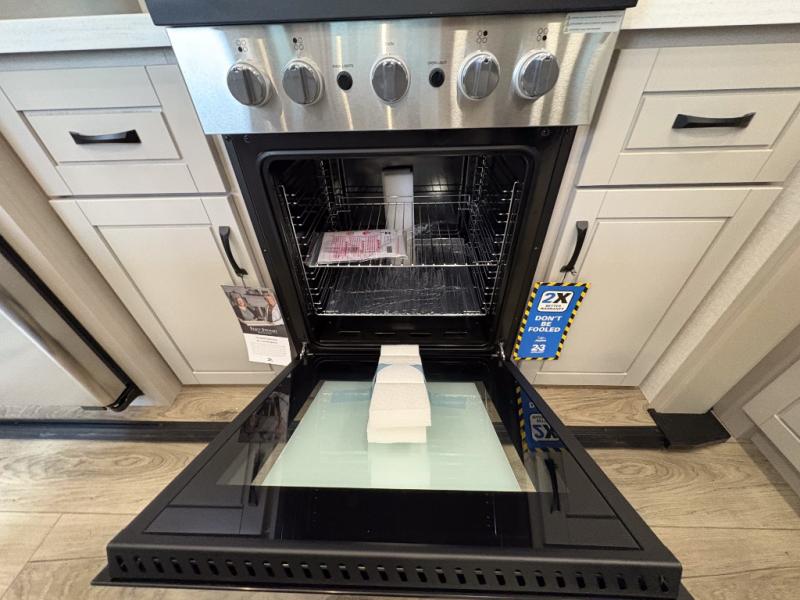 Entertainment can be found throughout this fifth wheel from the front living area with a 50" Smart LED HDTV with fully digital HDMI output and home entertainment system with subwoofer including a fireplace below that you can enjoy while relaxing on theater seats and two tri-fold sofas, a 32" TV in the middle kitchen and there is a bedroom 32" TV. You might even like to add the tailgate TV option along the exterior. Back inside the kitchen, the cook will love the center island, the pantry, the residential refrigerator, and the roll-top dinette. The half bath is a few steps away as an added convenience. The master bedroom includes a king bed slide, a bench, two wardrobes and a sliding door into the bathroom which offers two sinks, a space prepped for a washer/dryer option, and a walk-in shower. And don't forget about the exterior features such as the outside kitchen for more choices when making meals, the storage for your outdoor gear and chairs, and two awnings with integrated LED lighting.