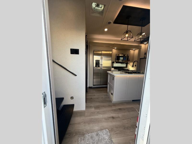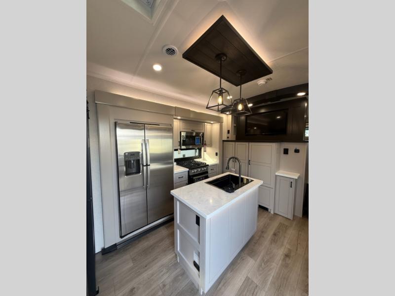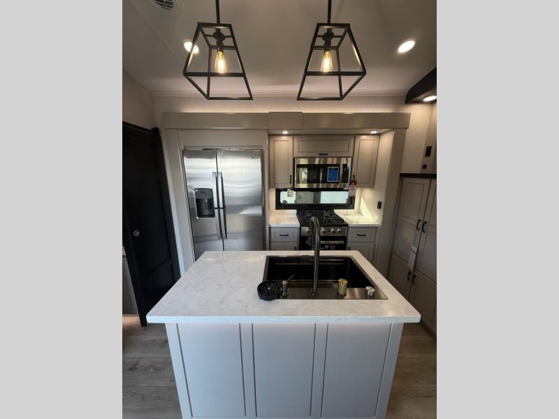 Entertainment can be found throughout this fifth wheel from the front living area with a 4K Smart LED HDTV with fully digital HDMI output and home entertainment system with subwoofer including a fireplace below that you can enjoy while relaxing on theater seats and two tri-fold sofas, a 40" TV in the middle kitchen and there is a bedroom 32" TV. Back inside the kitchen, the cook will love the center island, the pantry, the residential refrigerator, and the roll-top dinette. The half bath is a few steps away as an added convenience. The master bedroom includes a king bed slide, a bench, two wardrobes and a sliding door into the bathroom which offers two sinks, a space prepped for a washer/dryer option, and a walk-in shower. And don't forget about the exterior features such as the outside kitchen for more choices when making meals, the storage for your outdoor gear and chairs, and two awnings with integrated LED lighting.
