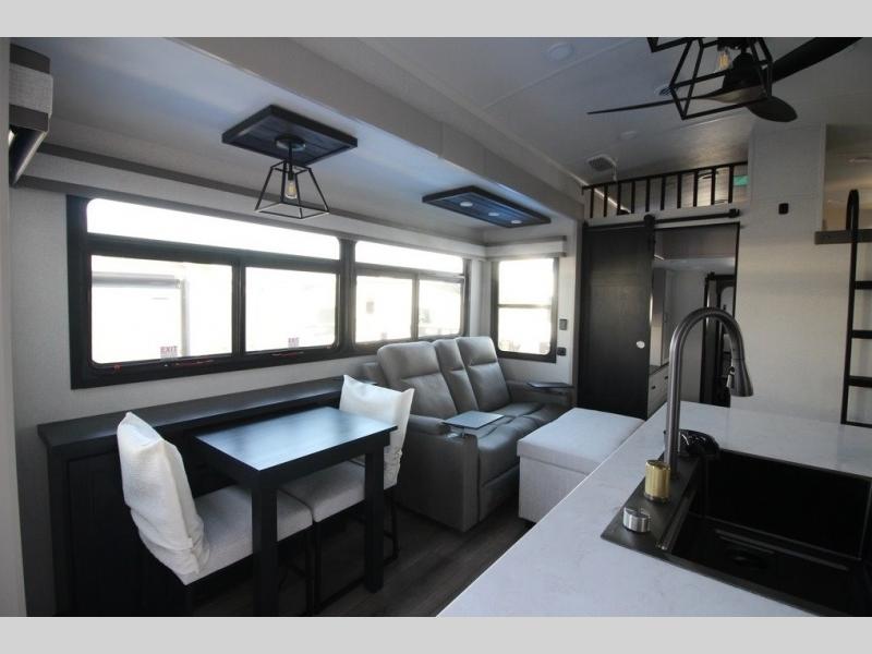 Finding the perfect RV park or campground is all you have to do, then you can load up and hit the road whether you are a full-timer or weekend warrior. The two electric awnings and the three slides are easy to set up and close, and you will have lots of interior and exterior storage to bring everything you might need. The kitchen offers a residential refrigerator and 24" stove, a 30" residential microwave, a kitchen island, a pantry and a pull-out countertop. You can relax on the tri-fold sofa and the theater seats while watching your shows on the 50" Smart LED HDTV with fully digital HDMI output and home entertainment system with subwoofer plus there is a fireplace below. Dine at the roll-top dinette table, or you can work from here as well. The front bedroom offers a king bed slide and a flip-top dresser with 32" TV, plus access to a spacious private front bath including a walk-in closet, washer/dryer prep, and more.