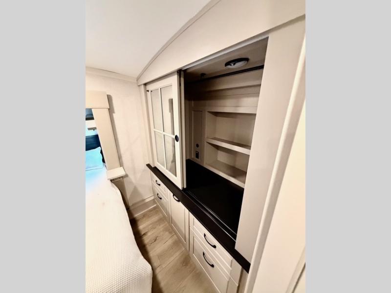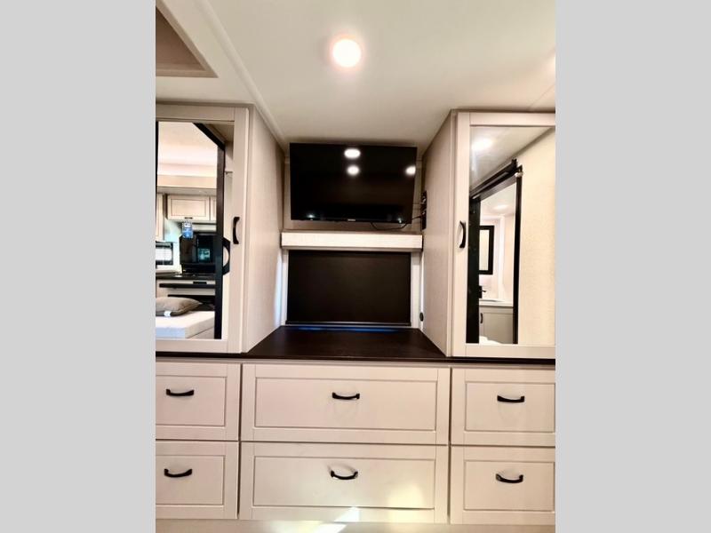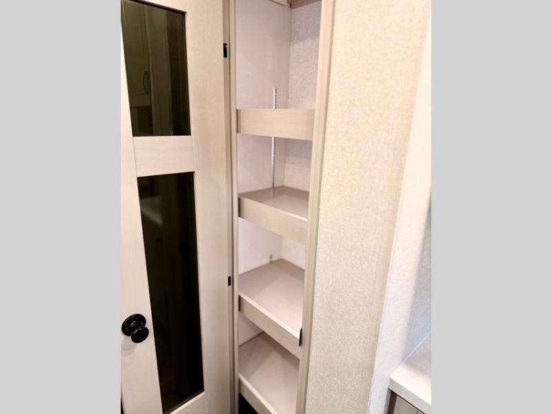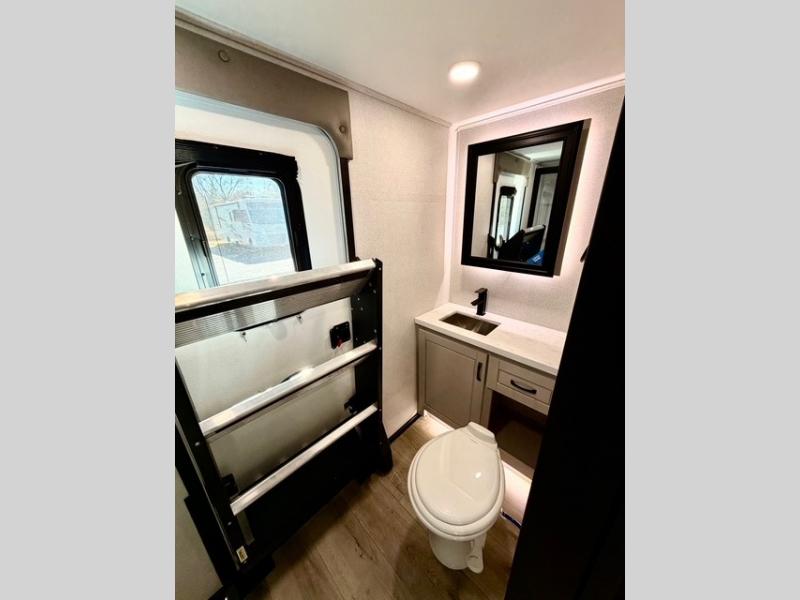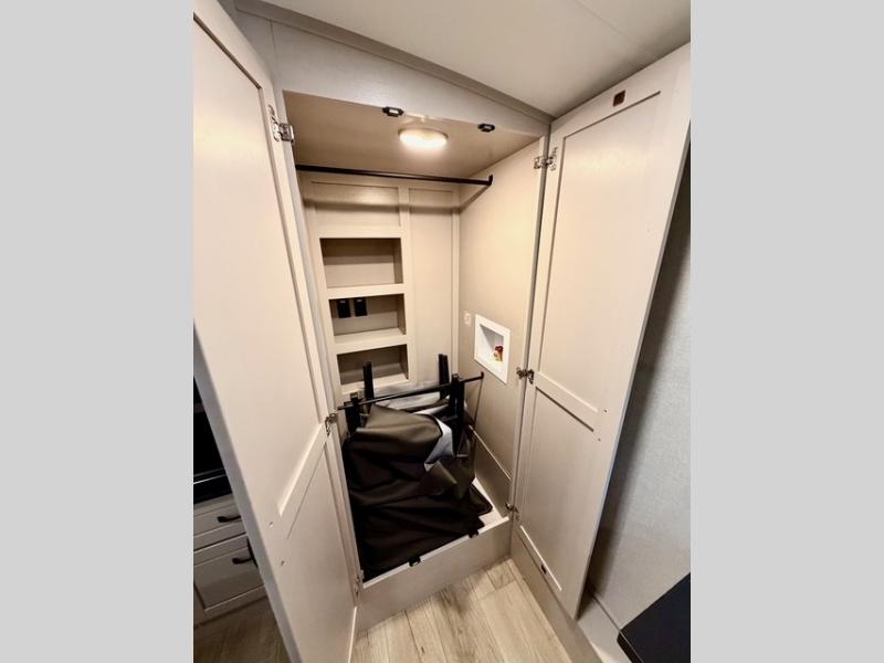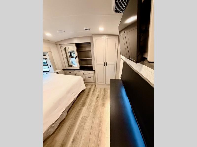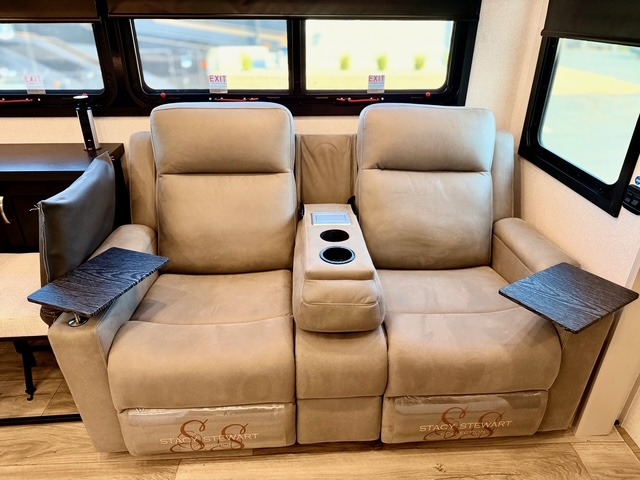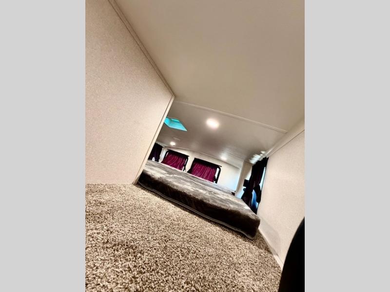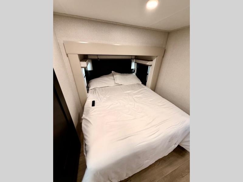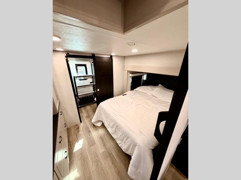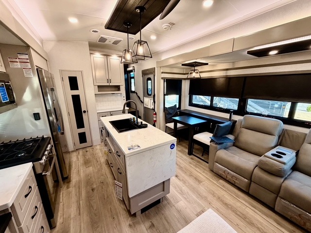 With two bedrooms plus a loft, there aren't many fifth wheels that can sleep as many people in as much comfort as this Jayco North Point! Up front is a private bedroom suite with a king bed and next to the bedroom is a full bathroom, while towards the rear you'll find a second bedroom with a queen bed. This bedroom also has an adjacent bathroom, conveniently all the way to the rear so it has its own entry door to the outside. There's also a loft with three bed mats which will be perfect for kids. In the center of it all you'll find a great living space, with a fully equipped kitchen and plenty of room for everyone to hang out. Relax in the theater seats across from the entertainment center, which features a 50" Smart LED HDTV and a fireplace for cozy evenings.