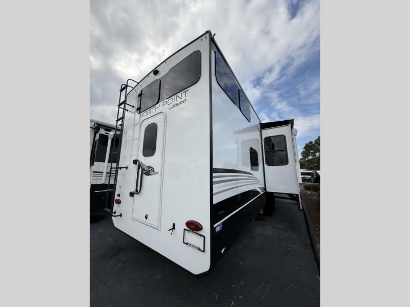 With any North Point fifth wheel by Jayco you begin with a strong foundation with a custom frame, designed and sized specifically to best support each unit. Constructed with Stronghold VBL™ aluminum framed, vacuum bond laminated walls and the Magnum Truss™ XL6™ roof system with an Alpha roof membrane system, which is the strongest tested roof in the industry. The 5-Star Handling package is included with Uniroyal tires, a MORryde rubber pin box, Dexter axles with Nev-R-Adjust brakes, MORryde CRE-3000 rubberized suspension and wet bolt fasteners and bronze bushings. The interior has handcrafted hardwood glazed doors and drawers, vinyl flooring throughout, an integrated under-mount sink in the main bathroom, plus so much more you just have to see one to believe it all!