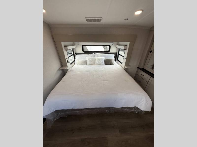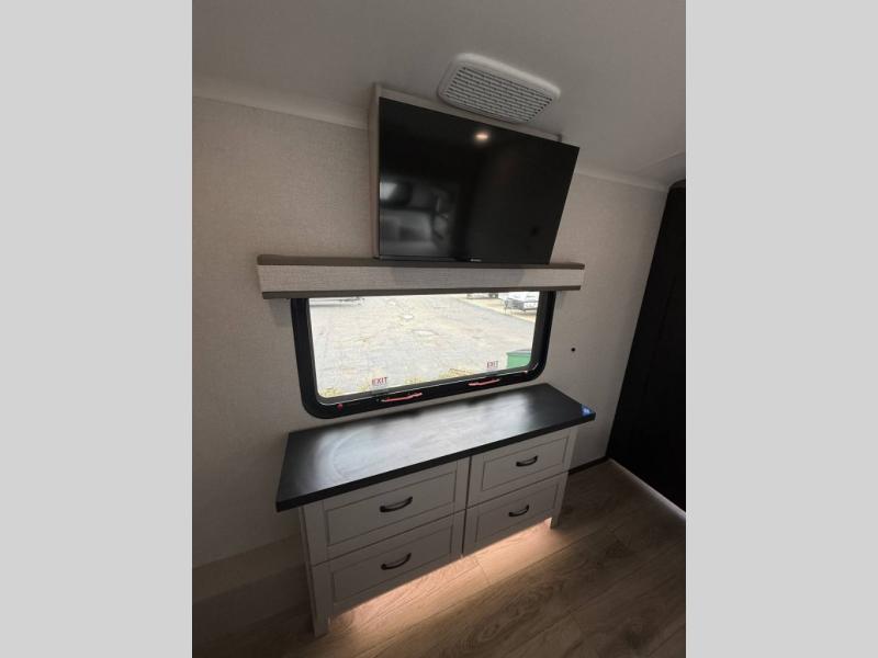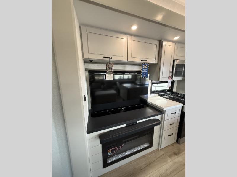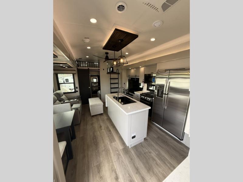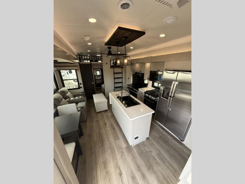 With two bedrooms plus a loft, there aren't many fifth wheels that can sleep as many people in as much comfort as this Jayco North Point! Up front is a private bedroom suite with a king bed and next to the bedroom is a full bathroom, while towards the rear you'll find a second bedroom with a queen bed. This bedroom also has an adjacent bathroom, conveniently all the way to the rear so it has its own entry door to the outside. There's also a loft with three bed mats which will be perfect for kids. In the center of it all you'll find a great living space, with a fully equipped kitchen and plenty of room for everyone to hang out. Relax in the theater seats across from the entertainment center, which features a 50" Smart LED HDTV and a fireplace for cozy evenings.