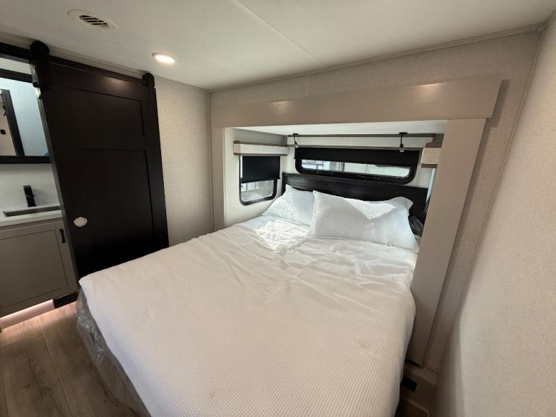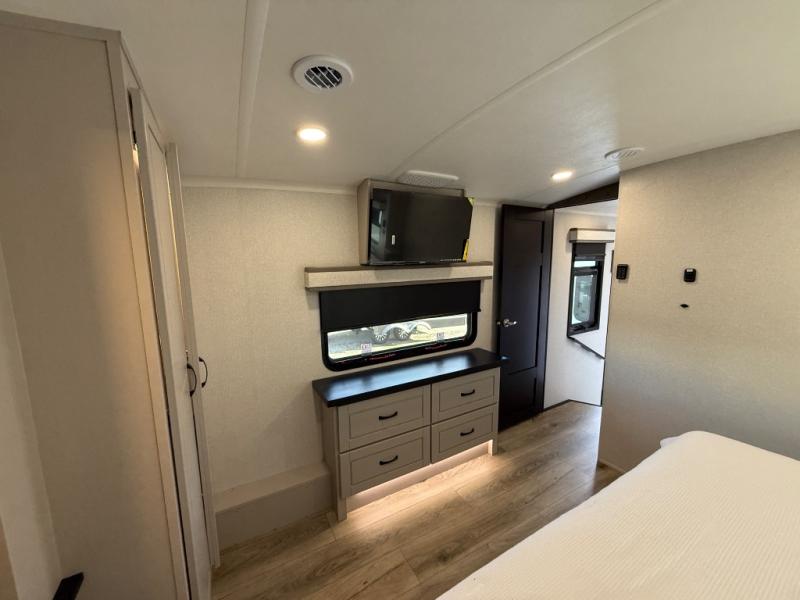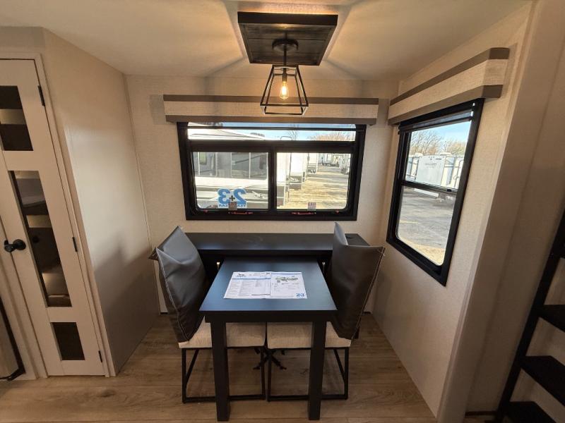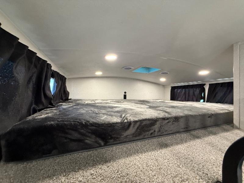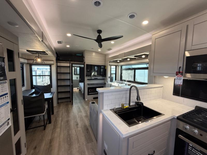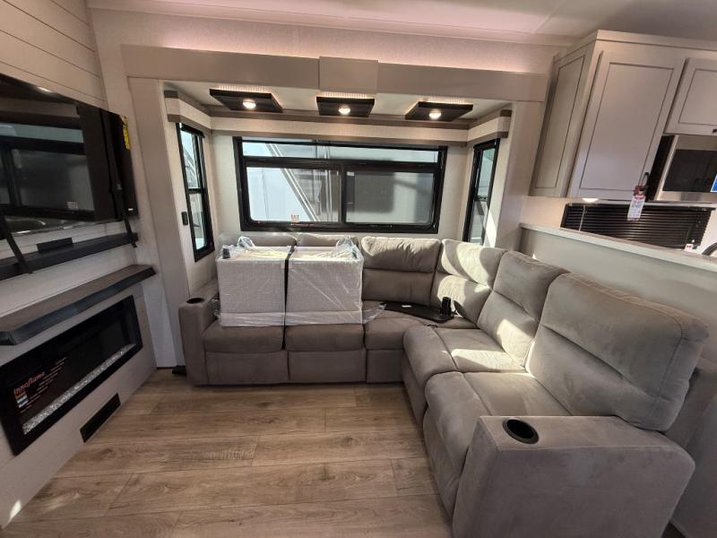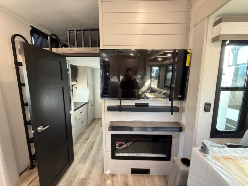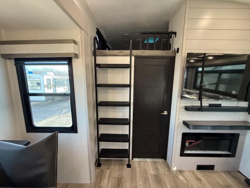 With two bedrooms plus a loft, there aren't many fifth wheels that can sleep as many people in as much comfort as this Jayco North Point! Up front is a private bedroom suite with a king bed and next to the bedroom is a full bathroom, while towards the rear you'll find a second bedroom with a queen bed. This bedroom also has an adjacent bathroom, conveniently all the way to the rear so it has its own entry door to the outside. There's also a loft with two bed mats which will be perfect for kids. In the center of it all you'll find a great living space, with a fully equipped kitchen and plenty of room for everyone to hang out. Relax in the L-shaped sofa across from the fireplace for cozy evenings.