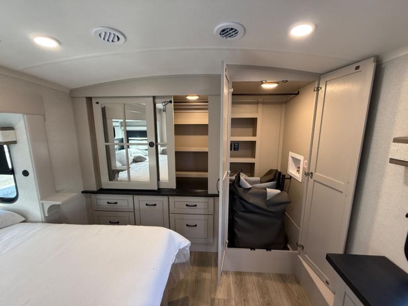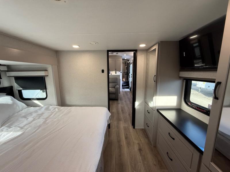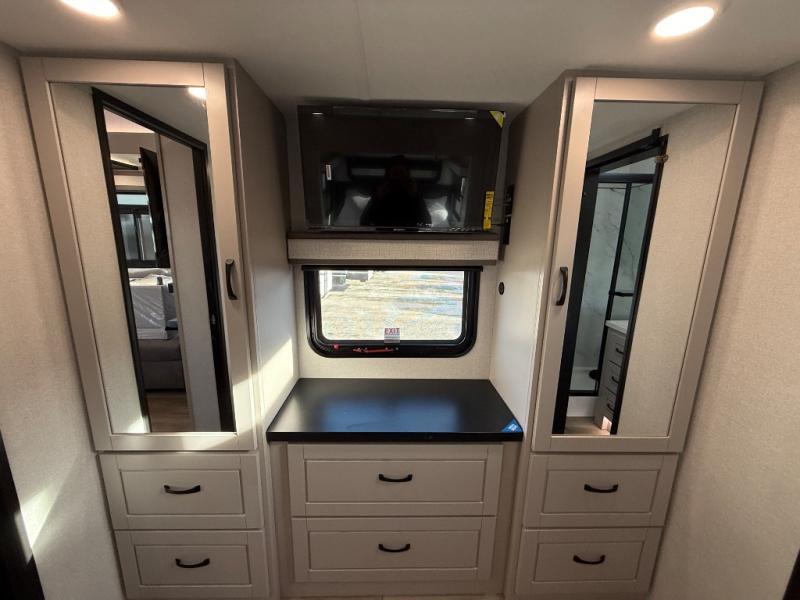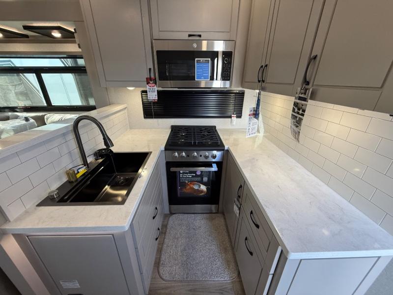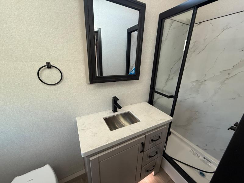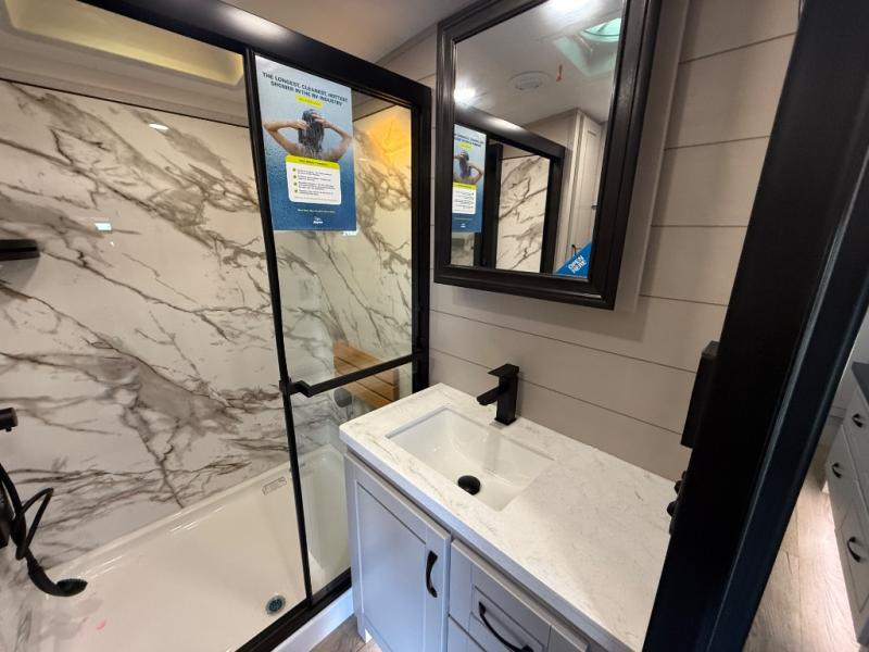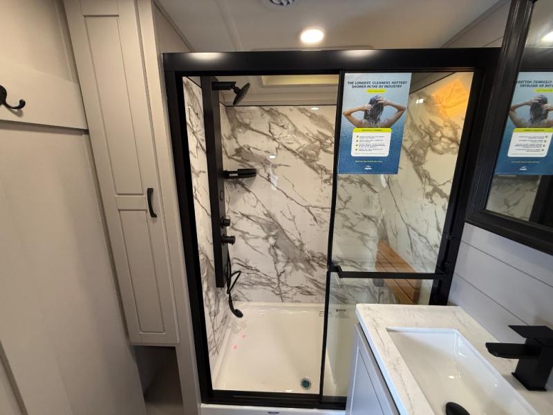With any North Point fifth wheel by Jayco you begin with a strong foundation with a custom frame, designed and sized specifically to best support each unit. Constructed with Stronghold VBL™ aluminum framed, vacuum bond laminated walls and the Magnum Truss™ XL6™ roof system with an Alpha roof membrane system, which is the strongest tested roof in the industry. The 5-Star Handling package is included with H-rated tires with TPMS, a MORryde rubber pin box, Dexter axles with Nev-R-Adjust brakes, MORryde CRE-3000 rubberized suspension and wet bolt fasteners and bronze bushings. The interior has handcrafted hardwood glazed doors and drawers, vinyl flooring throughout, an integrated under-mount sink in the main bathroom, plus so much more you just have to see one to believe it all!