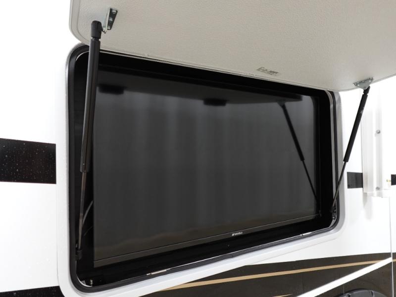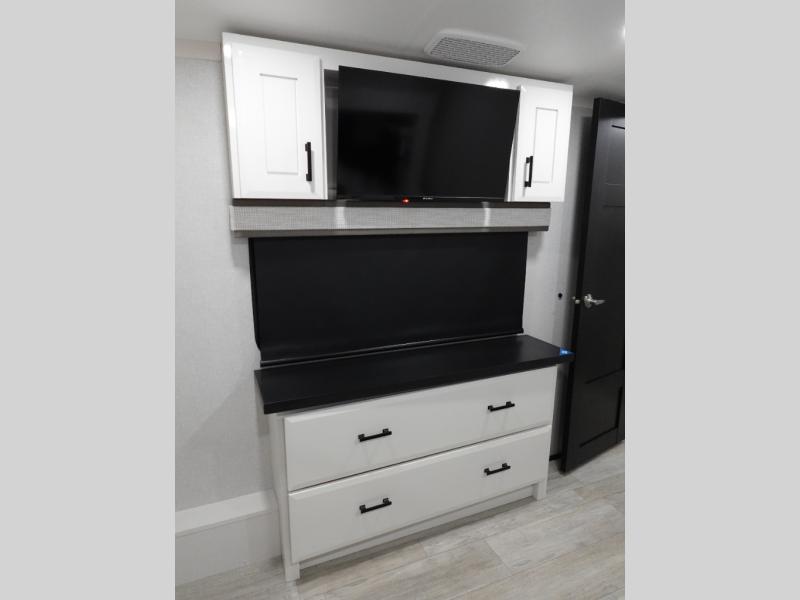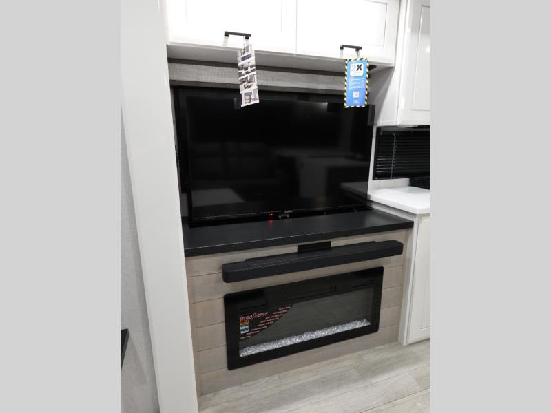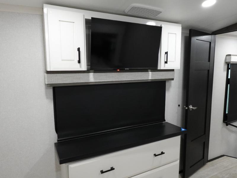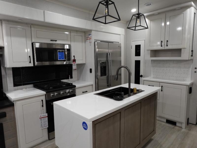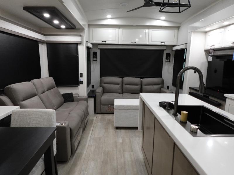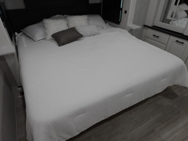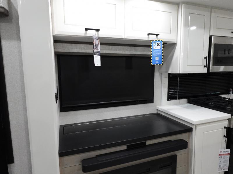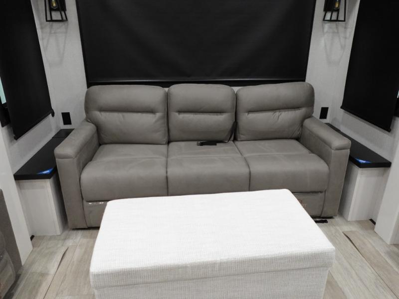 Trips to the lake are made comfortable in this triple slide out fifth wheel. Once you arrive at the campground, set up the two power awnings with LED lights, and there is an exterior TV for the big game. Head inside to relax on the theater seats directly across from the TV and fireplace, or play a game at the roll-top dinette. The chef of your group will love this kitchen with its residential refrigerator, kitchen island, and pantry, plus additional storage for canned goods or paper products. The full bath will allow you to stay clean throughout your trip, and you'll find a residential style backsplash in the bath, plus a walk-in shower. Nothing says luxury like your own king bed slide out in the front bedroom, a large front closet with hamper and drawers for wrinkle-free clothes, and a flip-up dresser featuring a 32" TV!