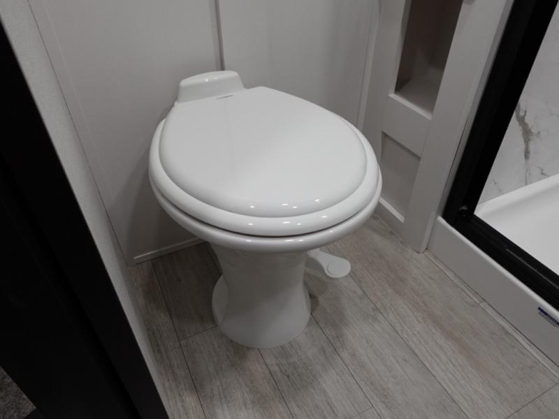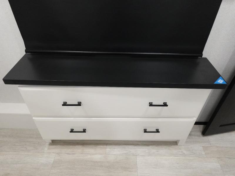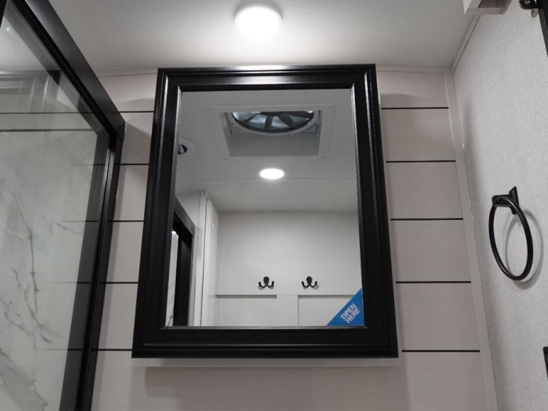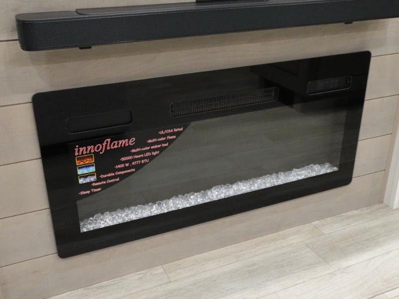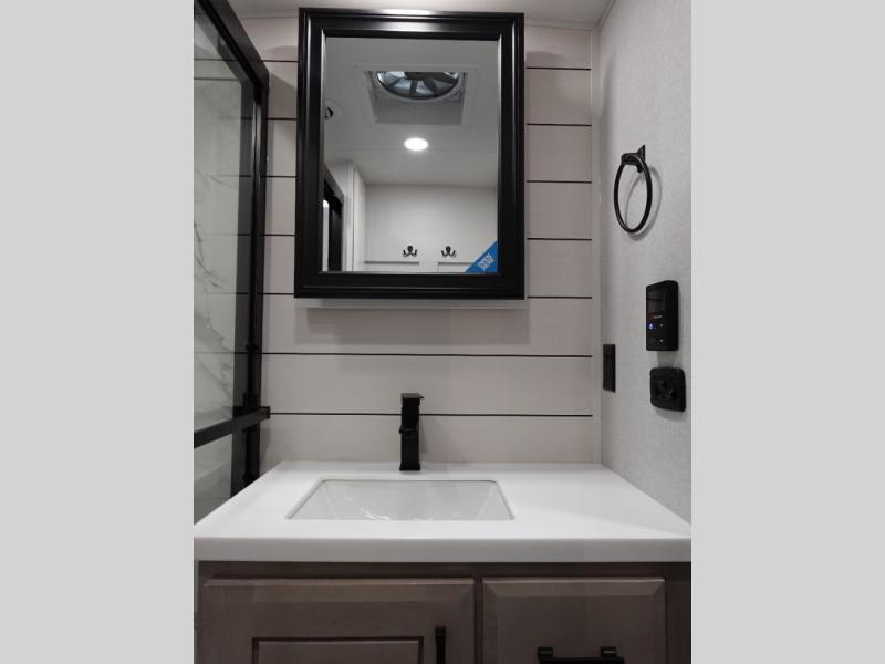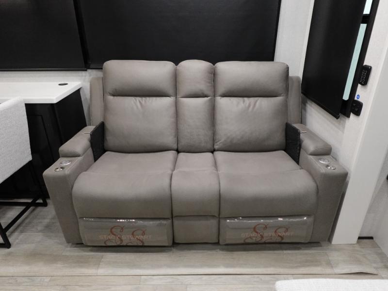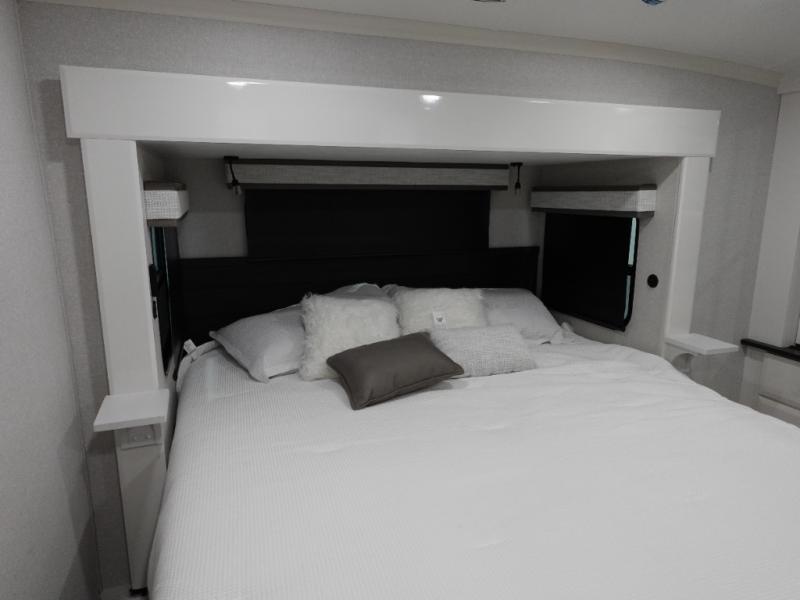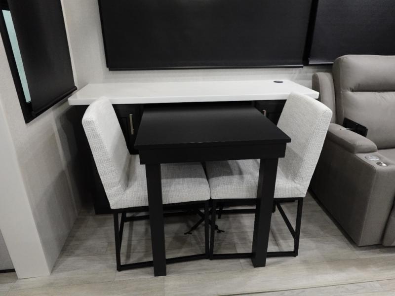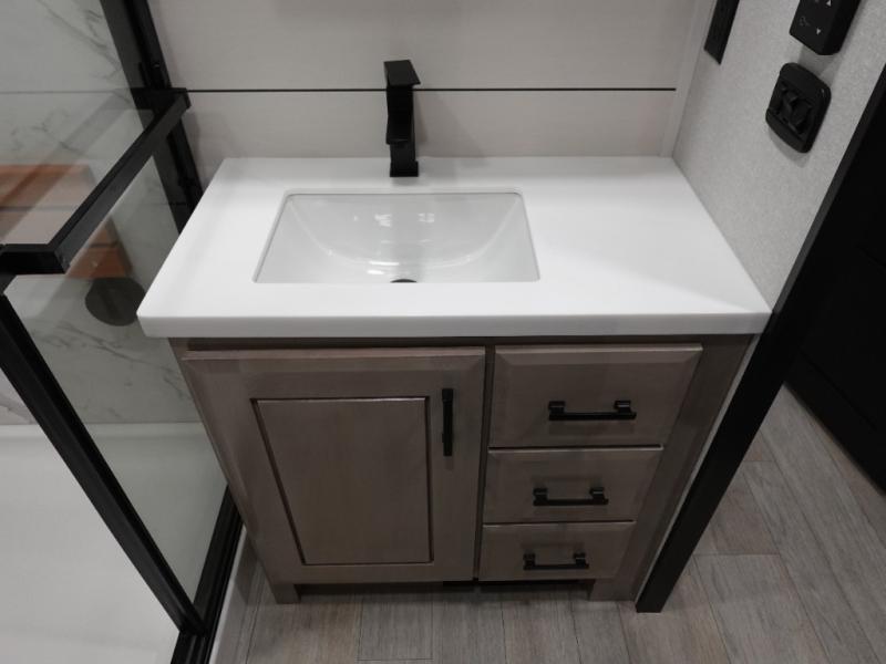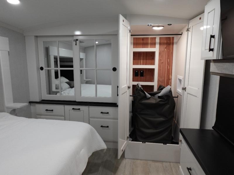 Trips to the lake are made comfortable in this triple slide out fifth wheel. Once you arrive at the campground, set up the two power awnings with LED lights, and there is an exterior TV for the big game. Head inside to relax on the theater seats directly across from the TV and fireplace, or play a game at the roll-top dinette. The chef of your group will love this kitchen with its residential refrigerator, kitchen island, and pantry, plus additional storage for canned goods or paper products. The full bath will allow you to stay clean throughout your trip, and you'll find a residential style backsplash in the bath, plus a walk-in shower. Nothing says luxury like your own king bed slide out in the front bedroom, a large front closet with hamper and drawers for wrinkle-free clothes, and a flip-up dresser featuring a 32" TV!