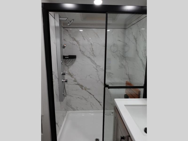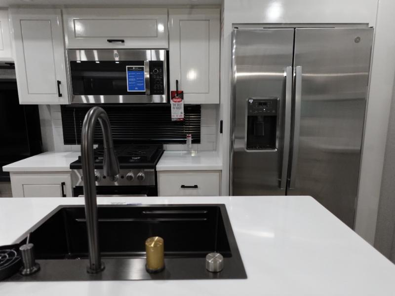 Each Pinnacle fifth wheel features Stronghold VBL lamination for the lightest, yet strongest construction in the RV industry. Add that to the Magnum Truss XL6 roof system and Climate Shield zero-degree tested weather protection and you'll be enjoying your fifth wheel for years to come. Some of the exterior conveniences you will appreciate are the Keyed-Alike lock system, the fully enclosed, universal docking center, and the 6-point hydraulic auto-leveling system for quick and easy set up. The 5 Star Handling Package will make towing a fifth wheel a walk in the park, and the two Whisper Quiet A/C units will keep you comfortable during the hot summer months. Inside, you'll enjoy the residential "Do it all" sink with pull-out kitchen faucet, glass rinse, and vegetable rinse, the handcrafted hardwood glazed cabinetry, the vinyl flooring throughout, plus many more comforts. There is even a central vacuum system, a wireless remote control system, USB ports throughout, plus many more conveniences to make each trip enjoyable.