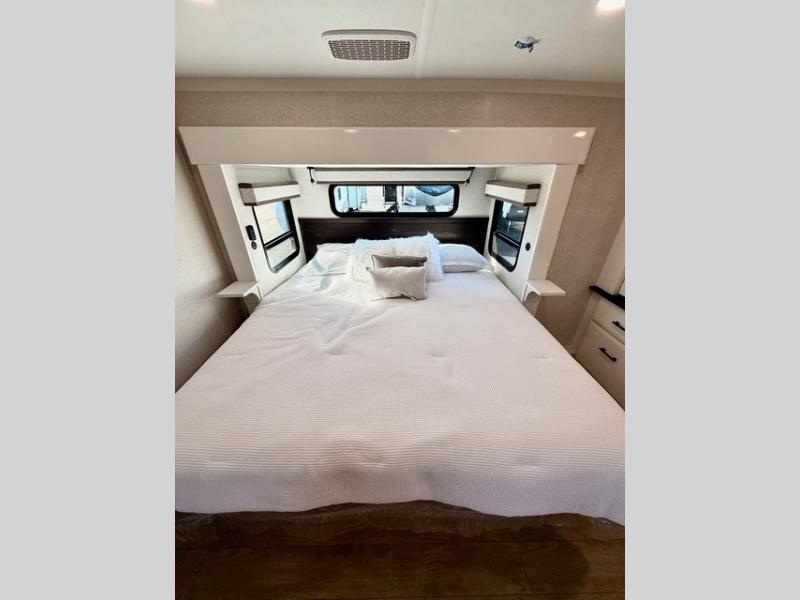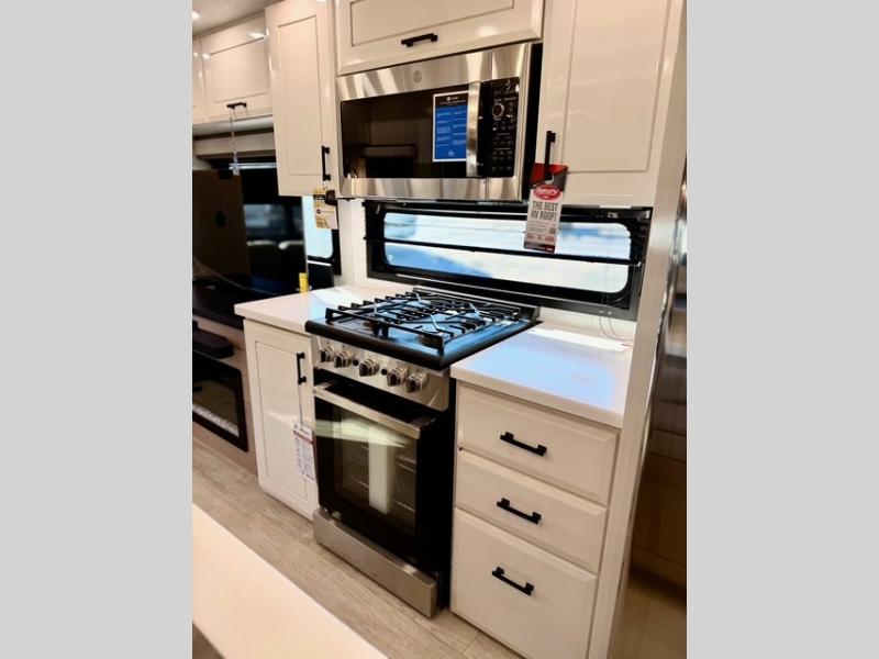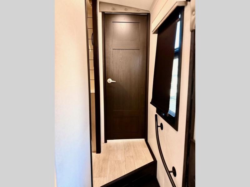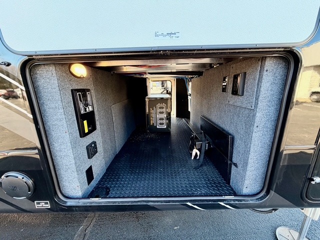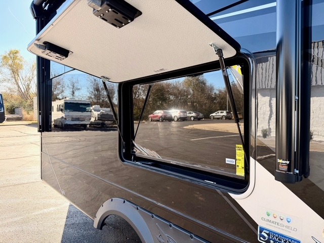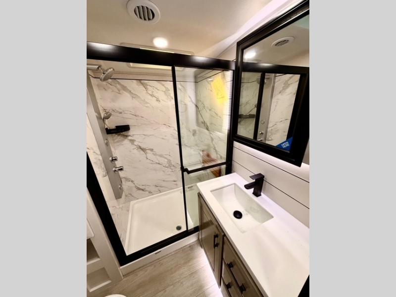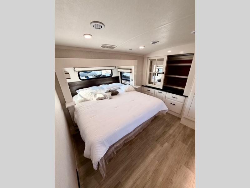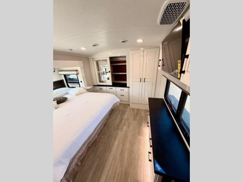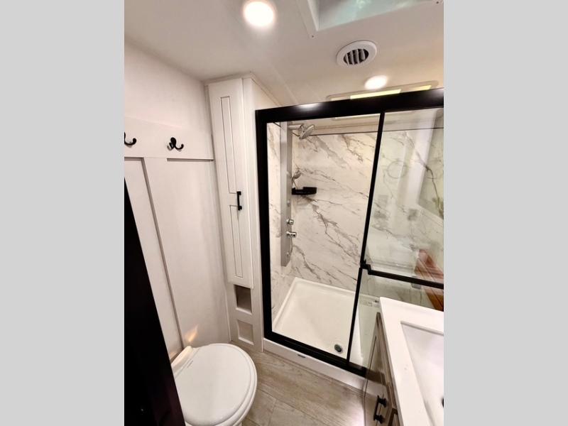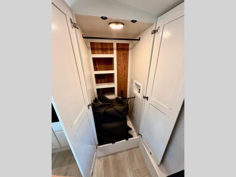 The full bathroom includes a residential-style backsplash, linen storage, and a walk-in shower with a built-in seat for added comfort. The front master suite boasts a king bed slide out, a large closet with hamper and drawers to keep clothes organized, and a flip-up dresser featuring a 32" TV for private entertainment. Additional conveniences include a shoe garage near the entrance, keeping the living space tidy and organized for all your gear.