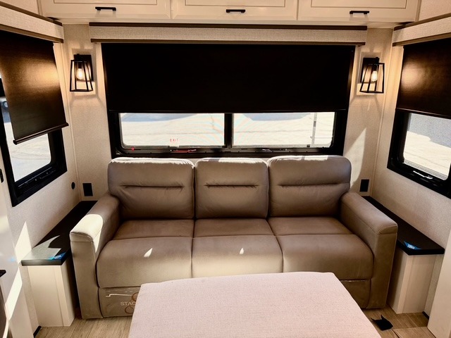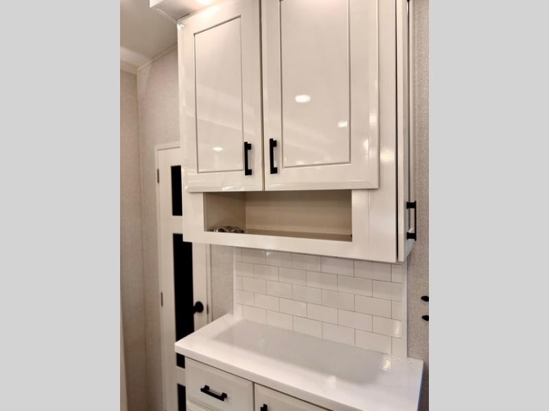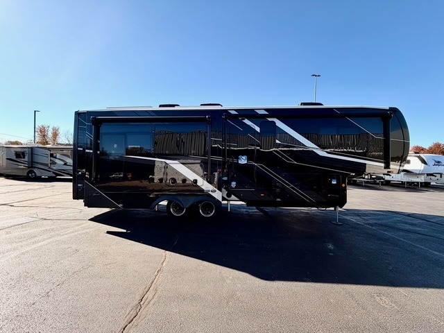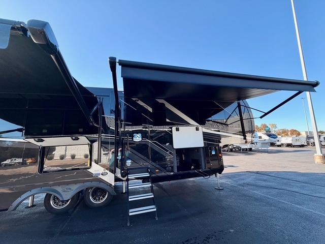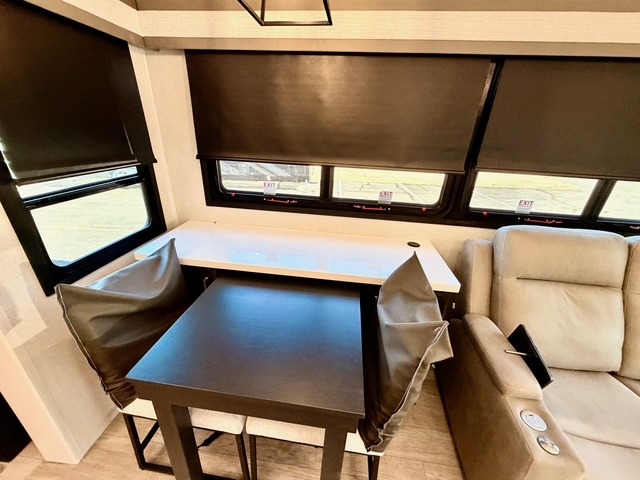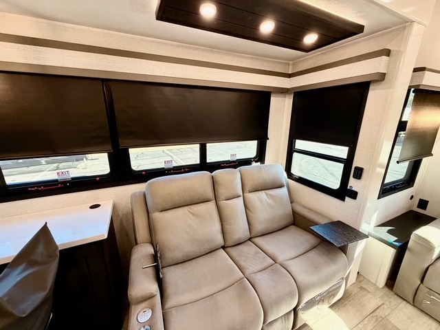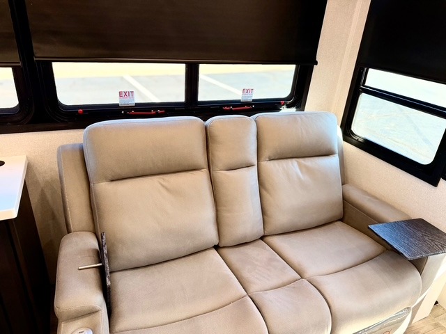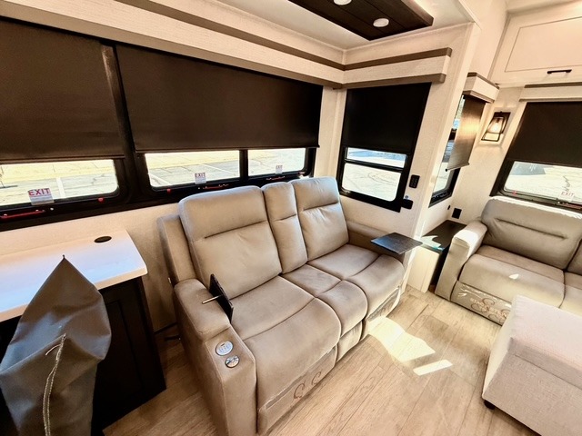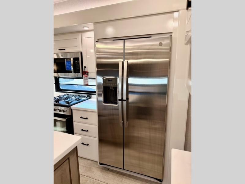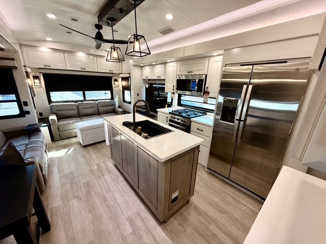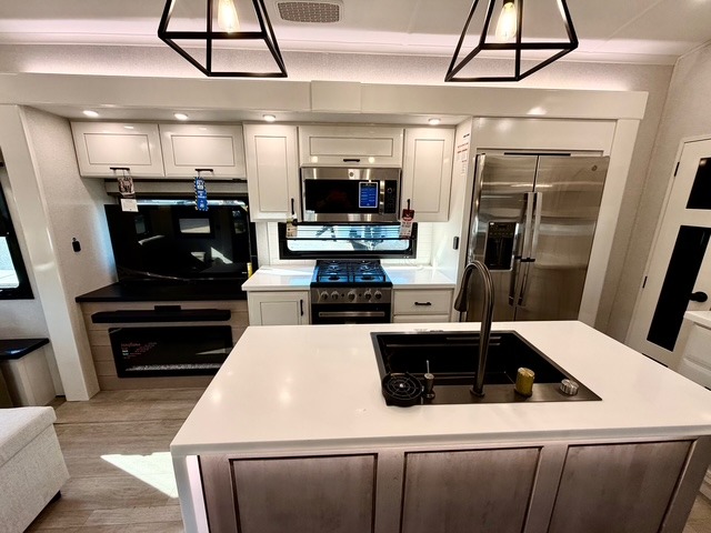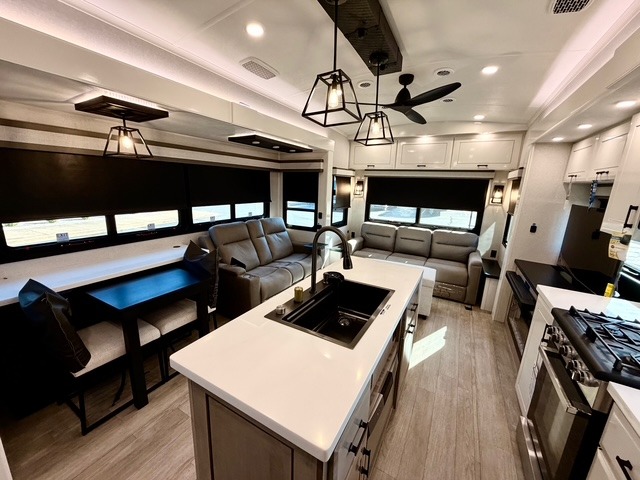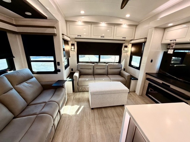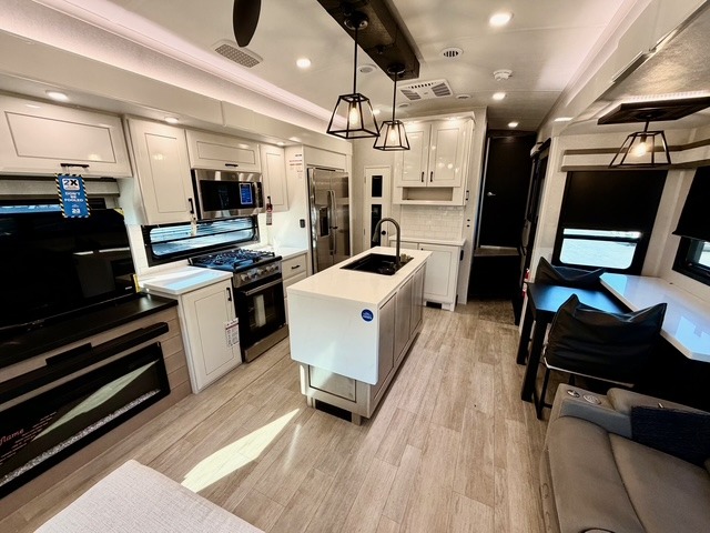 Experience luxury camping in this spacious triple slide out fifth wheel, perfect for extended trips or weekend getaways. Once you arrive at the campground, easily set up the two power awnings with integrated LED lighting to create an outdoor living space, complete with an exterior TV for movies or the big game. Inside, the living area is designed for comfort and convenience, featuring theater seating directly across from the entertainment center with a fireplace, plus a tri-fold sofa and roll-top dinette for additional seating or sleeping space. The chef in your group will appreciate the fully equipped kitchen, which includes a large residential refrigerator, kitchen island with pull-out cutting board, pantry, and ample cabinets for storing canned goods, dishes, or paper products.