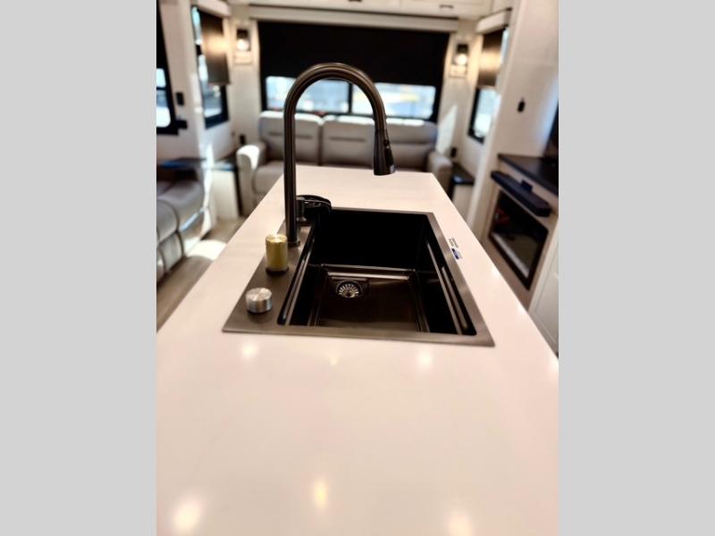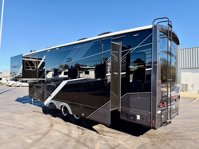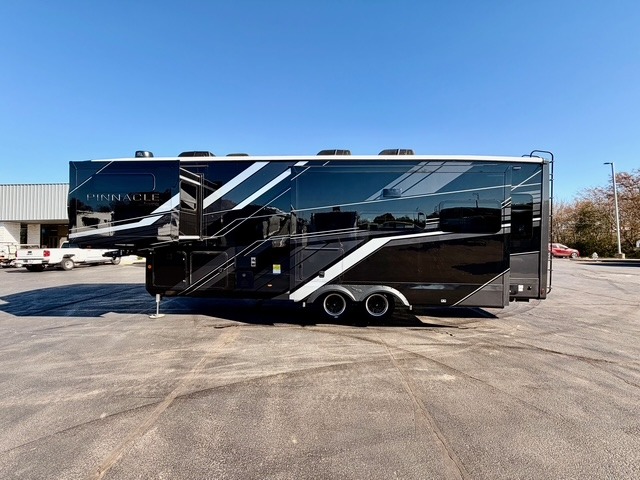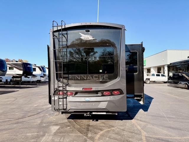 Each Pinnacle fifth wheel is constructed with Stronghold VBL™ lamination, providing the lightest yet strongest walls in the RV industry. This is paired with the Magnum Truss XL6™ roof system and Climate Shield zero-degree tested weather protection, ensuring durability for all seasons. The 5-Star Handling Package, along with dual Whisper Quiet A/C units, provides smooth towing and reliable comfort. Other premium features include a residential “Do It All” sink with pull-out faucet and vegetable rinse, handcrafted hardwood glazed cabinetry, vinyl flooring throughout, a central vacuum system, wireless remote control system, multiple USB ports, and many more thoughtful touches to make each trip comfortable, convenient, and enjoyable for the whole family.