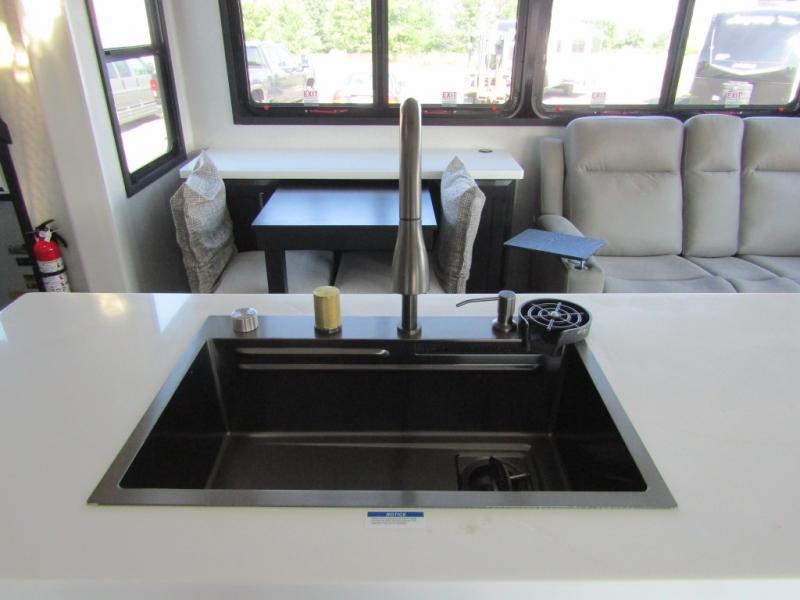 Each Pinnacle fifth wheel features Stronghold VBL lamination for the lightest, yet strongest construction in the RV industry. Add that to the Magnum Truss XL6 roof system and Climate Shield zero-degree tested weather protection and you'll be enjoying your fifth wheel for years to come. Some of the exterior conveniences you will appreciate are the Keyed-Alike lock system, the fully enclosed, universal docking center, and the 6-point hydraulic auto-leveling system for quick and easy set up. The 5 Star Handling Package will make towing a fifth wheel a walk in the park, and the two Whisper Quiet A/C units will keep you comfortable during the hot summer months. Inside, you'll enjoy the residential "Do it all" sink with pull-out kitchen faucet, glass rinse, and vegetable rinse, the handcrafted hardwood glazed cabinetry, the vinyl flooring throughout, plus many more comforts. There is even a central vacuum system, a wireless remote control system, USB ports throughout, plus many more conveniences to make each trip enjoyable.