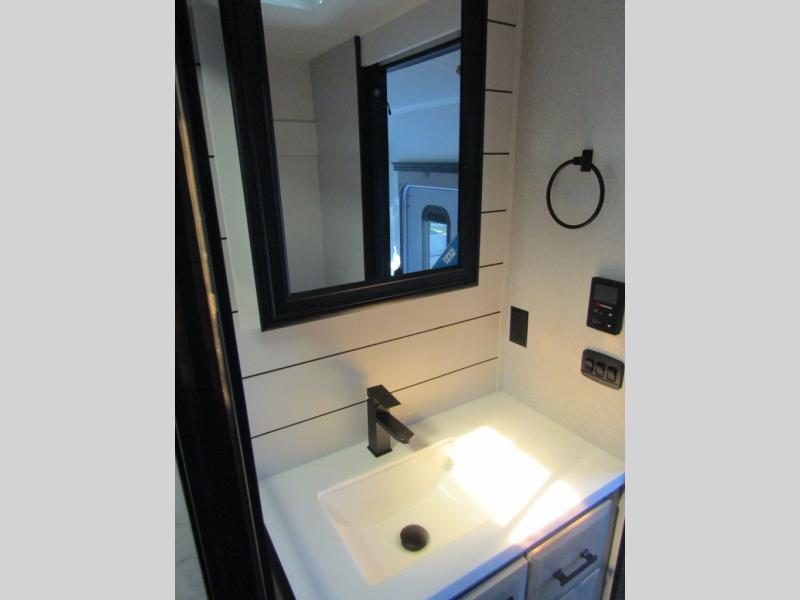 Trips to the lake are made comfortable in this triple slide out fifth wheel. Once you arrive at the campground, set up the two power awnings with LED lights, and there is an exterior TV for the big game. Head inside to relax on the theater seats directly across from the TV and fireplace, or play a game at the roll-top dinette. The chef of your group will love this kitchen with its residential refrigerator, kitchen island, and pantry, plus additional storage for canned goods or paper products. The full bath will allow you to stay clean throughout your trip, and you'll find a residential style backsplash in the bath, plus a walk-in shower. Nothing says luxury like your own king bed slide out in the front bedroom, a large front closet with hamper and drawers for wrinkle-free clothes, and a flip-up dresser featuring a 32" TV!