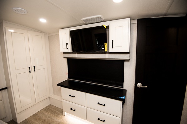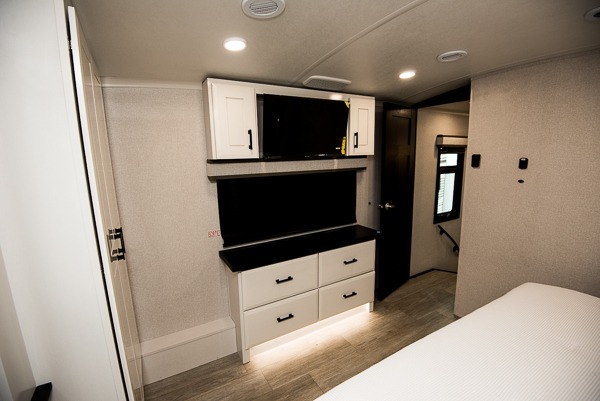 Trips to the lake are made comfortable in this triple slide out fifth wheel. Once you arrive at the campground, set up the two power awnings with LED lights, and there is an exterior TV for the big game. Head inside to relax on the theater seats directly across from the TV and fireplace, or play a game at the roll-top dinette. The chef of your group will love this kitchen with its residential refrigerator, kitchen island, and pantry, plus additional storage for canned goods or paper products. The full bath will allow you to stay clean throughout your trip, and you'll find a residential style backsplash in the bath, plus a walk-in shower. Nothing says luxury like your own king bed slide out in the front bedroom, a large front closet with hamper and drawers for wrinkle-free clothes, and a flip-up dresser featuring a 32" TV!