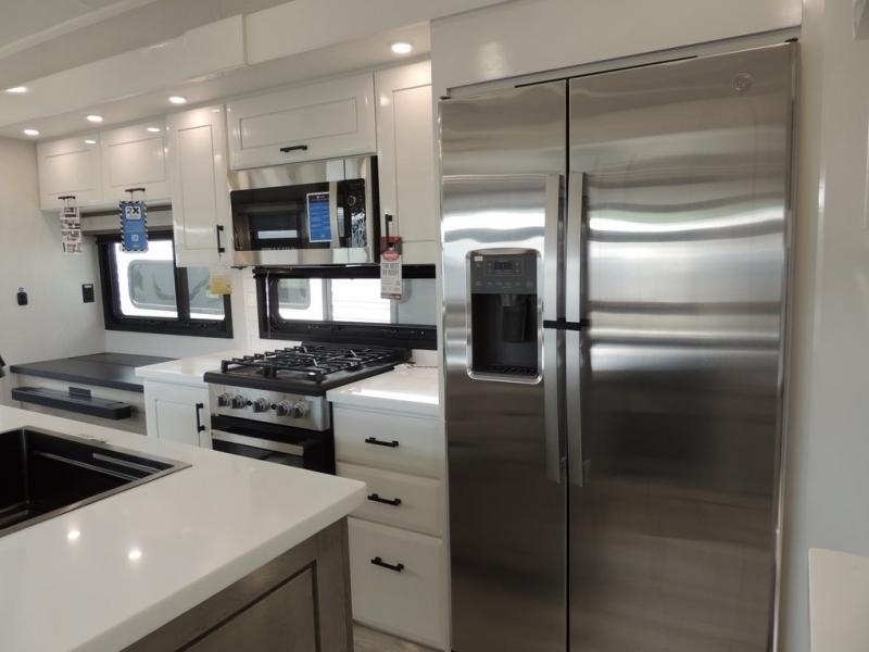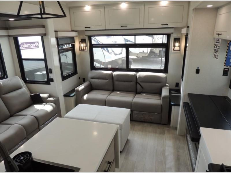 Trips to the lake are made comfortable in this triple slide out fifth wheel. Once you arrive at the campground, set up the two power awnings with LED lights, and there is an exterior TV for the big game. Head inside to relax on the theater seats directly across from the TV and fireplace, or play a game at the roll-top dinette. The chef of your group will love this kitchen with its residential refrigerator, kitchen island, and pantry, plus additional storage for canned goods or paper products. The full bath will allow you to stay clean throughout your trip, and you'll find a residential style backsplash in the bath, plus a walk-in shower. Nothing says luxury like your own king bed slide out in the front bedroom, a large front closet with hamper and drawers for wrinkle-free clothes, and a flip-up dresser featuring a 32" TV!