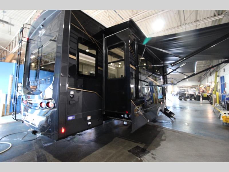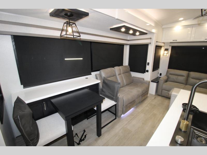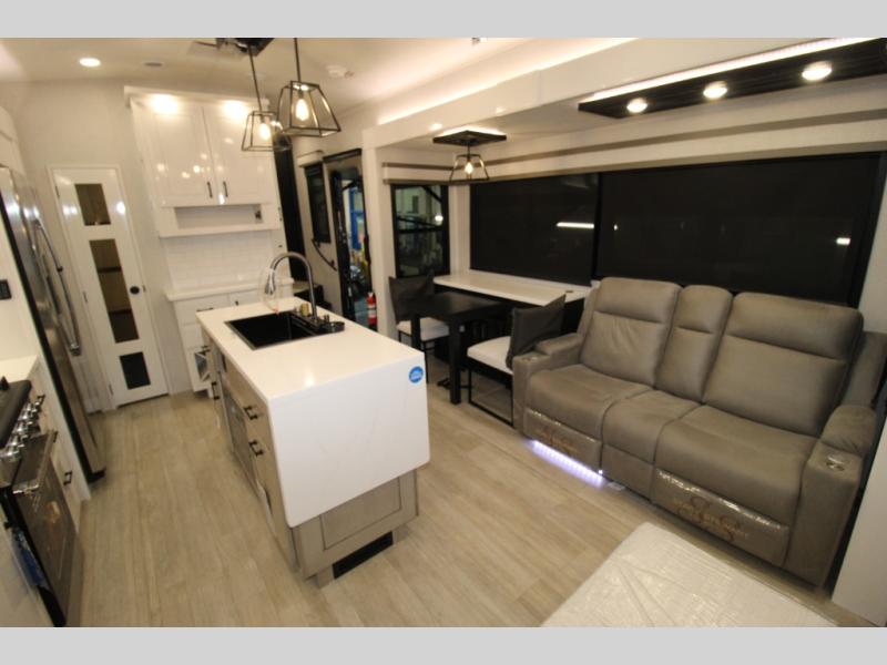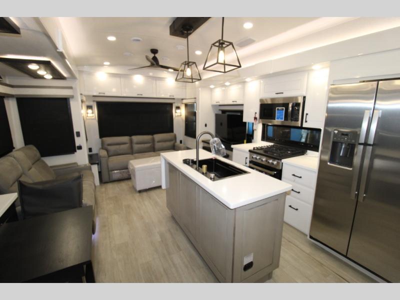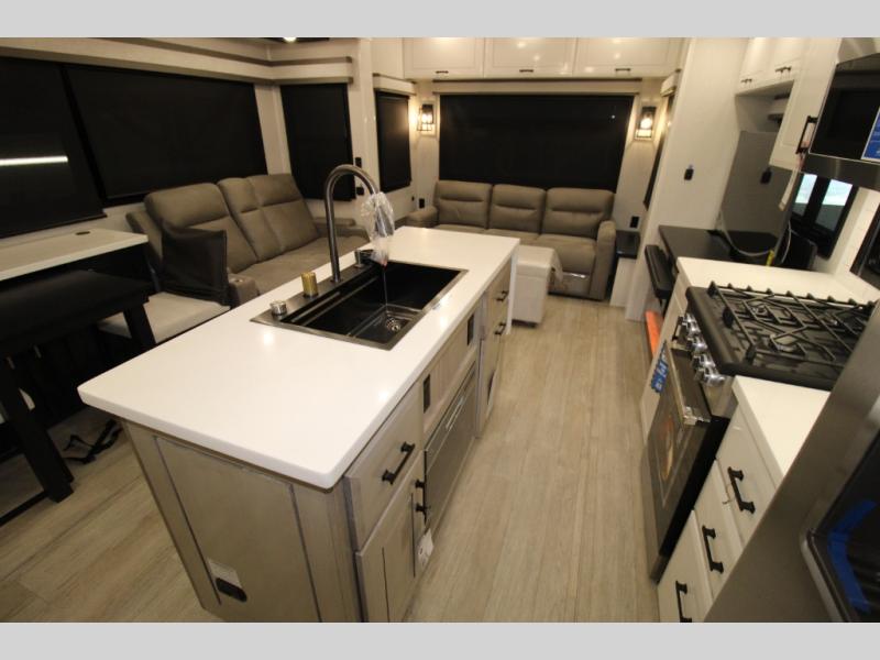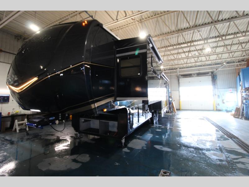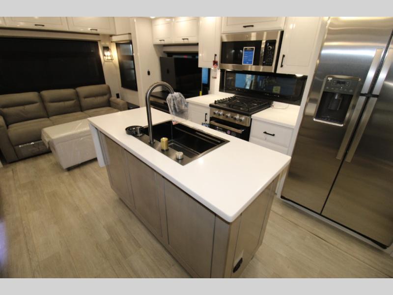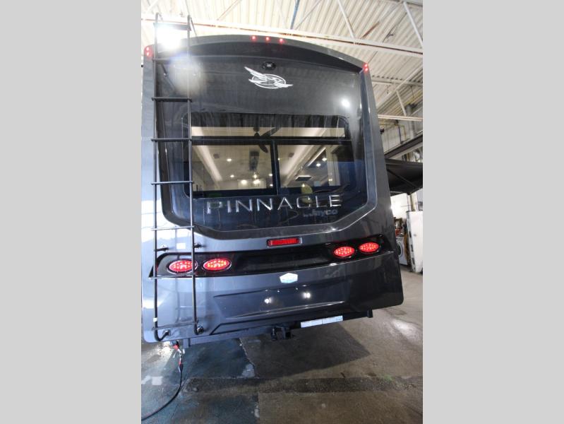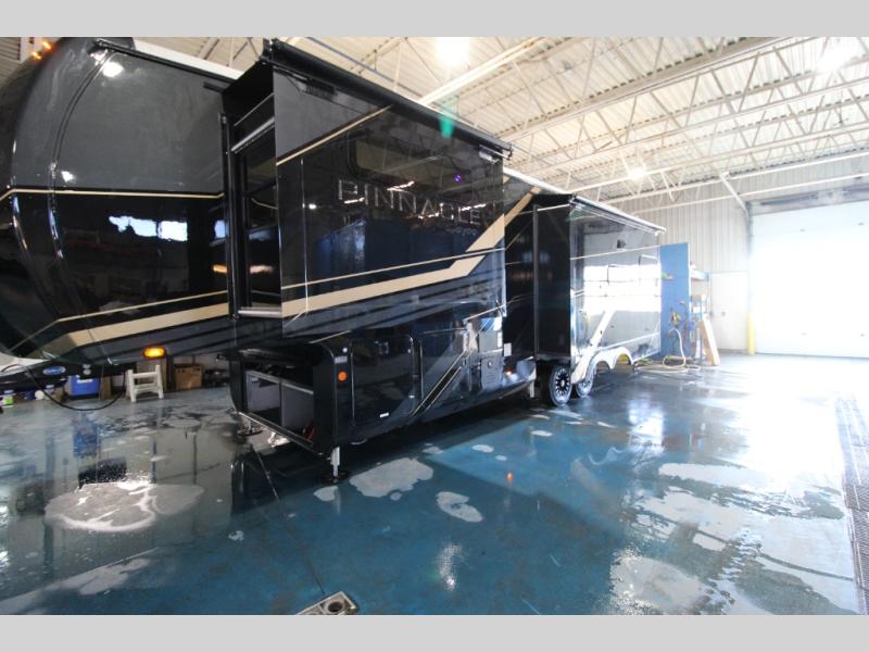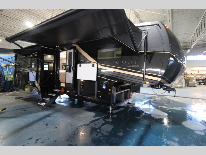 Each Pinnacle fifth wheel features Stronghold VBL lamination for the lightest, yet strongest construction in the RV industry. Add that to the Magnum Truss XL6 roof system and Climate Shield zero-degree tested weather protection and you'll be enjoying your fifth wheel even in harsh weather. Some of the exterior conveniences you will appreciate are the Keyed-Alike lock system, the fully enclosed, universal docking center, and the 6-point hydraulic auto-leveling system for quick and easy set up. The 5 Star Handling Package will make towing a fifth wheel a walk in the park, and the two Whisper Quiet A/C units will keep you comfortable during the hot summer months. Inside, you'll enjoy the residential "Do it all" sink, the solid hardwood cabinet doors, stiles, and fascia, the vinyl flooring throughout, plus many more comforts. There is even a central vacuum system, a wireless remote-control system, 12V charging station, plus many more conveniences to make each trip enjoyable.