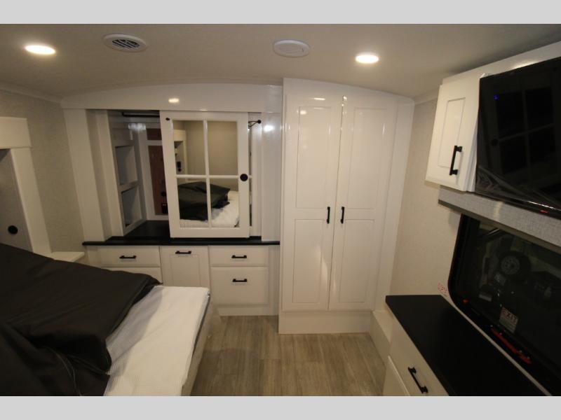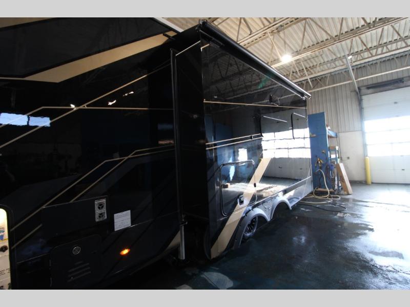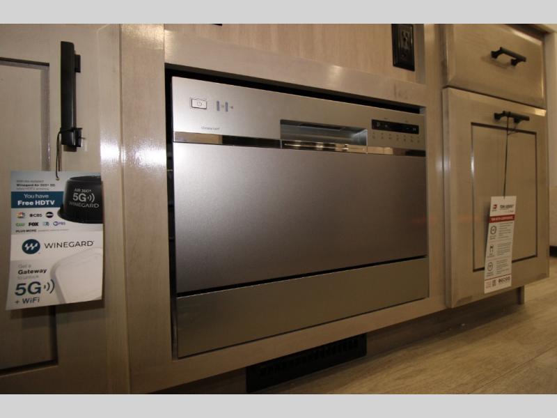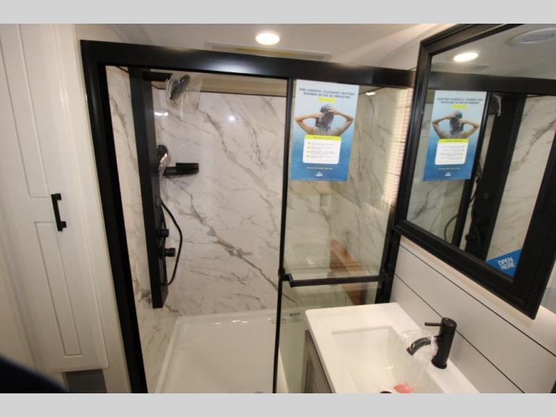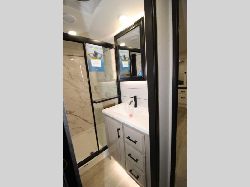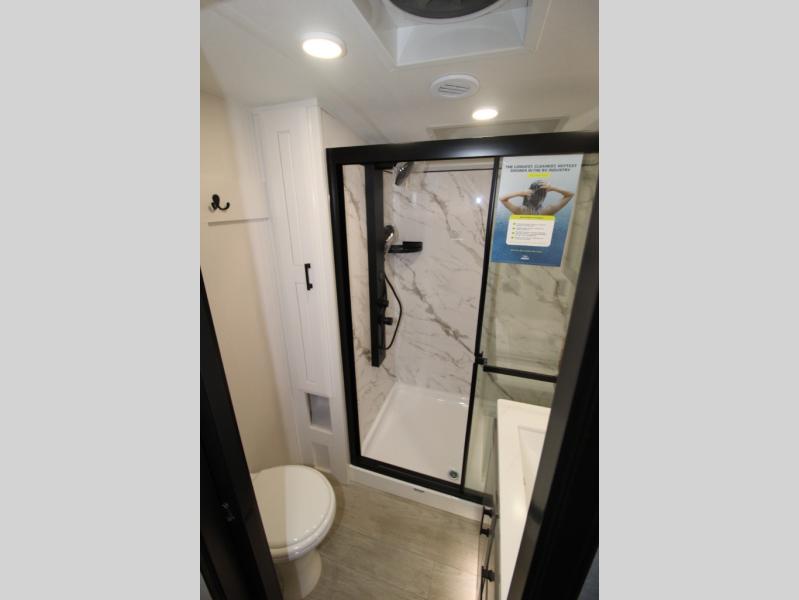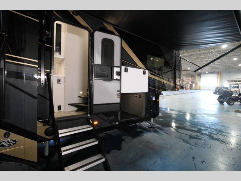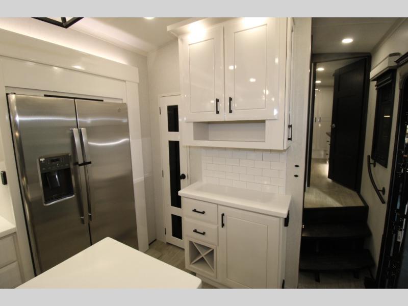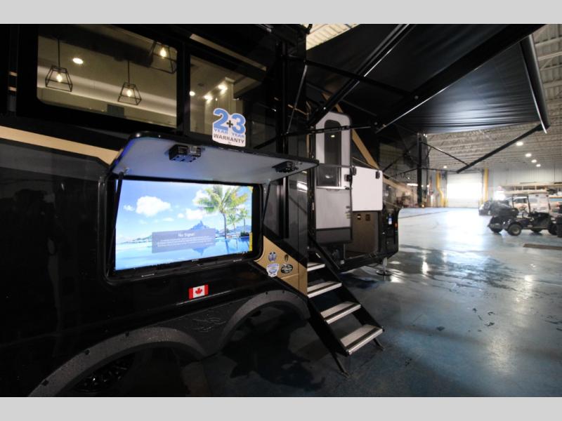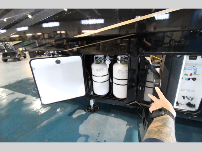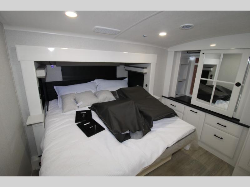 Each Pinnacle fifth wheel features Stronghold VBL lamination for the lightest, yet strongest construction in the RV industry. Add that to the Magnum Truss XL6 roof system and Climate Shield zero-degree tested weather protection and you'll be enjoying your fifth wheel even in harsh weather. Some of the exterior conveniences you will appreciate are the Keyed-Alike lock system, the fully enclosed, universal docking center, and the 6-point hydraulic auto-leveling system for quick and easy set up. The 5 Star Handling Package will make towing a fifth wheel a walk in the park, and the two Whisper Quiet A/C units will keep you comfortable during the hot summer months. Inside, you'll enjoy the residential "Do it all" sink, the solid hardwood cabinet doors, stiles, and fascia, the vinyl flooring throughout, plus many more comforts. There is even a central vacuum system, a wireless remote-control system, 12V charging station, plus many more conveniences to make each trip enjoyable.