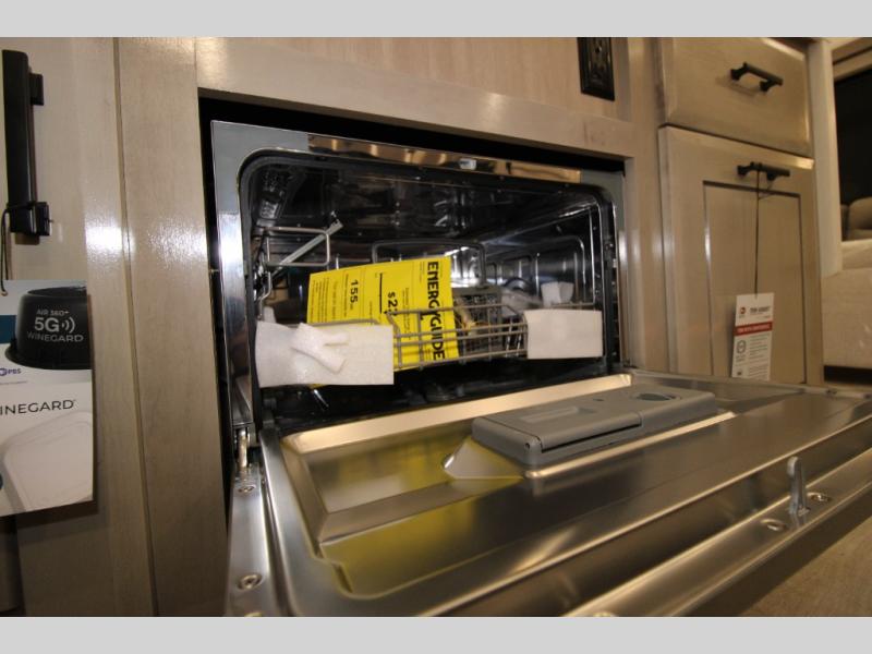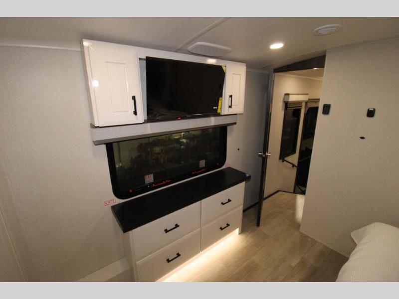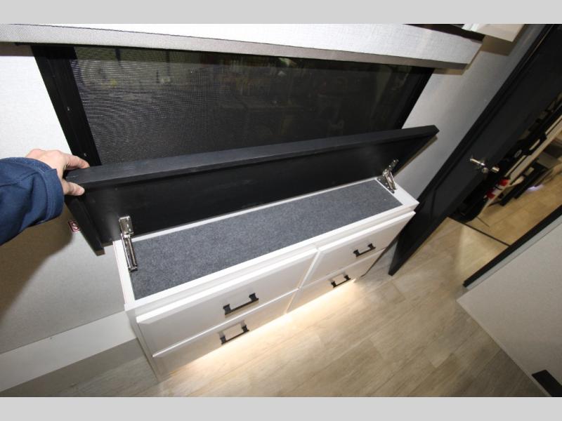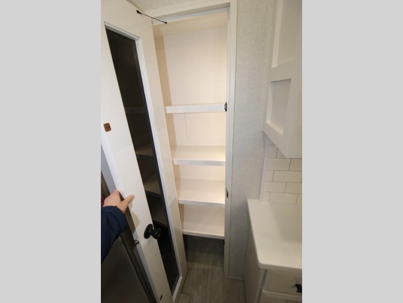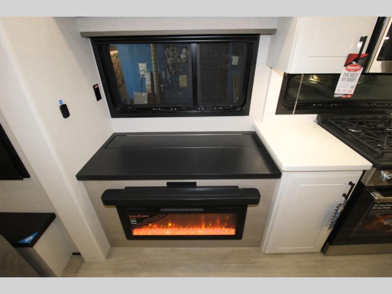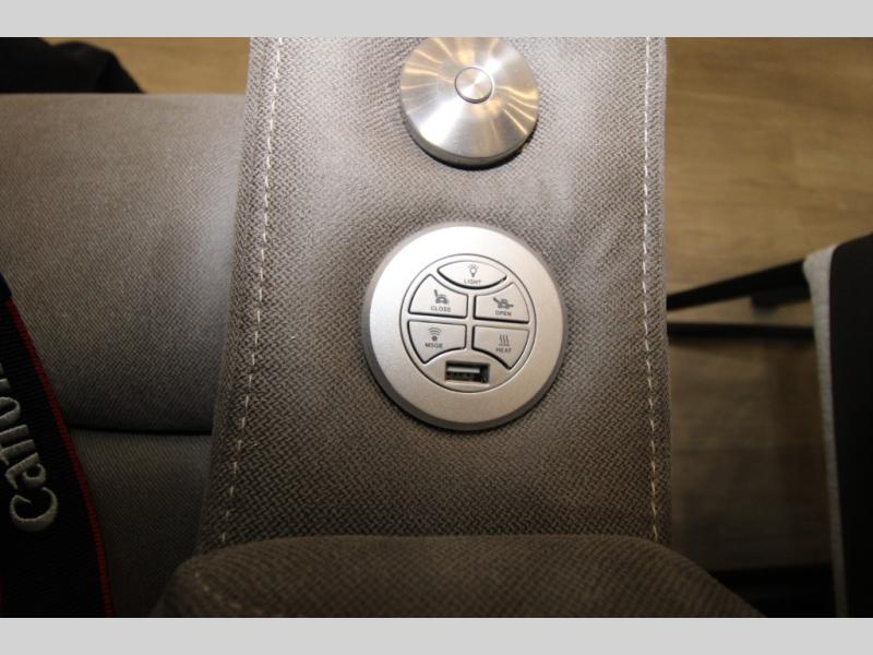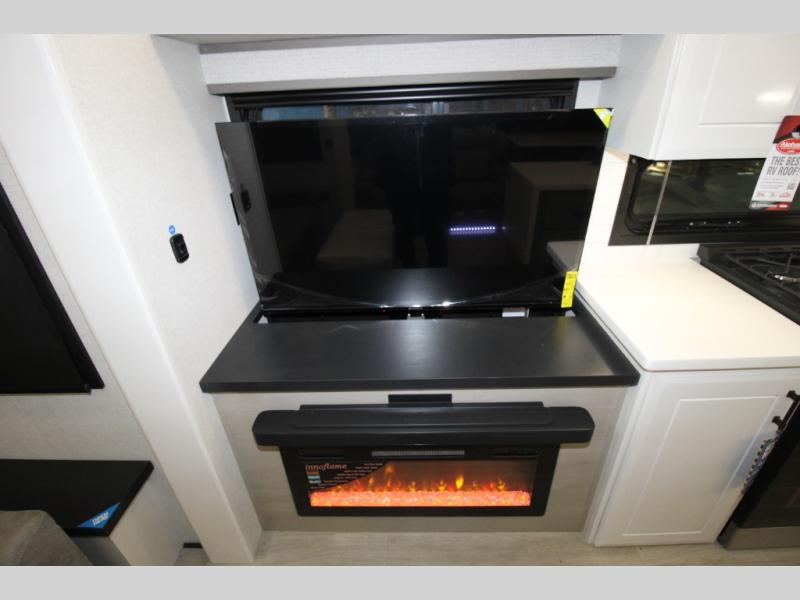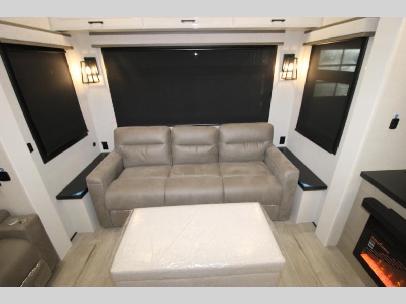 Trips to the lake are made comfortable in this triple slide out fifth wheel. Once you arrive at the campground, set up the two power awnings with LED lights, and there is an exterior TV for the big game. Head inside to relax on the theater seats directly across from the TV and fireplace or play a game at the roll-top dinette. The chef of your group will love this kitchen with its residential refrigerator, kitchen island, and pantry, plus additional storage for canned goods or paper products. The full bath will allow you to stay clean throughout your trip, you'll find a walk-in shower with teak seat, linen shelves above the bath and a medicine cabinet. Nothing says luxury like your own king bed slide out in the front bedroom, a large front closet with hamper and drawers for wrinkle-free clothes, and a flip-up dresser featuring a 32" TV!