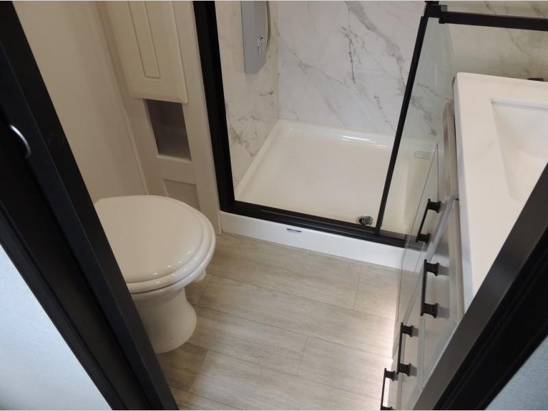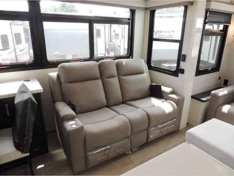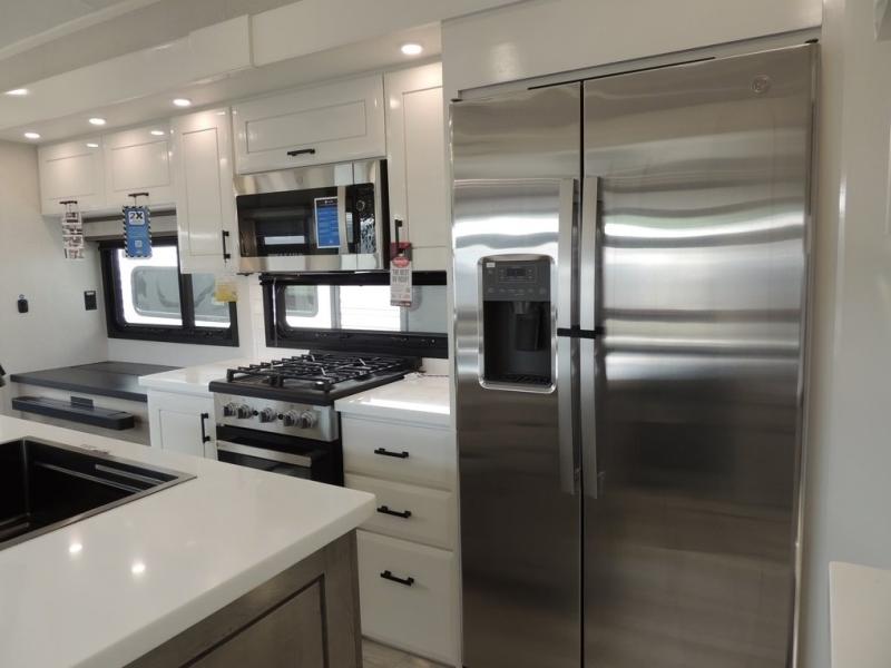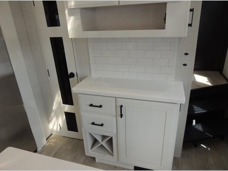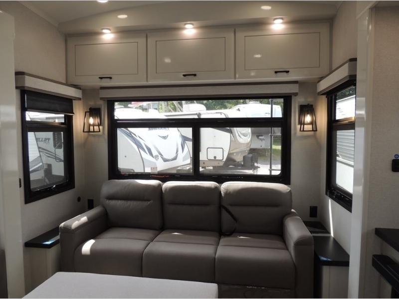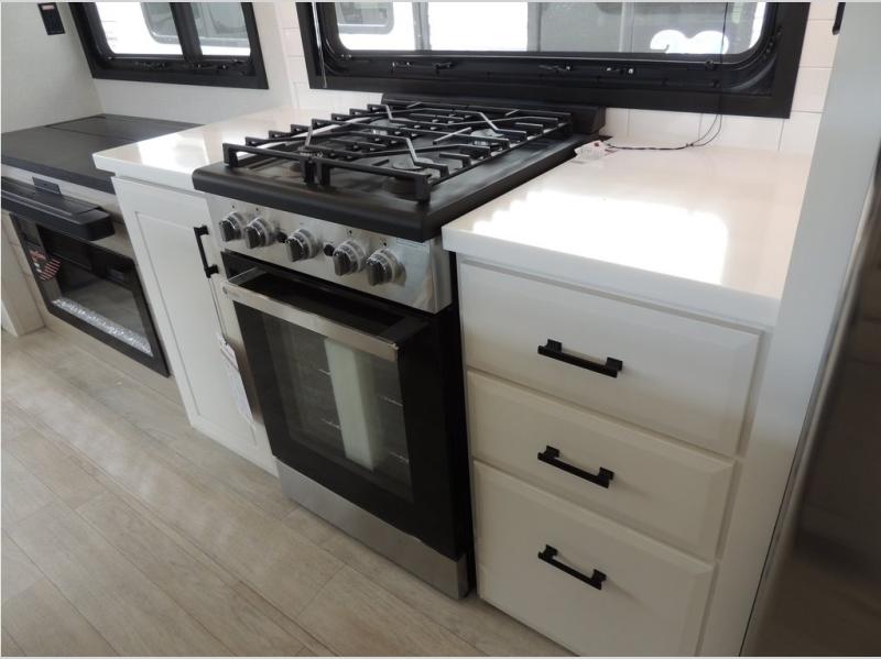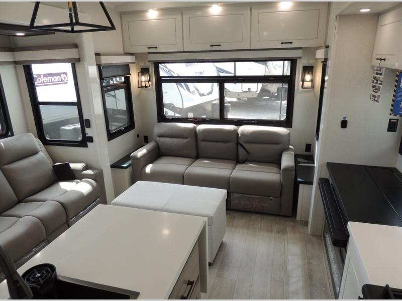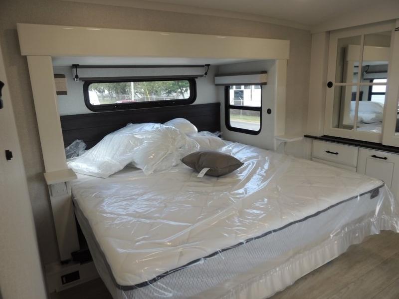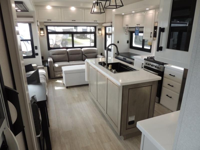 Each Pinnacle fifth wheel features Stronghold VBL lamination for the lightest, yet strongest construction in the RV industry. Add that to the Magnum Truss XL6 roof system and Climate Shield zero-degree tested weather protection and you'll be enjoying your fifth wheel even in harsh weather. Some of the exterior conveniences you will appreciate are the Keyed-Alike lock system, the fully enclosed, universal docking center, and the 6-point hydraulic auto-leveling system for quick and easy set up. The 5 Star Handling Package will make towing a fifth wheel a walk in the park, and the two Whisper Quiet A/C units will keep you comfortable during the hot summer months. Inside, you'll enjoy the residential "Do it all" sink, the solid hardwood cabinet doors, stiles, and fascia, the vinyl flooring throughout, plus many more comforts. There is even a central vacuum system, a wireless remote-control system, 12V charging station, plus many more conveniences to make each trip enjoyable.
