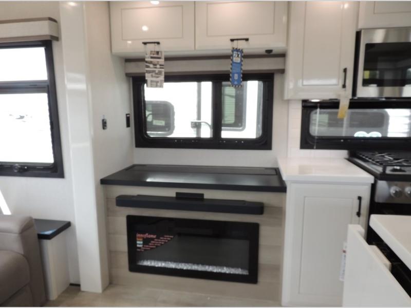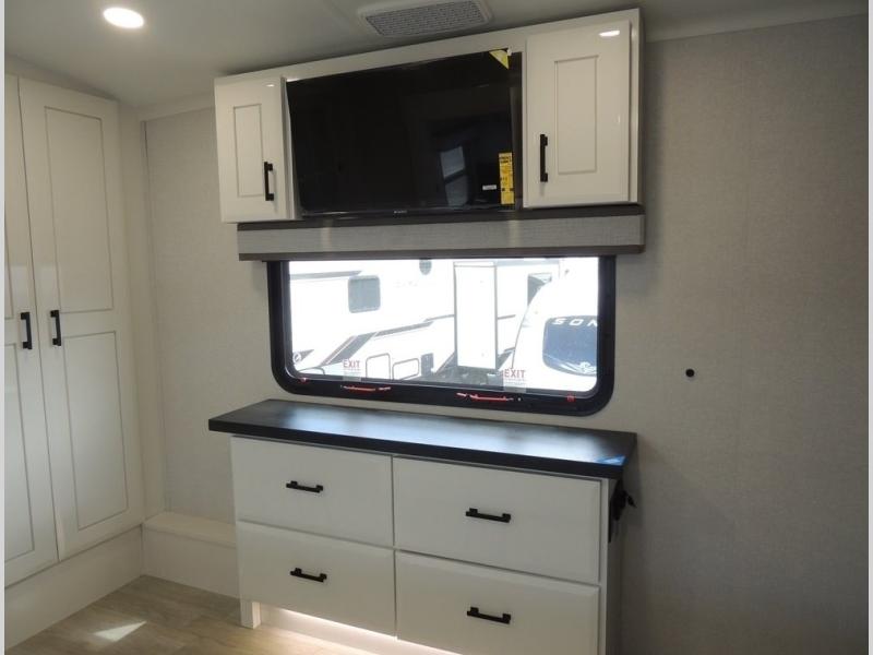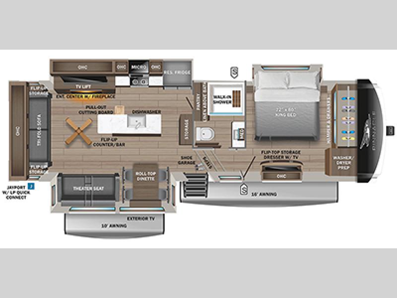 Trips to the lake are made comfortable in this triple slide out fifth wheel. Once you arrive at the campground, set up the two power awnings with LED lights, and there is an exterior TV for the big game. Head inside to relax on the theater seats directly across from the TV and fireplace or play a game at the roll-top dinette. The chef of your group will love this kitchen with its residential refrigerator, kitchen island, and pantry, plus additional storage for canned goods or paper products. The full bath will allow you to stay clean throughout your trip, you'll find a walk-in shower with teak seat, linen shelves above the bath and a medicine cabinet. Nothing says luxury like your own king bed slide out in the front bedroom, a large front closet with hamper and drawers for wrinkle-free clothes, and a flip-up dresser featuring a 32" TV!