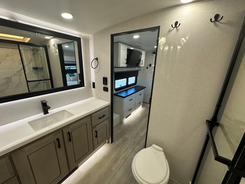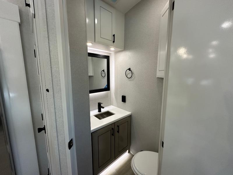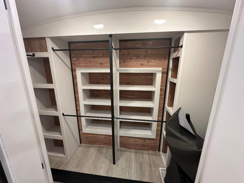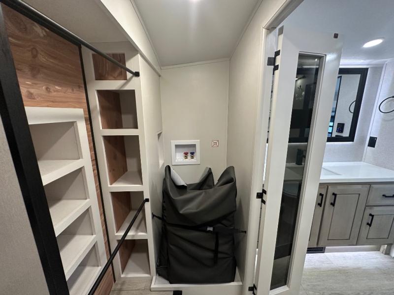 You can enjoy luxury and comfort in this fifth wheel that sleeps four with ease. The dual opposing slides in the main living area create an open and spacious environment, featuring a kitchen island with a pull-out extension for extra prep space, perfect for cooking or serving meals. The convenient half bath is located just off the kitchen, ideal for quick restroom breaks, while a shoe garage and wardrobe near the entry help keep your RV tidy and organized. The living area also includes theater seating and an entertainment center with a fireplace, providing a cozy spot for family movie nights or relaxing evenings.